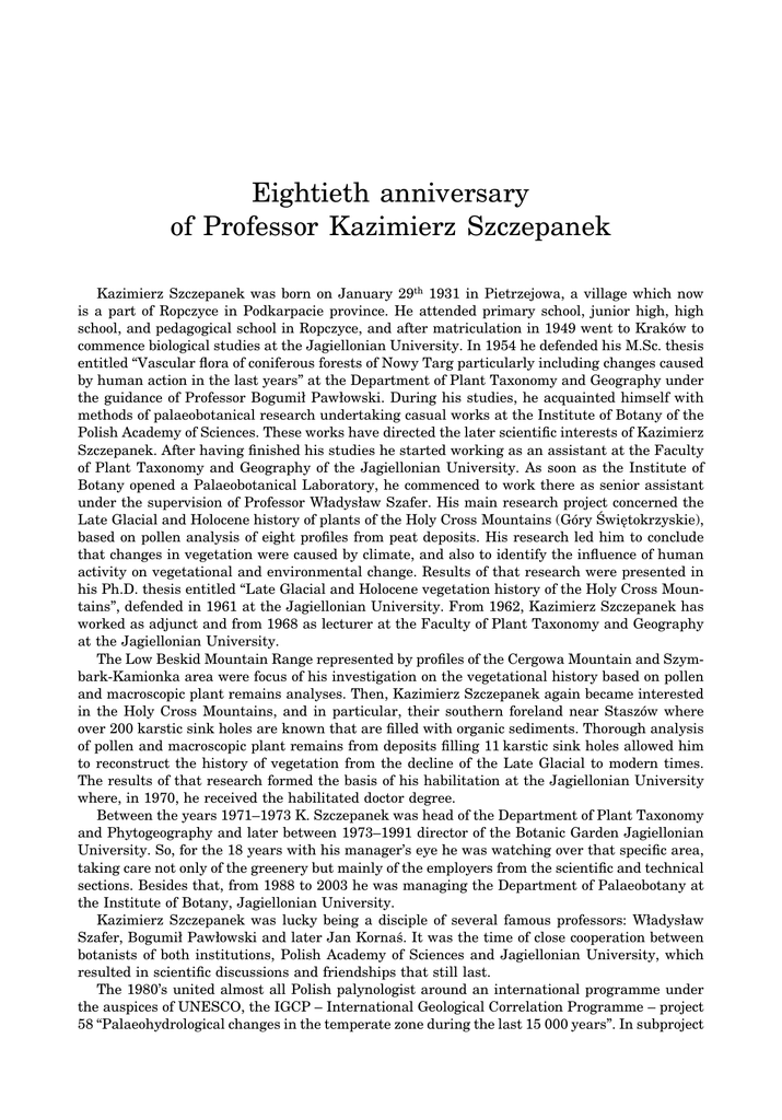 Eightieth anniversary of Professor Kazimierz Szczepanek Kazimierz Szczepanek was born on January 29th 1931 in Pietrzejowa, a village which now is a part of Ropczyce in Podkarpacie province. He attended primary school, junior high, high school, and pedagogical school in Ropczyce, and after matriculation in 1949 went to Kraków to commence biological studies at the Jagiellonian University. In 1954 he defended his M.Sc. thesis entitled “Vascular flora of coniferous forests of Nowy Targ particularly including changes caused by human action in the last years” at the Department of Plant Taxonomy and Geography under the guidance of Professor Bogumił Pawłowski. During his studies, he acquainted himself with methods of palaeobotanical research undertaking casual works at the Institute of Botany of the Polish Academy of Sciences. These works have directed the later scientific interests of Kazimierz Szczepanek. After having finished his studies he started working as an assistant at the Faculty of Plant Taxonomy and Geography of the Jagiellonian University. As soon as the Institute of Botany opened a Palaeobotanical Laboratory, he commenced to work there as senior assistant under the supervision of Professor Władysław Szafer. His main research project concerned the Late Glacial and Holocene history of plants of the Holy Cross Mountains (Góry Świętokrzyskie), based on pollen analysis of eight profiles from peat deposits. His research led him to conclude that changes in vegetation were caused by climate, and also to identify the influence of human activity on vegetational and environmental change. Results of that research were presented in his Ph.D. thesis entitled “Late Glacial and Holocene vegetation history of the Holy Cross Mountains”, defended in 1961 at the Jagiellonian University. From 1962, Kazimierz Szczepanek has worked as adjunct and from 1968 as lecturer at the Faculty of Plant Taxonomy and Geography at the Jagiellonian University. The Low Beskid Mountain Range represented by profiles of the Cergowa Mountain and Szymbark-Kamionka area were focus of his investigation on the vegetational history based on pollen and macroscopic plant remains analyses. Then, Kazimierz Szczepanek again became interested in the Holy Cross Mountains, and in particular, their southern foreland near Staszów where over 200 karstic sink holes are known that are filled with organic sediments. Thorough analysis of pollen and macroscopic plant remains from deposits filling 11 karstic sink holes allowed him to reconstruct the history of vegetation from the decline of the Late Glacial to modern times. The results of that research formed the basis of his habilitation at the Jagiellonian University where, in 1970, he received the habilitated doctor degree. Between the years 1971–1973 K. Szczepanek was head of the Department of Plant Taxonomy and Phytogeography and later between 1973–1991 director of the Botanic Garden Jagiellonian University. So, for the 18 years with his manager’s eye he was watching over that specific area, taking care not only of the greenery but mainly of the employers from the scientific and technical sections. Besides that, from 1988 to 2003 he was managing the Department of Palaeobotany at the Institute of Botany, Jagiellonian University. Kazimierz Szczepanek was lucky being a disciple of several famous professors: Władysław Szafer, Bogumił Pawłowski and later Jan Kornaś. It was the time of close cooperation between botanists of both institutions, Polish Academy of Sciences and Jagiellonian University, which resulted in scientific discussions and friendships that still last. The 1980’s united almost all Polish palynologist around an international programme under the auspices of UNESCO, the IGCP – International Geological Correlation Programme – project 58 “Palaeohydrological changes in the temperate zone during the last 15 000 years”. In subproject 82 A “Lake and mire environments”, Kazimierz Szczepanek examined biogenic deposits from Drogomyśl site in the valley of lower Vistula (Niedziałkowska et al. 1985). In subproject B, he continued his palaeoecological studies in the region of the Holy Cross Mountains (Szczepanek 1982) and the Low Beskid Mountain Range (Szczepanek 1987). The results of these studies were included in a synthetic elaboration for Poland and Europe, published by M. Ralska-Jasiewiczowa and M. Latałowa in 1996 in a book edited by B.E. Berglund, H.J.B. Birks, M. Ralska-Jasiewiczowa, and H.E. Wright (“Palaeocological events during the last 15 000 years”, J. Wiley and Sons, Chichester – New York). The palynological data were submitted to the European database in Arls, from which they are available for further studies. They were used for instance in publications: “The spread of deciduous Quercus throughout Europe since the last glacial period” (Forest Ecology and Management 156: 27–48) and “The temperature of Europe during the Holocene reconstructed from pollen data (Quaternary Science Reviews 22: 1701–1716). Kazimierz Szczepanek was also a co-author of the chapters describing the spread of Alnus, Abies alba, Picea abies, and Pinus cembra in the synthesis “Late Glacial and Holocene history of vegetation in Poland based in isopollen maps” edited by M. Ralska-Jasiewiczowa et al. (2004). Apart from palynological investigations of the Holocene profiles, Kazimierz Szczepanek also examined Pleistocene micro- and macrofloras. In 1960s he investigated the Dryas flora from Makoszyn near Sandomierz. Later he studied Eemian interglacial deposits at Nidzica near Olsztyn, Ustroń and in the Vistula valley near Tarnobrzeg. On the Sandomierz Upland he examined a new flora of the Mazovian Interglacial (Kosmowska-Suffczyńska & Szczepanek 1981). Aeropalynology, a new scientific interest of Kazimierz Szczepanek was his answer for allergologists’s needs. As always he committed to that affair with all his heart. As a head of a project “The