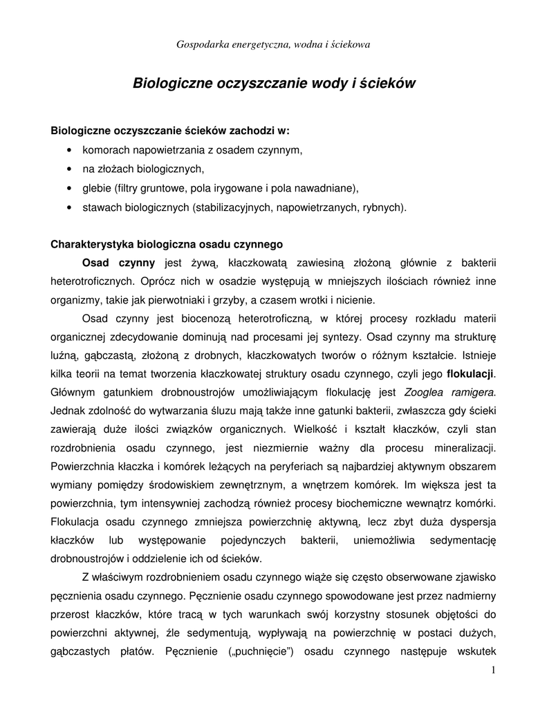 Gospodarka energetyczna, wodna i ściekowa Biologiczne oczyszczanie wody i ścieków Biologiczne oczyszczanie ścieków zachodzi w: • komorach napowietrzania z osadem czynnym, • na złożach biologicznych, • glebie (filtry gruntowe, pola irygowane i pola nawadniane), • stawach biologicznych (stabilizacyjnych, napowietrzanych, rybnych). Charakterystyka biologiczna osadu czynnego Osad czynny jest żywą, kłaczkowatą zawiesiną złożoną głównie z bakterii heterotroficznych. Oprócz nich w osadzie występują w mniejszych ilościach również inne organizmy, takie jak pierwotniaki i grzyby, a czasem wrotki i nicienie. Osad czynny jest biocenozą heterotroficzną, w której procesy rozkładu materii organicznej zdecydowanie dominują nad procesami jej syntezy. Osad czynny ma strukturę luźną, gąbczastą, złożoną z drobnych, kłaczkowatych tworów o różnym kształcie. Istnieje kilka teorii na temat tworzenia kłaczkowatej struktury osadu czynnego, czyli jego flokulacji. Głównym gatunkiem drobnoustrojów umożliwiającym flokulację jest Zooglea ramigera. Jednak zdolność do wytwarzania śluzu mają także inne gatunki bakterii, zwłaszcza gdy ścieki zawierają duże ilości związków organicznych. Wielkość i kształt kłaczków, czyli stan rozdrobnienia osadu czynnego, jest niezmiernie ważny dla procesu mineralizacji. Powierzchnia kłaczka i komórek leżących na peryferiach są najbardziej aktywnym obszarem wymiany pomiędzy środowiskiem zewnętrznym, a wnętrzem komórek. Im większa jest ta powierzchnia, tym intensywniej zachodzą również procesy biochemiczne wewnątrz komórki. Flokulacja osadu czynnego zmniejsza powierzchnię aktywną, lecz zbyt duża dyspersja kłaczków lub występowanie pojedynczych bakterii, uniemożliwia sedymentację drobnoustrojów i oddzielenie ich od ścieków. Z właściwym rozdrobnieniem osadu czynnego wiąże się często obserwowane zjawisko pęcznienia osadu czynnego. Pęcznienie osadu czynnego spowodowane jest przez nadmierny przerost kłaczków, które tracą w tych warunkach swój korzystny stosunek objętości do powierzchni aktywnej, źle sedymentują, wypływają na powierzchnię w postaci dużych, gąbczastych płatów. Pęcznienie („puchnięcie”) osadu czynnego następuje wskutek 1 masowego rozwoju bakterii nitkowatych. Najczęściej zjawisko to wywołuje nadmierny rozwój Sphaerotilus natans, rzadziej Beggiatoa lub Thiothrix. Skład gatunkowy mikroflory w osadzie czynnym jest bardzo zróżnicowany, podlega stałym zmianom i zależy głównie od składu chemicznego ścieków. Osad czynny oczyszczający ścieki bytowo-gospodarcze jest bardziej zróżnicowany pod względem jakościowym niż osad, do którego dozowane są ścieki przemysłowe. Bakterie heterotroficzne stanowią główne część organizmów występujących w osadzie czynnym. Ich funkcja polega na enzymatycznym rozkładzie związków organicznych. Im większe zróżnicowanie tych drobnoustrojów, tym szersze możliwości enzymatyczne pozwalające na rozkład bardzo różnych substratów. W tej grupie drobnoustrojów następuje też najczęściej adaptacja enzymatyczna umożliwiająca metabolizm związków trudno podatnych na rozkład, zwłaszcza syntetycznych. Najczęściej spotykanymi gatunkami są Zooglea ramigera, Pseudomonas fluorescens, Pseudomonas putida oraz bakterie z rodzaju Achromobacter, Bacillus, Flavobacterium. Ścieki zawierające duże ilości białek lub produktów ich hydrolizy, zapewniają w osadzie czynnym dominację bakteriom z rodzaju Alcaligenes, Flavobacterium i Bacillus, natomiast ścieki obfitujące w węglowodany lub węglowodory umożliwiają szybki rozwój Pseudomonas. W osadzie czynnym mogą również występować bakterie chemosyntetyzujące z rodzaju Nitrosomonas i Nitrobacter (bakterie nitryfikacyjne) oraz bakterie siarkowe z rodzaju Thiothrix i Beggiatoa. Grzyby są stosunkowo rzadko spotykane w osadzie czynnym. Rozwijają się w osadzie w warunkach niedostatecznego natlenienia, niskiego pH i nadmiaru węglowodorów. Przypisuje się im – podobnie jak bakteriom nitkowatym – wywoływanie zjawiska pęcznienia osadu. Do pierwotniaków najczęściej występujących w osadzie czynnym należą Vorticella, Carchesium i Opercularia, które w sprzyjających warunkach rozwijają się bardzo intensywnie. Ich ilość dochodzi do około 11 000 komórek/ml zawartości komory napowietrzania. Bardzo często występują również Cochliopodium (ameba), Anthophysa vegetans (wiciowiec) oraz orzęski Trachelophyllum pulsillum, Litonotus, Trochilia minor, Oxytricha pellionella, Stylonychia mytilus. Między liczebnością wiciowców i orzęsków w osadzie czynnym istnieje odwrotna proporcjonalność. Podczas, gdy duża liczba wiciowców z rodzaju Bodo, Hexamitus, Trepomonas i Trigonomonas, wskazuje na przeciążenie osadu czynnego związkami organicznymi i złą pracą osadu, orzęski – zwłaszcza Vorticella i Aspidisia costata – wskazują, że osad pracuje prawidłowo. Wiele gatunków orzęsków uznano za wskaźniki informujące o 2 efektach oczyszczania ścieków oraz obecności związków toksycznych (są one o wiele bardziej wrażliwe na trucizny niż bakterie). Rola pierwotniaków w osadzie czynnym: • uczestniczą one w procesie bioflokulacji, • są wskaźnikami jakości pracy osadu czynnego, jego natlenienia i obciążenia związkami organicznymi, • niektóre gatunki, zwłaszcza holozoiczne, aktywnie uczestniczą w usuwaniu zanieczyszczeń ze ścieków, • odżywiają się komórkami bakteryjnymi odmładzając i uaktywniając populację tych drobnoustrojów, • klarują odpływ ścieków przez pożeranie wolno pływających bakterii. W osadzi czynnym mogą pojawiać się też masowo wrotki i nicienie. Wrotki są wskaźnikami dobrze pracującego osadu, lecz ich nadmierny rozwój, podobnie jak nicieni, może stać się przyczyną niekorzystnego ubytku biomasy osadu czynnego, który zwierzęta te pożerają w dużych ilo