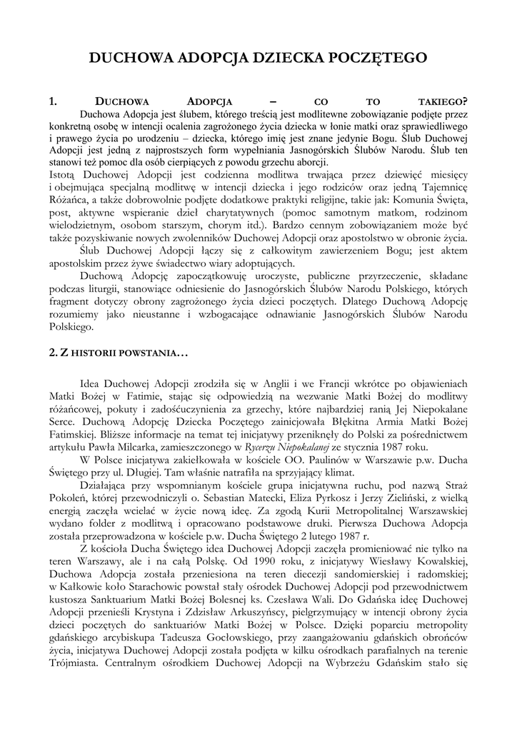 DUCHOWA ADOPCJA DZIECKA POCZĘTEGO 1. DUCHOWA ADOPCJA – CO TO TAKIEGO? Duchowa Adopcja jest ślubem, którego treścią jest modlitewne zobowiązanie podjęte przez konkretną osobę w intencji ocalenia zagrożonego życia dziecka w łonie matki oraz sprawiedliwego i prawego życia po urodzeniu – dziecka, którego imię jest znane jedynie Bogu. Ślub Duchowej Adopcji jest jedną z najprostszych form wypełniania Jasnogórskich Ślubów Narodu. Ślub ten stanowi też pomoc dla osób cierpiących z powodu grzechu aborcji. Istotą Duchowej Adopcji jest codzienna modlitwa trwająca przez dziewięć miesięcy i obejmująca specjalną modlitwę w intencji dziecka i jego rodziców oraz jedną Tajemnicę Różańca, a także dobrowolnie podjęte dodatkowe praktyki religijne, takie jak: Komunia Święta, post, aktywne wspieranie dzieł charytatywnych (pomoc samotnym matkom, rodzinom wielodzietnym, osobom starszym, chorym itd.). Bardzo cennym zobowiązaniem może być także pozyskiwanie nowych zwolenników Duchowej Adopcji oraz apostolstwo w obronie życia. Ślub Duchowej Adopcji łączy się z całkowitym zawierzeniem Bogu; jest aktem apostolskim przez żywe świadectwo wiary adoptujących. Duchową Adopcję zapoczątkowuję uroczyste, publiczne przyrzeczenie, składane podczas liturgii, stanowiące odniesienie do Jasnogórskich Ślubów Narodu Polskiego, których fragment dotyczy obrony zagrożonego życia dzieci poczętych. Dlatego Duchową Adopcję rozumiemy jako nieustanne i wzbogacające odnawianie Jasnogórskich Ślubów Narodu Polskiego. 2. Z HISTORII POWSTANIA… Idea Duchowej Adopcji zrodziła się w Anglii i we Francji wkrótce po objawieniach Matki Bożej w Fatimie, stając się odpowiedzią na wezwanie Matki Bożej do modlitwy różańcowej, pokuty i zadośćuczynienia za grzechy, które najbardziej ranią Jej Niepokalane Serce. Duchową Adopcję Dziecka Poczętego zainicjowała Błękitna Armia Matki Bożej Fatimskiej. Bliższe informacje na temat tej inicjatywy przeniknęły do Polski za pośrednictwem artykułu Pawła Milcarka, zamieszczonego w Rycerzu Niepokalanej ze stycznia 1987 roku. W Polsce inicjatywa zakiełkowała w kościele OO. Paulinów w Warszawie p.w. Ducha Świętego przy ul. Długiej. Tam właśnie natrafiła na sprzyjający klimat. Działająca przy wspomnianym kościele grupa inicjatywna ruchu, pod nazwą Straż Pokoleń, której przewodniczyli o. Sebastian Matecki, Eliza Pyrkosz i Jerzy Zieliński, z wielką energią zaczęła wcielać w życie nową ideę. Za zgodą Kurii Metropolitalnej Warszawskiej wydano folder z modlitwą i opracowano podstawowe druki. Pierwsza Duchowa Adopcja została przeprowadzona w kościele p.w. Ducha Świętego 2 lutego 1987 r. Z kościoła Ducha Świętego idea Duchowej Adopcji zaczęła promieniować nie tylko na teren Warszawy, ale i na całą Polskę. Od 1990 roku, z inicjatywy Wiesławy Kowalskiej, Duchowa Adopcja została przeniesiona na teren diecezji sandomierskiej i radomskiej; w Kałkowie koło Starachowic powstał stały ośrodek Duchowej Adopcji pod przewodnictwem kustosza Sanktuarium Matki Bożej Bolesnej ks. Czesława Wali. Do Gdańska ideę Duchowej Adopcji przenieśli Krystyna i Zdzisław Arkuszyńscy, pielgrzymujący w intencji obrony życia dzieci poczętych do sanktuariów Matki Bożej w Polsce. Dzięki poparciu metropolity gdańskiego arcybiskupa Tadeusza Gocłowskiego, przy zaangażowaniu gdańskich obrońców życia, inicjatywa Duchowej Adopcji została podjęta w kilku ośrodkach parafialnych na terenie Trójmiasta. Centralnym ośrodkiem Duchowej Adopcji na Wybrzeżu Gdańskim stało się Sanktuarium Matki Bożej Brzemiennej w Gdańsku-Matemblewie, pod przewodnictwem kustosza ks. prałata Kazimierza Krucza. 25 marca 1992 roku, w piątą rocznicę pierwszej Duchowej Adopcji uroczystą Mszę świętą odprawił biskup Zbigniew Kraszewski. W dniach 12-13 listopada 1993 roku, z inspiracji Krajowego Duszpasterza Rodzin ks. dra Kazimierza Kurka zorganizowano w Gdyni ogólnopolską sesję konsultacyjną dla diecezjalnych duszpasterstw rodzin z terenu Kraju na temat upowszechnienia idei Duchowej Adopcji. Owocem tego spotkania było przeszczepienie Duchowej Adopcji przez Teresę Wiszowatą na teren diecezji białostockiej, pobranie instrukcji i materiałów pomocniczych przez diecezjalne instruktorki poradnictwa rodzinnego z licznych diecezji oraz ożywiona korespondencja na temat upowszechniania Duchowej Adopcji, napływającą z terenu całego kraju. Na początku 1994 roku powołano do życia ogólnopolski Ruch Krzewienia Duchowej Adopcji, pod patronatem Przeora Jasnej Góry. Ruch ten zyskuje licznych liderów terenowych – krzewicieli tej idei. W jego ramach wysyła się materiały szkoleniowe oraz prowadzi się prelekcje dla nowo powstających ośrodków. W dniach 25 i 26 marca 1994 roku na Jasnej Górze w Częstochowie odbyła się promocja Duchowej Adopcji i pierwsze przyrzeczenia przed Cudownym Obrazem Matki Bożej Królowej Polski. Na Jasnej Górze powołano Centralny Ośrodek Duchowej Adopcji, w którym przeprowadzane będą przyrzeczenia pątników, przybywających tam w licznych pielgrzymkach z terenu całej Polski i ze świata. Zaczątkiem realizacji tego programu było złożenie w dniu 15 sierpnia 1994 roku, w Uroczystość Wniebowzięcia Matki Bożej, przyrzeczeń Duchowej Adopcji przez 3500 pątników z 283 Pieszej Pielgrzymki Warszawskiej, pod przewodnictwem Przeora Jasnej Góry o. Szczepana Kośnika, podczas Mszy świętej sprawowanej przez Prymasa Polski kard. Józefa Glempa. W tym samym czasie przyrzeczenia Duchowej Adopcji złożyli liczni pątnicy Bożej Pielgrzymki Krakowskiej. W Wilnie natomiast, przed Obrazem Matki Bożej Ostrobramskiej, ślubowało 900 osób z Pieszej Pielgrzymki Suwałki – Wilno. Ruch Krzewienia Duchowej Adopcji przygotowuje również ślubowania Duchowej Adopcji dla ludzi cierpiących – chorych, samotnych, niepełnosprawnych, starszych – na antenie Radia Maryja. 3. C
