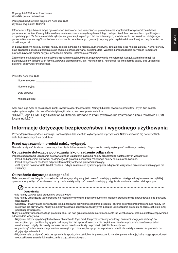 Copyright © 2010. Acer Incorporated. Wszelkie prawa zastrzeżone. Podręcznik użytkownika projektora Acer serii C20 Wydanie oryginalne: 10/2010 W przewidzianym miejscu poniżej należy zapisać oznaczenie modelu, numer seryjny, datę zakupu oraz miejsce zakupu. Numer seryjny oraz oznaczenie modelu znajdują się na etykiecie przymocowanej do komputera. Wszelka korespondencja dotycząca komputera powinna zawierać numer seryjny, oznaczenie modelu i informacje o zakupie. Zabronione jest kopiowanie jakiejkolwiek części niniejszej publikacji, przechowywanie w systemach wyszukiwania informacji lub przekazywanie w jakiejkolwiek formie, zarówno elektronicznej, jak i mechanicznej, kserokopii lub innej formie zapisu bez uprzedniej pisemnej zgody Acer Incorporated. Projektor Acer serii C20 Numer modelu: _______________________________________ Numer seryjny: _______________________________________ Data zakupu: _____________________________________ Miejsce zakupu: ____________________________________ Acer oraz logo Acer to zastrzeżone znaki towarowe Acer Incorporated. Nazwy lub znaki towarowe produktów innych firm zostały wykorzystane wyłącznie do celów identyfikacji i należą one do odpowiednich firm. “HDMITM, logo HDMI i High-Definition Multimedia Interface to znaki towarowe lub zastrzeżone znaki towarowe HDMI Licensing LLC.” Informacje dotyczące bezpieczeństwa i wygodnego użytkowania Przeczytaj uważnie podane instrukcje. Zachowaj ten dokument do wykorzystania w przyszłości. Należy stosować się do wszystkich instrukcji oznaczonych na produkcie. Przed czyszczeniem produkt należy wyłączyć. Nie należy używać środków czyszczących w płynie lub w aerozolu. Czyszczenie należy wykonywać zwilżoną szmatką. Ostrzeżenie dotyczące podłączania jako urządzenie odłączalne Podczas podłączania urządzenia do zewnętrznego urządzenia zasilania należy przestrzegać następujących wskazówek: • Przed podłączeniem przewodu zasilającego do gniazda sieci prądu zmiennego należy zainstalować zasilacz. • Przed odłączeniem zasilacza od projektora należy odłączyć przewód zasilający. • Jeśli system posiada wiele źródeł zasilania, odłącz zasilanie od systemu poprzez odłączenie wszystkich przewodów zasilających od zasilaczy. Ostrzeżenie dotyczące dostępności Należy upewnić się, że gniazdo zasilania do którego podłączany jest przewód zasilający jest łatwo dostępne i usytuowane jak najbliżej operatora. Aby odłączyć zasilanie od urządzenia należy odłączyć przewód zasilający od gniazda zasilania prądem elektrycznym. .................................................................................................... Ostrzeżenie: • Nie należy używać tego produktu w pobliżu wody. • Nie należy umieszczać tego produktu na niestabilnym wózku, podstawie lub stole. Upadek produktu może spowodować jego poważne uszkodzenie. • Szczeliny i otwory służą do wentylacji i mają zapewnić prawidłowe działanie produktu i chronić go przed przegrzaniem. Nie należy ich blokować lub przykrywać. Nigdy nie należy blokować szczelin wentylacyjnych poprzez umieszczanie produktu na łóżku, sofie lub innej podobnej powierzchni. Nigdy nie należy umieszczać tego produktu obok lub nad grzejnikiem lub miernikiem ciepła lub w zabudowie, jeśli nie zostanie zapewniona odpowiednia wentylacja. • Nigdy nie należy wpychać jakichkolwiek obiektów do tego produktu przez szczeliny obudowy, ponieważ mogą one dotknąć do niebezpiecznych punktów będących pod napięciem lub spowodować zwarcie części, a w rezultacie pożar lub porażenie prądem elektrycznym. Nigdy nie należy dopuszczać do przedostania się do produktu jakichkolwiek płynów. • Aby uniknąć zniszczenia komponentów wewnętrznych i zabezpieczyć przed wyciekiem baterii, nie należy umieszczać produktu na drgającej powierzchni. • Nigdy nie należy używać podczas uprawiania sportu, ćwiczeń lub w innym otoczeniu narażonym na wibracje, które mogą spowodować nieoczekiwane zwarcie lub uszkodzenie urządzeń obrotowych. Polski Informacje w tej publikacji mogą być okresowo zmieniane, bez konieczności powiadamiania kogokolwiek o wprowadzeniu takich poprawek lub zmian. Zmiany takie zostaną zamieszczone w nowych wydaniach tego podręcznika lub w dokumentach i publikacjach uzupełniających. Ta firma nie udziela rękojmi ani gwarancji, wyraźnych lub domniemanych, w odniesieniu do zawartości niniejszego podręcznika, a w szczególności odrzuca roszczenia domniemanych gwaracji dotyczących przydatności handlowej lub przydatności do określonego celu. ii Polski Zasilanie prądem elektrycznym • Ten produkt powinien być zasilany przy użyciu parametrów zasilania wskazanych na etykiecie. Przy braku pewności, co do parametrów dostępnego w danej okolicy sieci zasilającej należy sprawdzić te informacje u dostawcy lub w lokalnym zakładzie energetycznym. • Nie należy kłaść na przewodzie zasilającym żadnych przedmiotów. Nie należy umieszczać tego produktu w miejscu, gdzie może być nadeptywany przez przechodzące osoby. • Jeśli z tym produktem używany jest przedłużacz, należy sprawdzić, czy łączny amperaż urządzeń podłączonych do przedłużacza nie przekracza amperażu przedłużacza. Należy również sprawdzić, czy łączny amperaż wszystkich produktów połączonych do gniazda ściennego nie przekraczać wartości znamionowej bezpiecznika. • Nie należy przeciążać gniazda zasilania, listwy zasilającej lub odbiornika poprzez podłączanie zbyt wielu urządzeń. Całkowite obciążenie systemu nie może przekraczać 80% wartości znamionowej obciążenia obwodu. Jeśli używane są listwy zasilające, obciążenie nie powinno przekraczać 80% wartości znamionowej prądu na wejściu listwy zasilającej. • Adapter prądu zmiennego tego produktu jest wyposażony w trzy-przewodową wtyczkę z uziemieniem. Wtyczk