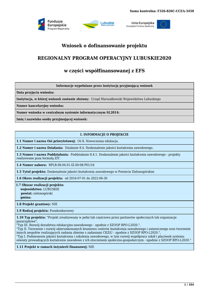 Suma kontrolna: F326-826C-CCEA-3450 Wniosek o dofinansowanie projektu REGIONALNY PROGRAM OPERACYJNY LUBUSKIE2020 w części współfinansowanej z EFS Informacje wypełniane przez instytucję przyjmującą wniosek Data przyjęcia wniosku: Instytucja, w której wniosek zostanie złożony: Urząd Marszałkowski Województwa Lubuskiego Numer kancelaryjny wniosku: Numer wniosku w centralnym systemie informatycznym SL2014: Imię i nazwisko osoby przyjmującej wniosek: I. INFORMACJE O PROJEKCIE 1.1 Numer i nazwa Osi priorytetowej: Oś 8. Nowoczesna edukacja. 1.2 Numer i nazwa Działania: Działanie 8.4. Doskonalenie jakości kształcenia zawodowego. 1.3 Numer i nazwa Poddziałania: Poddziałanie 8.4.1. Doskonalenie jakości kształcenia zawodowego - projekty realizowane poza formułą ZIT. 1.4 Numer naboru: RPLB.08.04.01-IZ.00-08-P01/16 1.5 Tytuł projektu: Doskonalenie jakości kształcenia zawodowego w Powiecie Zielonogórskim 1.6 Okres realizacji projektu: od 2016-07-01 do 2022-06-30 1.7 Obszar realizacji projektu: województwo: LUBUSKIE powiat: zielonogórski gmina: 1.8 Projekt grantowy: NIE 1.9 Rodzaj projektu: Pozakonkursowy 1.10 Typ projektu: "Projekt zrealizowany w pełni lub częściowo przez partnerów społecznych lub organizacje pozarządowe", "Typ III. Rozwój doradztwa edukacyjno-zawodowego - zgodnie z SZOOP RPO-L2020.", "Typ II. Tworzenie i rozwój ukierunkowanych branżowo centrów kształcenia zawodowego i ustawicznego oraz tworzenie innych zespołów realizujących zadania zbieżne z zadaniami CKZiU - zgodnie z SZOOP RPO-L2020.", "Typ I. Podniesienie jakości kształcenia i szkolenia zawodowego, w tym rozwój współpracy szkół i placówek systemu oświaty prowadzących kształcenie zawodowe z ich otoczeniem społeczno-gospodarczym - zgodnie z SZOOP RPO-L2020." 1.11 Projekt w ramach inżynierii finansowej: NIE 1 / 104 Suma kontrolna: F326-826C-CCEA-3450 II. PROJEKTODAWCA (BENEFICJENT) 2.1 Nazwa projektodawcy: Powiat Zielonogórski 2.1.1 Forma prawna projektodawcy: wspólnoty samorządowe 2.1.2 Forma własności projektodawcy: Jednostki samorządu terytorialnego lub samorządowe osoby prawne 2.1.3 NIP projektodawcy: PL9730588217 2.1.4 REGON projektodawcy: 970770149 2.1.5 PKD projektodawcy: 75.11 Kierowanie podstawowymi rodzajami działalności publicznej 2.1.6 Dane projektodawcy 2.1.6.1 Adres siedziby: Ulica: Podgórna Nr budynku: 5 Nr lokalu: Kod pocztowy: 65-057 PL Miejscowość: Zielona Góra 2.1.6.2 Telefon: 684527500 2.1.6.3 Fax: 68 452 75 00 2.1.6.4 Adres e-mail: [email protected] 2.1.6.5 Adres strony WWW: powiat-zielonogorski.pl 2.2 Osoba/y uprawniona/e do podejmowania decyzji wiążących w imieniu projektodawcy: Edyta Dwojak, Skarbnik Waldemar Kotlarski , Wicestarosta Dariusz Wróblewski, Starosta Zielonogórski 2.3 Osoba do kontaktów roboczych: Barbara Chudzińska, Główny Specjalista w Wydziale Edukacji i Spraw Społecznych 2.3.1. Adres osoby do kontaktów roboczych: Ulica: Podgórna Nr budynku: 5 Nr lokalu: Kod pocztowy: 65-057 Miejscowość: Zielona Góra 2.3.2 Telefon: 684527580 2.3.3 E-mail: [email protected] 2.3.4 Fax: 68 452 75 79 2.4 Partnerzy: TAK 2.4.1 Nazwa organizacji/instytucji: Profi Biznes Group Sylwia Karina Majewska 2.4.2 Forma prawna partnera: osoby fizyczne prowadzące działalność gospodarczą - małe przedsiębiorstwo 2.4.3 Forma własności partnera: Krajowe osoby fizyczne 2.4.4 NIP partnera: PL8521673042 2.4.5 REGON partnera: 811968691 2.4.6 Adres siedziby: Ulica: Aleja Piastów 2 / 104 Suma kontrolna: F326-826C-CCEA-3450 Nr budynku: 75 Nr lokalu: 3 Kod pocztowy: 70-326 Miejscowość: Szczecin 2.4.7 Telefon: 914530155 2.4.8 Fax: 914530155 wew.110 2.4.9 Adres e-mail: [email protected] 2.4.10 Adres strony WWW: www.szkolenia-treningi.pl 2.5 Osoba/y uprawniona/e do podejmowania decyzji wiążących w imieniu partnera: Sylwia Majewska - właściciel 2.6 Symbol partnera: PBG 2.4.1 Nazwa organizacji/instytucji: Organizacja Pracodawców Ziemi Lubuskiej 2.4.2 Forma prawna partnera: związki pracodawców 2.4.3 Forma własności partnera: Pozostałe krajowe jednostki prywatne 2.4.4 NIP partnera: PL9730052037 2.4.5 REGON partnera: 970032581 2.4.6 Adres siedziby: Ulica: Reja Nr budynku: 6 Nr lokalu: Kod pocztowy: 65-076 Miejscowość: Zielona Góra 2.4.7 Telefon: 683271881 2.4.8 Fax: 683271881 2.4.9 Adres e-mail: [email protected] 2.4.10 Adres strony WWW: www.opzl.pl 2.5 Osoba/y uprawniona/e do podejmowania decyzji wiążących w imieniu partnera: Wiesław Ocytko -Wiceprzewodniczący Zarządu OPZL , Jarosław Nieradka – Dyrektor Biura 2.6 Symbol partnera: OPZ 2.4.1 Nazwa organizacji/instytucji: Państwowa Wyższa Szkoła Zawodowa w Sulechowie 2.4.2 Forma prawna partnera: uczelnie 2.4.3 Forma własności partnera: Skarb Państwa 2.4.4 NIP partnera: PL9271666230 2.4.5 REGON partnera: 970751880 2.4.6 Adres siedziby: Ulica: Armi Krajowej Nr budynku: 51 Nr lokalu: Kod pocztowy: 66-100 Miejscowość: Sulechów 2.4.7 Telefon: 683528303 3 / 104 Suma kontrolna: F326-826C-CCEA-3450 2.4.8 Fax: 683528303 2.4.9 Adres e-mail: [email protected] 2.4.10 Adres strony WWW: www.pwsz.sulechow.pl 2.5 Osoba/y uprawniona/e do podejmowania decyzji wiążących w imieniu partnera: prof. dr hab. inż. Marian Miłek 2.6 Symbol partnera: PWS 4 / 104 Suma kontrolna: F326-826C-CCEA-3450 III. OPIS PROJEKTU W KONTEKŚCIE WŁAŚCIWEGO CELU SZCZEGÓŁOWEGO RPO Lubuskie 2020 RYZYKO NIEOSIĄGNIĘCIA ZAŁOŻEŃ PROJEKTU* (* dotyczy tylko projektów, których wniskowana kwota dofinansowania jest równa albo przekracza 2 mln zł) 3.1 Opis projektu 3.1.1. Podaj krótki opis projektu dla celów promocyjnych i statystycznych Celem głównym projektu jest zwiększenie efektywności i atrakcyjności szkolnictwa zawodowego w powiecie zielonogórskim poprzez udzielenie wsparcia 1 placówce kształcenia zawod. (Zespół Szkół Ponadgimnazjalnych w Sulechowie) w postaci doposażenia pracowni zawodowych, wsparcia poprzez kursy,szkolenia,staże i praktyki 215 uczniów (w tym 207K; w tym 4 ON (w tym 
