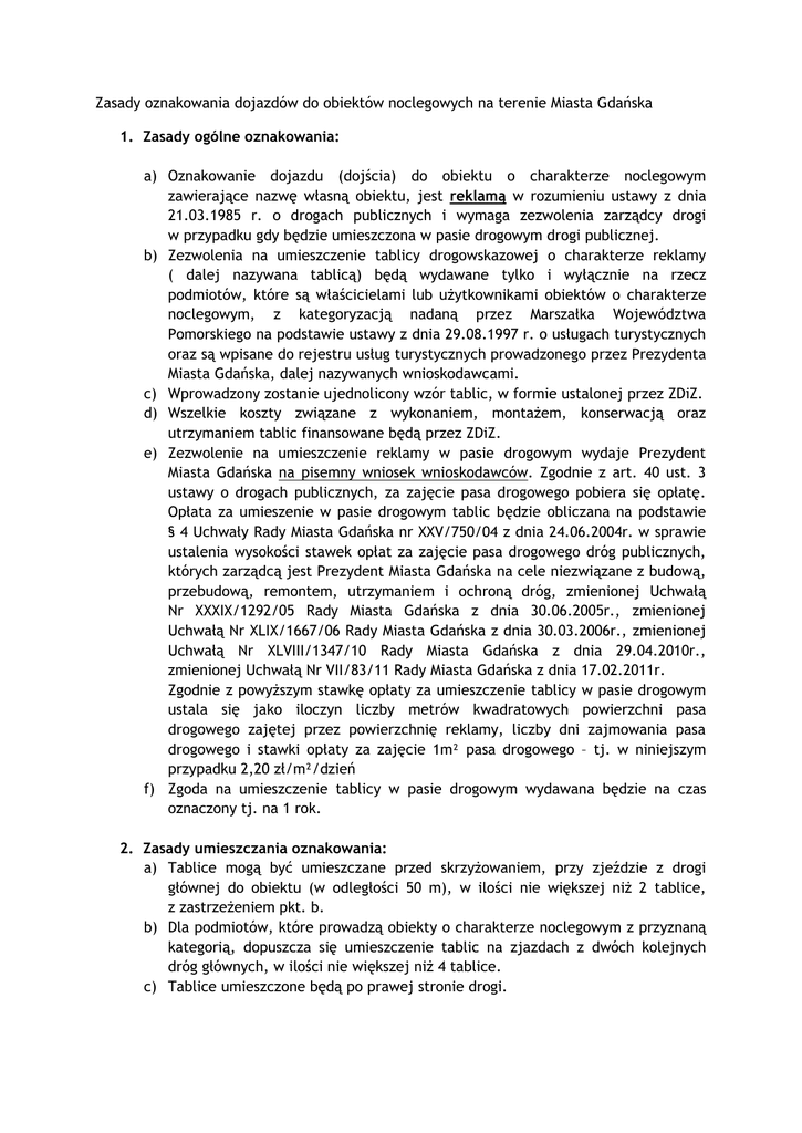 Zasady oznakowania dojazdów do obiektów noclegowych na terenie Miasta Gdańska 1. Zasady ogólne oznakowania: a) Oznakowanie dojazdu (dojścia) do obiektu o charakterze noclegowym zawierające nazwę własną obiektu, jest reklamą w rozumieniu ustawy z dnia 21.03.1985 r. o drogach publicznych i wymaga zezwolenia zarządcy drogi w przypadku gdy będzie umieszczona w pasie drogowym drogi publicznej. b) Zezwolenia na umieszczenie tablicy drogowskazowej o charakterze reklamy ( dalej nazywana tablicą) będą wydawane tylko i wyłącznie na rzecz podmiotów, które są właścicielami lub użytkownikami obiektów o charakterze noclegowym, z kategoryzacją nadaną przez Marszałka Województwa Pomorskiego na podstawie ustawy z dnia 29.08.1997 r. o usługach turystycznych oraz są wpisane do rejestru usług turystycznych prowadzonego przez Prezydenta Miasta Gdańska, dalej nazywanych wnioskodawcami. c) Wprowadzony zostanie ujednolicony wzór tablic, w formie ustalonej przez ZDiZ. d) Wszelkie koszty związane z wykonaniem, montażem, konserwacją oraz utrzymaniem tablic finansowane będą przez ZDiZ. e) Zezwolenie na umieszczenie reklamy w pasie drogowym wydaje Prezydent Miasta Gdańska na pisemny wniosek wnioskodawców. Zgodnie z art. 40 ust. 3 ustawy o drogach publicznych, za zajęcie pasa drogowego pobiera się opłatę. Opłata za umieszenie w pasie drogowym tablic będzie obliczana na podstawie § 4 Uchwały Rady Miasta Gdańska nr XXV/750/04 z dnia 24.06.2004r. w sprawie ustalenia wysokości stawek opłat za zajęcie pasa drogowego dróg publicznych, których zarządcą jest Prezydent Miasta Gdańska na cele niezwiązane z budową, przebudową, remontem, utrzymaniem i ochroną dróg, zmienionej Uchwałą Nr XXXIX/1292/05 Rady Miasta Gdańska z dnia 30.06.2005r., zmienionej Uchwałą Nr XLIX/1667/06 Rady Miasta Gdańska z dnia 30.03.2006r., zmienionej Uchwałą Nr XLVIII/1347/10 Rady Miasta Gdańska z dnia 29.04.2010r., zmienionej Uchwałą Nr VII/83/11 Rady Miasta Gdańska z dnia 17.02.2011r. Zgodnie z powyższym stawkę opłaty za umieszczenie tablicy w pasie drogowym ustala się jako iloczyn liczby metrów kwadratowych powierzchni pasa drogowego zajętej przez powierzchnię reklamy, liczby dni zajmowania pasa drogowego i stawki opłaty za zajęcie 1m² pasa drogowego – tj. w niniejszym przypadku 2,20 zł/m²/dzień f) Zgoda na umieszczenie tablicy w pasie drogowym wydawana będzie na czas oznaczony tj. na 1 rok. 2. Zasady umieszczania oznakowania: a) Tablice mogą być umieszczane przed skrzyżowaniem, przy zjeździe z drogi głównej do obiektu (w odległości 50 m), w ilości nie większej niż 2 tablice, z zastrzeżeniem pkt. b. b) Dla podmiotów, które prowadzą obiekty o charakterze noclegowym z przyznaną kategorią, dopuszcza się umieszczenie tablic na zjazdach z dwóch kolejnych dróg głównych, w ilości nie większej niż 4 tablice. c) Tablice umieszczone będą po prawej stronie drogi. d) Nie dopuszcza się lokalizacji tablic kolidujących z oznakowaniem drogowym oraz w miejscach, w których mogłoby to zagrozić bezpieczeństwu ruch drogowego na drodze lub ruch ten utrudnić. e) Na jednym słupku nie może być umieszczonych więcej, niż 5 tablic, skierowanych w jednym kierunku. f) Tablice umieszczane będą na słupkach w następującej kolejności: - obiekty z wyższą kategorią umieszczane będą na wyższej pozycji w stosunku do posiadających niższą kategorię, - w sytuacji kiedy kilka obiektów będzie posiadało tą samą kategorię kolejność umieszczania informacji na słupku będzie następowała alfabetycznie, - obiekty z wyższą kategorią posiadają priorytet w stosunku do obiektów o niższej kategorii w zakresie dotyczącym lokalizacji i rozmieszczenia na słupku. - w wypadku nie uzyskania zezwolenia (przedłużenie) Tablice zostaną usunięte staraniem ZDiZ bez wezwania 3. Ustala się następujący wzór tablic: a) Wymiar tablic: zgodnie z załącznikiem nr 1 b) Kolor tła: RGB- 247, 237, 207 CMYK – 25,5,15,0 c) Kolor czcionki: RGB – 95,81,65 CMYK – 60,65,80,15 d) Rodzaj czcionki: Arial Narrow CE e) Układ piktogramów na tablicy: - strzałka zawsze na zewnątrz - na tablicach kierunkowych do obiektów skategoryzowanych umieszczona zostanie kategoria obiektu, poprzez podanie ilości gwiazdek. 4. Rodzaj słupka: tablice drogowskazowe będą przygotowanych wg wzorów ustalonych przez ZDiZ. umieszczane na słupkach