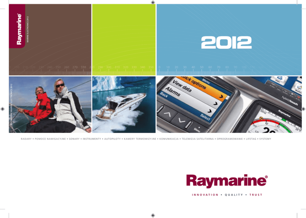 MARINE ELECTRONICS 2012 RAYMARINE MARINE ELECTRONICS 2012 RADARY • POMOCE NAWIGACYJNE • SONARY • INSTRUMENTY • AUTOPILOTY • KAMERY TERMOWIZYJNE • KOMUNIKACJA • TELEWIZJA SATELITARNA • OPROGRAMOWANIE • LIFETAG • SYSTEMY INNOVATION • QUALITY • TRUST WTAMY W RAYMARINE SPIS TREŚCI Mamy nadzieję że spodoba Ci się katalog naszych produktów, zaprojektowanych specjalnie dla Ciebie abyś mógł cieszyć się każdą chwilą na wodzie. 02 Nowe wskaźniki wielofunkcyjne serii e 12 Nowe wskaźniki wielofunkcyjne serii c 16 Instrumenty i70 22 Jednostki kontrolne autopilota p70 p70R 24 Glass Bridge 28 Urządzenia TackTick 32 Kamery termowizyjne 40 Kamery Video 42 Wskaźniki wielofunkcyjne 50 Oprogramowanie Voyage Planner 52 Echosondy 58 Radary 66 Anteny satelitarne TV 68 AIS 72 Komunikacja 76 Instrumenty 82 Autopiloty 100 SeaTalkng oraz wymiana sprzętu 102 Scanstrut 104 Propozycje systemów 108 Gwarancja MORSKA SPECJALIZACJA Raymarine specjalizuje się w elektronice morskiej. Specjalizacja ta zaowocowała powstaniem urządzeń, doskonale przystosowanych do zróżnicowanych warunków panujących na morzu, łączących w sobie najnowszą technologię z wytrzymałą konstrukcją. Nowoczesne jednostki badawcze Raymarine, poddają urządzenia wielu testom: temperaturowym, wilgotnościowym, wytrzymałościowym, abyś mógł cieszyć się eksploatacją swoich urządzeń w każdych warunkach. Nasza testowa łódka "Raymariner" oraz zespoły specjalistów na całym świecie, spędzają tysiące godzin na morzu, aby urządzenia Raymarine spełniały najwyższe standardy jakie się im stawia i które są oczekiwane przez Ciebie. MORSKA BAZA DANYCH Baza wszystkich informacji o produktach Raymarine jest dostępna on-line przez cały czas na stronie internetowej www.raymarine.com. Wszystkie pytania zadane przez klientów wraz z odpowiedziami, są przechowywane w bazie rozwiązań firmy Raymarine. Dynamiczne zarządzanie informacjami zapewnia, że najczęściej zadawane pytania i popularne tematy są zawsze na górze - można również wyszukiwać według produktów, kategorii, słów kluczowych lub fraz. Jeśli nadal masz problem ze znalezieniem odpowiedzi na Twoje pytania, zadaj pytanie bezpośrednio do odpowiedniego eksperta, klikając w zakładkę Ask Raymarine PEWNOŚĆ DLA CIEBIE Raymarine zapewnia również dobrą opiekę serwisową, oferując Tobie wydłużony czas gwarancji oraz wsparcie techniczne. Standardowa gwarancja (2 lata) może zostać wydłużona do trzech lat, poprzez rejestrację produktów na stronie Raymarine, bez dodatkowych opłat. Jeśli Twój sprzęt Raymarine został zakupiony i zainstalowany przez Autoryzowany Serwis Raymarine, możesz uzyskać "Gwarancję na burcie" - Onboard Limited Warranty Service więcej informacji na ten temat uzyskasz na stronie 108 katalogu lub na stronie www.raymarine.com/warranty. DOOKOŁA ŚWIATA Dzień na żaglach, weekendowy wypad na ryby, rejs przybrzeżny, wyścigi motorówek, regaty oceaniczne - światowa sieć dystrybutorów Raymarine czeka na Ciebie. DO ZOBACZENIA NA WODZIE! PHOTOS (TOP TO BOTTOM) MULDER; JOE MCCARTHY; TARGA; SOUTHERLY; AZIMUT (MAIN PHOTO) 2 W S K A Ź N I K I WINDY BOATS AS W I E L O F U N K C Y J N E W S K A Ź N I K I FAJNIE WYGLĄDAJĄ. SĄ INTELIGENTNE, LUBIĄ POŁĄCZENIA SIECIOWE. NOWE WSKAŹNIKI SERII e. Nowe wskaźniki wielofunkcyjne serii e – przeznaczone są na łodzie motorowe, RIB-y, żaglówki, łodzie rybackie. Wyposażone w ekrany dotykowe, w połączeniu z intuicyjnym interfejsem/menu. oraz całą gamę funkcji i możliwości połączeń sieciowych. Nowe wskaźniki serii e mogą być twoje. • Nowa aplikacja Raymarine Viewer (na Apple iPhone4 i wyżej, oraz iPad 1 i 2). • Doskonałe połączenia - dostęp do informacji i muzyki, możliwość podłączenia opcjonalnego zdalnego pilota. • Jasne ekrany, widoczne nawet w polaryzowanych okularach pod każdym kątem. • Wskaźniki HybridTouch TM z procesorem dwu-rdzeniowym i dedykowanym procesorem graficznym dla doskonałej wydajności. NOWOŚĆ Nowy styl... nowe wskaźniki serii e są zaprojektowane w nowatorski sposób, zrywający z tradycyjnym pudełkowatym wzornictwem. Nowe wskaźniki wyglądają niezwykle efektownie na każdym stanowisku sterowym. Zgrabny kształt wskaźnika, niski profil oraz wąska ramka zapewniają maksymalną powierzchnię ekranu przy minimalnej zajmowanej powierzchni. Wytrzymały i elegancki projekt dopełniają zrównane z powierzchnią wskaźnika przyciski oraz ukryte w prawym dolnym rogu gniazdo kart. Nowy UniController pozwala na precyzyjną kontrolę kursora joystickiem, zmianę zakresów pierścieniem obrotowym, a także obsługę menu. W I E L O F U N K C Y J N E 3 4 W S K A Ź N I K I W I E L O F U N K C Y J N E LIGHTHOUSE TM - INTERFEJS UŻYTKOWNIKA POKAZUJE CI DROGĘ Zaprojektowany przez Raymarine specjalnie dla wodniaków, interfejs użytkownika LightHouse (UI) sprawia, że poruszanie się po funkcjach menu jest łatwe i szybkie. LightHouse intuicyjnie umieszcza najczęściej używane funkcje pod ręką. Z interfejsem LightHouse szybko zostaniesz ekspertem. Na stronie startowej (home screen), znajdują się wszystkie aplikacje nowej eSerii wraz ze stronami użytkownika. Wystarczy przeciągnąć palcem po ekranie aby uzyskać dostęp do całej gamy możliwości nowego wskaźnika serii e. Interfejs LightHouse korzysta również z zalet technologii HybridTouch, dając możliwość wyboru opcji sterowania z ekranu lub z przycisków, kiedy pogoda się pogorszy. Łatwa personalizacja Stwórz swoje własne strony nawigacyjne przez przeciąganie aplikacji i opuszczanie ich na wybranym miejscu na stronie. Nowy interfejs LightHouse poprowadzi cię przez proces ustawień początkowych nowego wskaźnika serii e. W S K A Ź N I K I W I E L O F U N K C Y J N E 5 PHOTO: JOE MCCARTHY GPS ploter map Nowe wskaźniki serii e są gotowe do nawigacji, z wbudowanym 50 kanałowym odbiornikiem GPS wysokiej dokładności oraz 