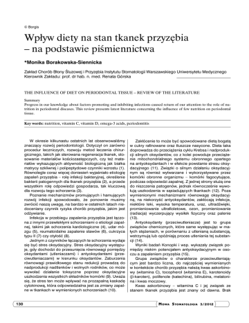 © Borgis Wpływ diety na stan tkanek przyzębia – na podstawie piśmiennictwa *Monika Borakowska-Siennicka Zakład Chorób Błony Śluzowej i Przyzębia Instytutu Stomatologii Warszawskiego Uniwersytetu Medycznego Kierownik Zakładu: prof. dr hab. n. med. Renata Górska The influence of diet on periodontal tissue – review of the literature Summary Progress in our knowledge about factors promoting and inhibiting infections caused return of our attention to the role of nutrition in periodontal diseases. This review presents latest literature concerning the influence of few nutrition on periodontal tissue. Key words: nutrition, vitamin C, vitamin D, omega-3 acids, periodontitis W okresie kilkunastu ostatnich lat obserwowaliśmy znaczący rozwój periodontologii. Dotyczył on zarówno procedur leczniczych, rozwoju metod leczenia chirurgicznego, takich jak sterowana regeneracja tkanek, stosowanie materiałów kościozastępczych, czy też materiałów wykazujących aktywność biologiczną jak białka matrycy szkliwnej i polipeptydowe czynniki wzrostu (1). Równolegle coraz więcej doniesień wyjaśniało etiologię zapaleń przyzębia – rolę infekcji bakteryjnej, określenie bakterii patogennych dla tkanek przyzębia (2), a przede wszystkim rolę odpowiedzi gospodarza, tak kluczową dla rozwoju tego schorzenia (3). Poznanie mechanizmów promujących i hamujących rozwój infekcji spowodowało, że ponownie musimy zwrócić naszą uwagę, na bardzo w ostatnich latach niedoceniany czynnik ryzyka chorób przyzębia, jakim jest odżywianie. Infekcja w przebiegu zapalenia przyzębia jest łączona z innymi przewlekłymi schorzeniami o etiologii zapalnej, takimi jak schorzenia kardiologiczne (4), udar mózgu (5), reumatoidalne zapalenie stawów (6), cukrzyca typu II (7) czy otyłość (8). Jednym z czynników łączących te schorzenia wydaje się być stres oksydacyjny. Stres oksydacyjny występuje, gdy dochodzi do przesunięcia równowagi pomiędzy oksydantami (utleniaczami) i antyoksydantami (przeciwutleniaczami) w kierunku oksydantów. Zaburzenia równowagi prawidłowego stanu redukcji prowadzą do nadprodukcji nadtlenków i wolnych rodników, co może wywołać działanie toksyczne poprzez oksydacyjne uszkodzenia wszystkich składników komórki (9). Uważa się, że stres ten może wpływać na prozapalną kaskadę cytokinową, która odpowiedzialna jest za zmiany zapalne w tkankach w wymienionych schorzeniach (10). 130 Zakłócenie to może być spowodowane dietą bogatą w cukry rafinowane oraz tłuszcze nasycone. Dieta taka doprowadza do przeciążenia cyklu Krebsa i nadprodukcji silnych oksydantów, co z kolei powoduje przeciążenie mitochondrialnego systemu obronnego opartego na antyoksydantach i w efekcie powstanie stresu oksydacyjnego (11). Związki o silnym działaniu oksydacyjnym są również wytwarzane i wykorzystywane przez komórki obronne organizmu – komórki fagocytujące, podczas odpowiedzi zapalnej. Z jednej strony służą one do niszczenia patogenów, jednak równocześnie wywołują uszkodzenia w sąsiadujących tkankach (12). Poza wymienionymi mechanizmami równowagę oksydacyjną, na niekorzyść antyoksydantów, zakłócają infekcje, niektóre leki, wysoka temperatura, uraz, ultradźwięki, promieniowanie ultrafioletowe, ozon, promieniowanie (radiacja) wyczerpujący wysiłek fizyczny oraz palenie (13). Antyoksydanty (przeciwutleniacze) jest to grupa związków chemicznych, które same występując w małych stężeniach, w porównaniu z utlenianą substancją, wstrzymują lub opóźniają proces utleniania tej substancji (14). Wyniki badań Konopki i wsp. wykazały związek pomiędzy niskim potencjałem antyoksydacyjnym w osoczu a zapaleniem przyzębia (15). Grupa związków o charakterze przeciwutleniającym jest bardzo liczna, do najczęściej wymienianych w kontekście chorób przyzębia należą kwas askorbinowy (witamina C), tocopherol (witamina E), karotenoidy (β-karoten), polifenole (katechina), bilirubina, melatonina i kwas moczowy. Kwas askorbinowy – witamina C i jej związek ze stanem tkanek przyzębia jest znany od dawna. Brak N OWA S TOMATOLOGIA 3/2012 Wpływ diety na stan tkanek przyzębia – na podstawie piśmiennictwa odpowiedniej dawki witaminy C w pożywieniu marynarzy w ubiegłych wiekach doprowadzał do rozwoju szkorbutu – objawiającego się nasilonym krwawieniem z dziąseł i utratą zębów. Witamina C spełnia różnorodne funkcje biochemiczne: – jest reduktorem dla różnych enzymów, – jest antyoksydantem, pomagającym usunąć nadmiar wolnych rodników (reaktywne formy tlenu) (16), – bierze udział w syntezie kolagenu – jest kofaktorem lizylo i propylo hydroksylazy. Jej zadaniem jest promocja syntezy dojrzałej siatki kolagenowej, poprzez ochronę tych enzymów przed utlenieniem i inaktywacją (17, 18), – jest wykorzystywana podczas chemotaksji i fagocytozy przez leukocyty – granulocyty wielojądrzaste (19), – uczestniczy w różnicowaniu się komórek mezenchymalnych (20). Przeprowadzone w ostatnich latach badania wykazały związek pomiędzy niskim poziomem witaminy C w osoczu a zwiększonym ryzykiem rozwoju zapalenia przyzębia (21, 22). Wyniki badań opublikowanych przez Amaliya i wsp. wskazują, że u pacjentów z niedoborem witaminy C stwierdzono większą utratę przyczepu łącznotkankowego, niż u pacjentów z jej prawidłowym poziomem (23). Przeprowadzone badania u pracowników plantacji cytrusów, którzy spożywają dużo świeżych owoców cytrusowych wykazały znamiennie niższe występowanie głębokich kieszonek przyzębnych w tej grupie w porównaniu do pracowników plantacji produkującej zboże (24). Kolejne badania przeprowadzone przez Staudte i wsp. opierały się na wprowadzeniu do diety pacjentów z zapaleniem przyzębia grapefruitów. Spożywanie 2 grapefruitów dziennie przez okres 2 tygodni, spowodowało wzrost poziomu witaminy C w osoczu oraz obniżenie wskaźnika krwawienia z dziąse