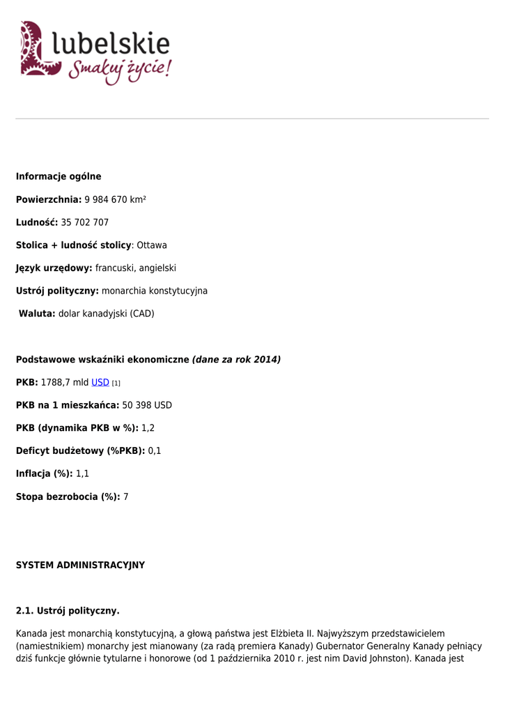 Informacje ogólne Powierzchnia: 9 984 670 km² Ludność: 35 702 707 Stolica + ludność stolicy: Ottawa Język urzędowy: francuski, angielski Ustrój polityczny: monarchia konstytucyjna Waluta: dolar kanadyjski (CAD) Podstawowe wskaźniki ekonomiczne (dane za rok 2014) PKB: 1788,7 mld USD [1] PKB na 1 mieszkańca: 50 398 USD PKB (dynamika PKB w %): 1,2 Deficyt budżetowy (%PKB): 0,1 Inflacja (%): 1,1 Stopa bezrobocia (%): 7 SYSTEM ADMINISTRACYJNY 2.1. Ustrój polityczny. Kanada jest monarchią konstytucyjną, a głową państwa jest Elżbieta II. Najwyższym przedstawicielem (namiestnikiem) monarchy jest mianowany (za radą premiera Kanady) Gubernator Generalny Kanady pełniący dziś funkcje głównie tytularne i honorowe (od 1 października 2010 r. jest nim David Johnston). Kanada jest również demokracją parlamentarną z federalnym systemem rządów parlamentarnych. Konstytucja Kanady określa prawne ramy państwa, obejmujące tekst pisany oraz niepisane zasady i zwyczaje. Podstawowe ramy kanadyjskiej konstytucji zawiera ustawa o Brytyjskiej Ameryce Północnej (ang. British North America Act) z 1867 r., przemianowana w 1982 r. na Ustawę Konstytucyjną z 1867 r. Konstytucja Kanady dzieli władzę między rząd federalny i rządy poszczególnych prowincji. Konstytucja obejmuje Kanadyjską Kartę Praw i Wolności (ang. Canadian Charter of Rights and Freedoms), gwarantującą Kanadyjczykom podstawowe prawa i wolności. 2.2. Władza ustawodawcza Parlament Kanady składa się z głowy państwa i dwóch izb: wybieralnej Izby Gmin i mianowanego Senatu. Członków Izby Gmin wybiera się zgodnie z ordynacją większościową w okręgach wyborczych; wybory powszechne ogłasza Gubernator Generalny na wniosek Premiera. Trzy główne partie polityczne Kanady to: Liberalna Partia Kanady, Konserwatywna Partia Kanady i Nowa Demokratyczna Partia Kanady. Obecny większościowy rząd tworzy Partia Konserwatywna Kanady. 2.3. Władza wykonawcza Stanowisko premiera Kanady, szefa rządu, przypada liderowi partii politycznej, która zyskała poparcie większości w Izbie Gmin. Premier i jego gabinet mianowani są formalnie przez Gubernatora Generalnego Kanady. Jednak to premier formuje swój gabinet, a Gubernator Generalny zwyczajowo akceptuje personalne decyzje premiera. Tradycyjnie, w skład gabinetu wchodzą członkowie partii premiera z obu izb ustawodawczych, głównie z Izby Gmin. Władzę wykonawczą sprawują premier i gabinet, a wszyscy oni składają przysięgę przed Królewską Radą Kanady (ang. Queen’s Privy Council for Canada) i stają się Ministrami Korony. 2.4. Struktura administracji gospodarczej Na poziomie federalnym, do resortów odpowiedzialnych za sprawy gospodarcze należą: Ministerstwo Spraw Zagranicznych i Handlu i Rozwoju (Department of Foreign Affairs, Trade and Development Canada) – wkrótce przemianowane na Global Affaires Canada Ministerstwo Finansów (Department of Finance Canada) Ministerstwo ds. Zasobów Naturalnych, (Natural Resources Canada) Ministerstwo Przemysłu (Industry Canada) Ministerstwo Rolnictwa (Agriculture and Agri-Food), Ministerstwo Robót Publicznych i Usług Rządowych (Public Works and Government Services Canada) 2.5. Sądownictwo gospodarcze. Sąd Federalny oraz Federalny Sąd Apelacyjny mają zwierzchnią jurysdykcję w zakresie prawa cywilnego. Jednakże, ich orzecznictwo jest ograniczone do spraw przewidzianych w prawie federalnym. Sądy te mogą orzekać w sporach między prowincjami oraz między prowincją a rządem federalnym. Dodatkowo, przed tymi sądami prowadzone są sprawy z zakresu ochrony własności intelektualnej, ochrony konkurencji na rynku oraz te dotyczące przedsiębiorstw federalnych (crown corporations). Sądy poszczególnych prowincji Kanady mogą rozstrzygać wyłącznie w kwestiach, które nie są regulowane przez prawo na poziomie federalnym. Rząd federalny stworzył wyspecjalizowany sąd rozstrzygający kwestie podatkowe, tzw. Sąd Podatkowy Kanady (Tax Court of Canada). Sąd ten, z siedzibą główną w Ottawie i oddziałami regionalnymi w Toronto, Montrealu i Vancouver, daje możliwość osobom fizycznym, jak i przedsiębiorstwom wniesienia sprawy przeciwko rządowi federalnemu w kwestiach wynikających z prawodawstwa podatkowego. Sąd Podatkowy jest instytucją niezależną od kanadyjskiego urzędu skarbowego (Canada Revenue Agency) i innych instytucji rządowych Kanady. Prawodawstwo Kanady popiera arbitraż (krajowy bądź międzynarodowy) jako sposób rozstrzygania sporów. Jeszcze w trakcie postępowania arbitrażowego, za wyjątkiem prowincji Quebec, prawodawstwo Kanady zezwala trybunałowi arbitrażowemu na wydawanie decyzji o charakterze przejściowym (np. zabezpieczenie lub inspekcja nieruchomości). Kanadyjskie sądy zwyczajowo uznają orzeczenia trybunałów arbitrażowych. Wraz z przystąpieniem do Konwencji o uznawaniu i wykonywaniu zagranicznych orzeczeń arbitrażowych sporządzonej w Nowym Jorku dnia 10 czerwca 1958 r., Kanada ograniczyła zakres przesłanek, na podstawie których mogłaby anulować bądź odmówić uznania lub wykonania orzeczeń trybunału arbitrażowego. Przy Kanadyjskiej Izbie Handlowej (The Canadian Chamber of Commerce) znajduje się Komitet Arbitrażowy (Arbitration Committee), pełniący funkcję narodowego komitetu Kanady przy Międzynarodowym Sądzie Arbitrażowym (International Court of Arbitration) Międzynarodowej Izby Handlowej (International Chamber of Commerce (ICC)). W skład Komitetu wchodzi zespół ponad 50 wiodących specjalistów kanadyjskich z zakresu arbitrażu międzynarodowego. Komitet zarządza programami arbitrażowymi w Kanadzie, prowadzi działalność edukacyjną z zakresu arbitrażu międzynarodowego oraz promuje działalność ICC. Trybunał Handlu Zagranicznego Kanady (Canadian International Trade Tribunal) jest głównym, niezależnym organem quasi-sądowym w Kanadzie, zajmującym się kwestiami dot. środków zaradczych w systemie handlowym. Trybun