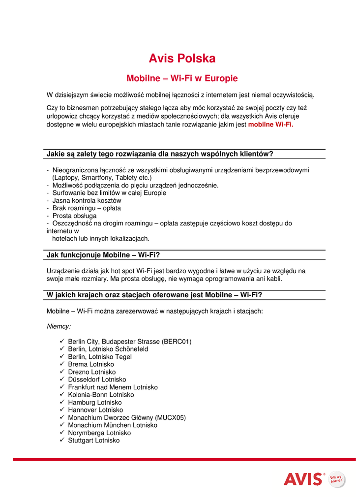 Avis Polska Mobilne – Wi-Fi w Europie W dzisiejszym świecie możliwość mobilnej łączności z internetem jest niemal oczywistością. Czy to biznesmen potrzebujący stałego łącza aby móc korzystać ze swojej poczty czy też urlopowicz chcący korzystać z mediów społecznościowych; dla wszystkich Avis oferuje dostępne w wielu europejskich miastach tanie rozwiązanie jakim jest mobilne Wi-Fi. Jakie są zalety tego rozwiązania dla naszych wspólnych klientów? - Nieograniczona łączność ze wszystkimi obsługiwanymi urządzeniami bezprzewodowymi (Laptopy, Smartfony, Tablety etc.) - Możliwość podłączenia do pięciu urządzeń jednocześnie. - Surfowanie bez limitów w całej Europie - Jasna kontrola kosztów - Brak roamingu – opłata - Prosta obsługa - Oszczędność na drogim roamingu – opłata zastępuje częściowo koszt dostępu do internetu w hotelach lub innych lokalizacjach. Jak funkcjonuje Mobilne – Wi-Fi? Urządzenie działa jak hot spot Wi-Fi jest bardzo wygodne i łatwe w użyciu ze względu na swoje małe rozmiary. Ma prosta obsługę, nie wymaga oprogramowania ani kabli. W jakich krajach oraz stacjach oferowane jest Mobilne – Wi-Fi? Mobilne – Wi-Fi można zarezerwować w następujących krajach i stacjach: Niemcy: Berlin City, Budapester Strasse (BERC01) Berlin, Lotnisko Schönefeld Berlin, Lotnisko Tegel Brema Lotnisko Drezno Lotnisko Düsseldorf Lotnisko Frankfurt nad Menem Lotnisko Kolonia-Bonn Lotnisko Hamburg Lotnisko Hannover Lotnisko Monachium Dworzec Główny (MUCX05) Monachium München Lotnisko Norymberga Lotnisko Stuttgart Lotnisko Szwajcaria: Bazylea Lotnisko Genf Lotnisko Zürich Lotnisko Austria: Innsbruck Lotnisko Salzburg Lotnisko Wiedeń Lotnisko Czechy: Praga Lotnisko Praga Centrum (PRGC01) Włochy: Bari Lotnisko Palese Bergamo Lotnisko Orio al Serio Brindisi Lotnisko Florencja Lotnisko Florencja Borgognissanti (FLRE03) Mediolan Lotnisko Linate Mediolan Lotnisko Malpensa, biura na Terminalach 1oraz 2 Neapol Lotnisko Capodichino Palermo Lotnisko Punta Raisi Pisa Lotnisko Rzym Centrum (ROMC01) Rzym Lotnisko Fiumicino Turyn Lotnisko Caselle Wenecja Lotnisko Marco Polo Verona Lotnisko Villafranca Hiszpania: Alicante Lotnisko Barcelona Lotnisko Madryt Lotnisko Malaga Lotnisko Majorka Lotnisko Portugalia: Faro Lotnisko Lizbona Lotnisko Porto Lotnisko Funchal Lotnisko (Madera) Wielka Brytania: Edinburgh Lotnisko Exeter Lotnisko Londyn Lotnisko Gatwick Londyn Lotnisko Heathrow, biura na Terminalach 1-4 oraz 5 Manchester Lotnisko Francja: Nicea Lotnisko Bordeaux Lotnisko Tuluza Lotnisko Paryż Lotnisko Charles de Gaulle Paryż Dworzec Północny, Gare du Nord (PARX05) Avignon Dworzec TGV (AVNX03) Genewa Lotnisko (strona francuska) Lyon Lotnisko Marsylia Lotnisko Belgia: Bruksela Lotnisko Bruksela, Dworzec Gare Midi (BRUX21) Charleroi Lotnisko Holandia: Amsterdam, Lotnisko Schiphol Amsterdam, Dworzec (AMSX02) Warunki mogą ulec zmianie Który format wejściowy jest stosowany w systemach GDS? Prosimy zwrócić uwagę: Mobilne - Wi-Fi może być zarezerwowane poprzez komendę /SQ- tylko w powyższych stacjach. /SQ-WIF Jakie są koszty Mobilnego - Wi-Fi? Koszt Mobilnego -Wi-Fi zależy od kraju wynajęcia. Prosimy pamiętać, że za wynajem na lotnisku lub dworcu zostanie doliczona dodatkowa opłata. Opłaty dotyczą wynajmu na dobę. Niemcy: Szwajcaria: Austria: Czechy: Wielka Brytania: Hispania: Portugalia: Włochy: Francja: Belgia : Holandia: 11,99 EUR brutto 9,99 CHF brutto 12,29 EUR brutto 12,50 EUR brutto 8,50 GBP brutto 10,99 EUR brutto 10,99 EUR brutto 11,60 EUR brutto 10.99 EUR brutto 10.99 EUR brutto 10.99 EUR brutto Warunki mogą ulec zmianie Czy wymagana jest rezerwacja z wyprzedzeniem? Tak. Mobilne Wi-Fi uznaje się za potwierdzone dla wszystkich rezerwacji posiadających adnotację „WIF” dokonanych z co najmniej 24 godzinnym wyprzedzeniem. W przypadku rezerwacji z mniej niż 24 godzinnym wyprzedzeniem, mobilne Wi-Fi nie jest gwarantowane i rekomenduje się sprawdzenie dostępności w biurze wynajmu. Ogólne Warunki wynajmu mobilnego Wi-Fi Oferowane w miarę dostępności Nie oferowane dla wynajmów w jedną stronę.