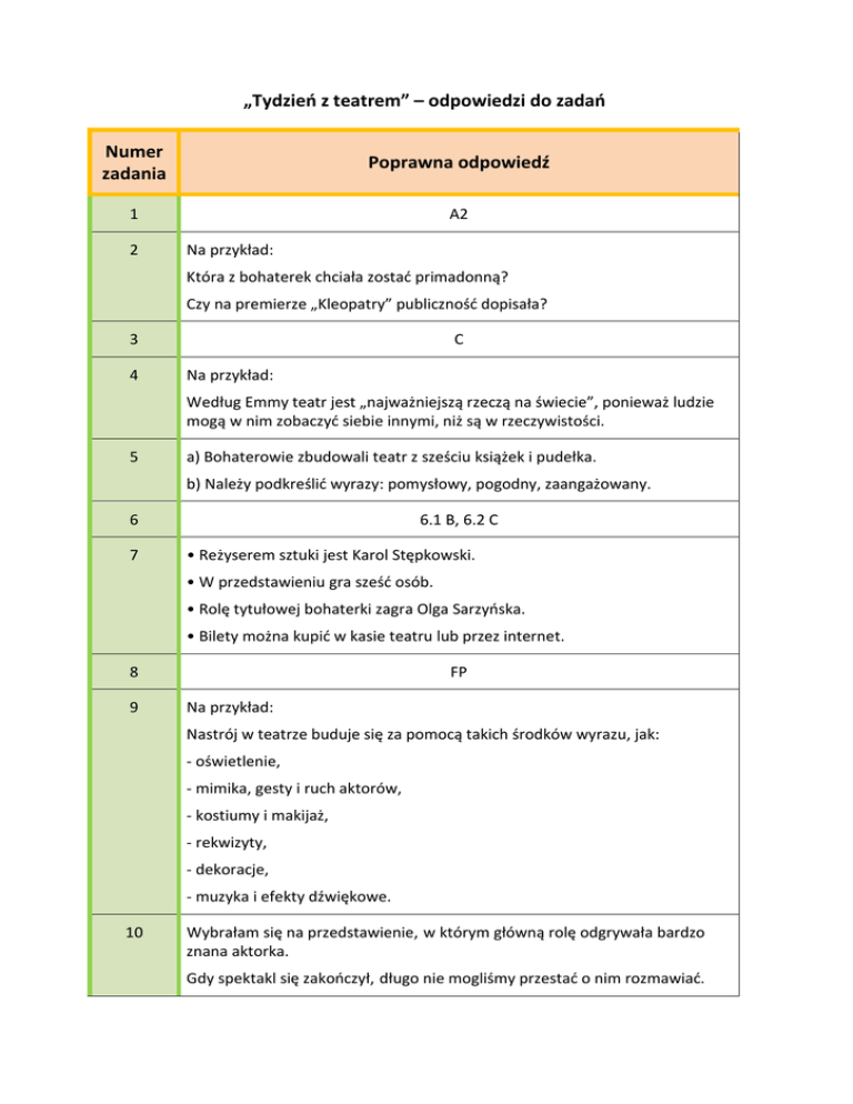 „Tydzień z teatrem” – odpowiedzi do zadań Numer zadania Poprawna odpowiedź 1 A2 2 Na przykład: Która z bohaterek chciała zostać primadonną? Czy na premierze „Kleopatry” publiczność dopisała? 3 4 C Na przykład: Według Emmy teatr jest „najważniejszą rzeczą na świecie”, ponieważ ludzie mogą w nim zobaczyć siebie innymi, niż są w rzeczywistości. 5 a) Bohaterowie zbudowali teatr z sześciu książek i pudełka. b) Należy podkreślić wyrazy: pomysłowy, pogodny, zaangażowany. 6 7 6.1 B, 6.2 C • Reżyserem sztuki jest Karol Stępkowski. • W przedstawieniu gra sześć osób. • Rolę tytułowej bohaterki zagra Olga Sarzyńska. • Bilety można kupić w kasie teatru lub przez internet. 8 9 FP Na przykład: Nastrój w teatrze buduje się za pomocą takich środków wyrazu, jak: - oświetlenie, - mimika, gesty i ruch aktorów, - kostiumy i makijaż, - rekwizyty, - dekoracje, - muzyka i efekty dźwiękowe. 10 Wybrałam się na przedstawienie, w którym główną rolę odgrywała bardzo znana aktorka. Gdy spektakl się zakończył, długo nie mogliśmy przestać o nim rozmawiać. Sztuka mnie zachwyciła, Tomek też był usatysfakcjonowany. Po chwili rozsunęła się kurtyna i wszystkie rozmowy ucichły. Przypomnienie: Zdanie złożone, w którym żadne ze zdań składowych nie odpowiada na pytanie wynikające z treści innego zdania, to zdanie złożone współrzędnie. Zdania składowe w tego rodzaju wypowiedzeniach mogą być połączone bezspójnikowo lub za pomocą takich spójników, jak: i, oraz, albo, lub, ale, lecz, więc, zatem, jednak, natomiast, ani (ni), bądź, a. 11 Na przykład: Zza kulis wyszedł aktor, jednak szybko schował się tam z powrotem. Po chwili wyjrzał zza kurtyny oraz zachichotał złowieszczo. 12 • W garderobie charakteryzator malował aktorkę, która miała wcielić się w rolę Królowej Śniegu. – B • Spektakl, który zrealizowano na podstawie baśni, cieszy się ogromną popularnością. – C • Oświetleniowiec włączył reflektor i skierował światło na głównego bohatera. – A • Gdy aktorzy otrzymali rekwizyty, próba się rozpoczęła. – D 13 Spójniki, przed którymi w zdaniu złożonym współrzędnie stawia się przecinek: ale, lecz, a, więc, jednak, natomiast, zatem Spójniki, przed którymi w zdaniu złożonym współrzędnie nie stawia się przecinka: i, lub, oraz, ani, albo, bądź 14 Chciałbym zapisać się do szkolnego teatru i brać udział w przedstawieniach. Grałbym główne role albo reżyserował spektakle. Bardzo lubię udawać różne postacie, więc z pewnością świetnie bym sobie poradził. Sukces na scenie nie przychodzi łatwo, ale mam zamiar ciężko na niego pracować. Każdego ranka będę ćwiczył mimikę, po szkole popracuję nad dykcją, a wieczorami będę oglądał nagrania spektakli teatralnych. 15 Na przykład: Aktorki robią sobie makijaż i układają włosy. Wszystkie kukiełki są bardzo ładne, ale ta jest zdecydowanie najładniejsza. 16 • Co prawda pod koniec spektaklu aktorka się potknęła, lecz szybko złapała równowagę. • Po południu obejrzę teatr telewizji lub poczytam książkę o najsłynniejszych reżyserach. • Dwa pierwsze przedstawienia zaprezentowane podczas festiwalu teatralnego nie były zbyt udane, natomiast kolejne spektakle zebrały zasłużone pochwały. 17 Na przykład: Trwał remont teatru, więc przedstawienie zostało odwołane.