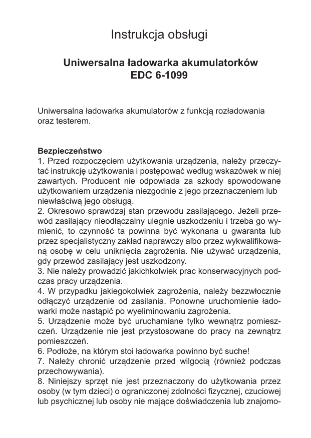 Instrukcja obsługi Uniwersalna ładowarka akumulatorków EDC 6-1099 Uniwersalna ładowarka akumulatorów z funkcją rozładowania oraz testerem. Bezpieczeństwo 1. Przed rozpoczęciem użytkowania urządzenia, należy przeczytać instrukcję użytkowania i postępować według wskazówek w niej zawartych. Producent nie odpowiada za szkody spowodowane użytkowaniem urządzenia niezgodnie z jego przeznaczeniem lub niewłaściwą jego obsługą. 2. Okresowo sprawdzaj stan przewodu zasilającego. Jeżeli przewód zasilający nieodłączalny ulegnie uszkodzeniu i trzeba go wymienić, to czynność ta powinna być wykonana u gwaranta lub przez specjalistyczny zakład naprawczy albo przez wykwalifikowaną osobę w celu uniknięcia zagrożenia. Nie używać urządzenia, gdy przewód zasilający jest uszkodzony. 3. Nie należy prowadzić jakichkolwiek prac konserwacyjnych podczas pracy urządzenia. 4. W przypadku jakiegokolwiek zagrożenia, należy bezzwłocznie odłączyć urządzenie od zasilania. Ponowne uruchomienie ładowarki może nastąpić po wyeliminowaniu zagrożenia. 5. Urządzenie może być uruchamiane tylko wewnątrz pomieszczeń. Urządzenie nie jest przystosowane do pracy na zewnątrz pomieszczeń. 6. Podłoże, na którym stoi ładowarka powinno być suche! 7. Należy chronić urządzenie przed wilgocią (również podczas przechowywania). 8. Niniejszy sprzęt nie jest przeznaczony do użytkowania przez osoby (w tym dzieci) o ograniczonej zdolności fizycznej, czuciowej lub psychicznej lub osoby nie mające doświadczenia lub znajomo- ści sprzętu, chyba, że odbywa się to pod nadzorem lub zgodnie z instrukcją użytkowania sprzętu, przekazanej przez osoby odpowiadające za ich bezpieczeństwo. Należy zwracać uwagę na dzieci, aby nie bawiły się urządzeniem. 9. W przypadku uszkodzenia urządzenia, w celu uniknięcia zagrożenia, naprawę może przeprowadzić tylko specjalistyczny zakład naprawczy albo wykwalifikowana osoba. 10. Nie korzystaj z urządzenia w pobliżu materiałów łatwopalnych. Zastosowanie Ładowarka jest przeznaczona do ładowania akumulatorów o rozmiarach: AAA, AA, C, D oraz 9V, typu Ni-MH / Ni-Cd. Ładowarka posiada 4 niezależne gniazda ładowania, w przypadku baterii 9V – dwa. Działanie • Ładowanie – przełącznik ustaw w pozycji „charge”. Przy gniazdach w których są baterie zapalą się czerwone diody oznaczając ładowanie. • Testowanie - przełącznik ustaw w pozycji „test”. Następnie włóż baterię do pierwszego gniazda (od strony przełącznika). Jasność diody oznacza poziom naładowania akumulatorka (dioda się nie świeci/świeci bardzo słabo - akumulatorek rozładowany, jasna dioda oznacza naładowany akumulatorek). • Rozładowanie – przełącznik ustaw w pozycji „discharge”. Podczas rozładowywania diody LED się nie świecą. Po rozładowaniu ustaw przełącznik w pozycji „test”, jeżeli bateria jest całkowicie rozładowana dioda powinna zgasnąć. Uwaga: Ładowarka nie jest przeznaczona do rozładowywania baterii 9V. Przybliżony czas ładowania Typ baterii Czas ładowania Ni-Cd Ni-MH AAA Micro/UM4 180mAh 550mAh 2.5 godz. 6-10 godz. AA Mignon/UM3 500mAh 1200mAh 5-8 godz. 10-20 godz. C Baby/UM2 1200mAh 1800mAh 10-20 godz. 15-25 godz. 1200mAh 2000mAh 12-25 godz. 20-30 godz. 100mAh 140mAh 5-11 godz. 8-15 godz. D Mono/UM1 9V Block 005P Ni-Cd czas rozładowywania Czas rozładowywania zależy od stanu i pojemności baterii. Baterie 9V nie mogą być rozładowywane. Specyfikacja produktu może ulec zmianie bez powiadomienia.