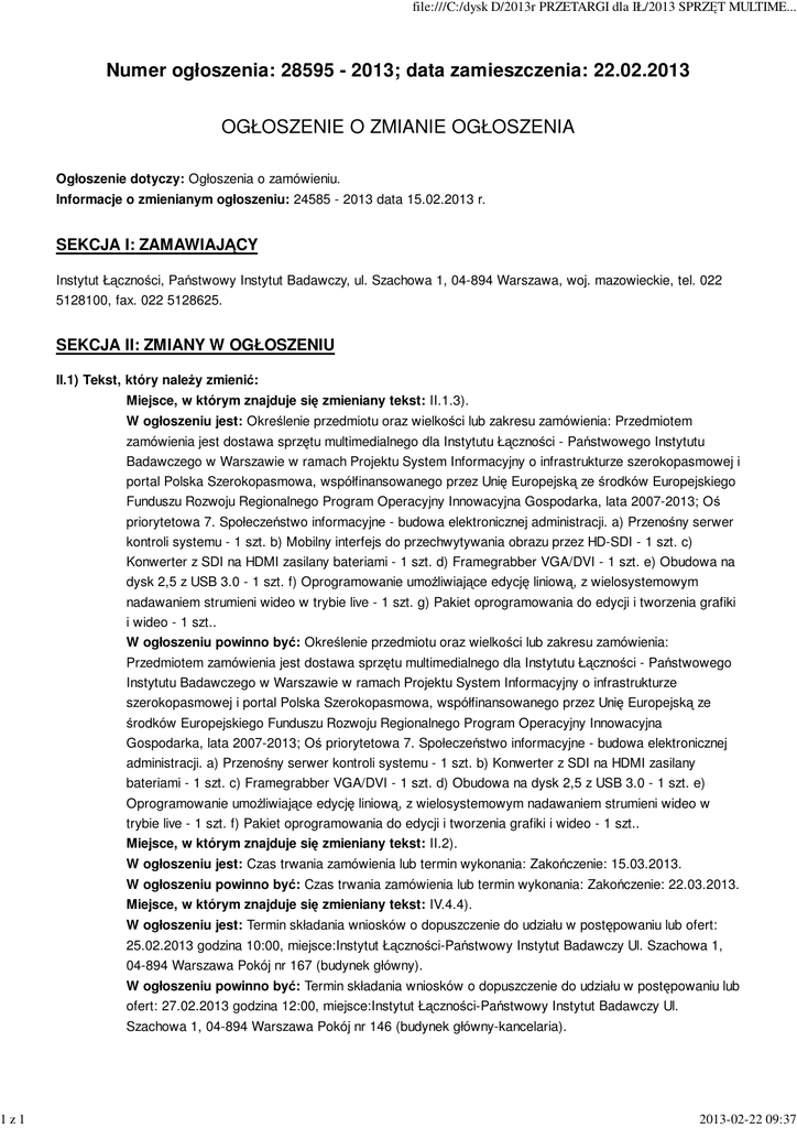 1z1 file:///C:/dysk D/2013r PRZETARGI dla IŁ/2013 SPRZĘT MULTIME... Numer ogłoszenia: 28595 - 2013; data zamieszczenia: 22.02.2013 OGŁOSZENIE O ZMIANIE OGŁOSZENIA Ogłoszenie dotyczy: Ogłoszenia o zamówieniu. Informacje o zmienianym ogłoszeniu: 24585 - 2013 data 15.02.2013 r. SEKCJA I: ZAMAWIAJĄCY Instytut Łączności, Państwowy Instytut Badawczy, ul. Szachowa 1, 04-894 Warszawa, woj. mazowieckie, tel. 022 5128100, fax. 022 5128625. SEKCJA II: ZMIANY W OGŁOSZENIU II.1) Tekst, który należy zmienić: Miejsce, w którym znajduje się zmieniany tekst: II.1.3). W ogłoszeniu jest: Określenie przedmiotu oraz wielkości lub zakresu zamówienia: Przedmiotem zamówienia jest dostawa sprzętu multimedialnego dla Instytutu Łączności - Państwowego Instytutu Badawczego w Warszawie w ramach Projektu System Informacyjny o infrastrukturze szerokopasmowej i portal Polska Szerokopasmowa, współfinansowanego przez Unię Europejską ze środków Europejskiego Funduszu Rozwoju Regionalnego Program Operacyjny Innowacyjna Gospodarka, lata 2007-2013; Oś priorytetowa 7. Społeczeństwo informacyjne - budowa elektronicznej administracji. a) Przenośny serwer kontroli systemu - 1 szt. b) Mobilny interfejs do przechwytywania obrazu przez HD-SDI - 1 szt. c) Konwerter z SDI na HDMI zasilany bateriami - 1 szt. d) Framegrabber VGA/DVI - 1 szt. e) Obudowa na dysk 2,5 z USB 3.0 - 1 szt. f) Oprogramowanie umożliwiające edycję liniową, z wielosystemowym nadawaniem strumieni wideo w trybie live - 1 szt. g) Pakiet oprogramowania do edycji i tworzenia grafiki i wideo - 1 szt.. W ogłoszeniu powinno być: Określenie przedmiotu oraz wielkości lub zakresu zamówienia: Przedmiotem zamówienia jest dostawa sprzętu multimedialnego dla Instytutu Łączności - Państwowego Instytutu Badawczego w Warszawie w ramach Projektu System Informacyjny o infrastrukturze szerokopasmowej i portal Polska Szerokopasmowa, współfinansowanego przez Unię Europejską ze środków Europejskiego Funduszu Rozwoju Regionalnego Program Operacyjny Innowacyjna Gospodarka, lata 2007-2013; Oś priorytetowa 7. Społeczeństwo informacyjne - budowa elektronicznej administracji. a) Przenośny serwer kontroli systemu - 1 szt. b) Konwerter z SDI na HDMI zasilany bateriami - 1 szt. c) Framegrabber VGA/DVI - 1 szt. d) Obudowa na dysk 2,5 z USB 3.0 - 1 szt. e) Oprogramowanie umożliwiające edycję liniową, z wielosystemowym nadawaniem strumieni wideo w trybie live - 1 szt. f) Pakiet oprogramowania do edycji i tworzenia grafiki i wideo - 1 szt.. Miejsce, w którym znajduje się zmieniany tekst: II.2). W ogłoszeniu jest: Czas trwania zamówienia lub termin wykonania: Zakończenie: 15.03.2013. W ogłoszeniu powinno być: Czas trwania zamówienia lub termin wykonania: Zakończenie: 22.03.2013. Miejsce, w którym znajduje się zmieniany tekst: IV.4.4). W ogłoszeniu jest: Termin składania wniosków o dopuszczenie do udziału w postępowaniu lub ofert: 25.02.2013 godzina 10:00, miejsce:Instytut Łączności-Państwowy Instytut Badawczy Ul. Szachowa 1, 04-894 Warszawa Pokój nr 167 (budynek główny). W ogłoszeniu powinno być: Termin składania wniosków o dopuszczenie do udziału w postępowaniu lub ofert: 27.02.2013 godzina 12:00, miejsce:Instytut Łączności-Państwowy Instytut Badawczy Ul. Szachowa 1, 04-894 Warszawa Pokój nr 146 (budynek główny-kancelaria). 2013-02-22 09:37