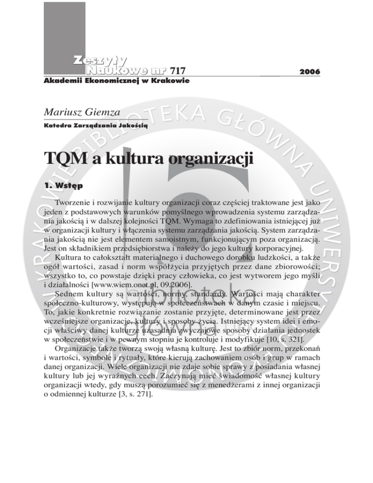 Zeszyty Naukowe nr 717 Akademii Ekonomicznej w Krakowie 2006 Mariusz Giemza Katedra Zarządzania Jakością TQM a kultura organizacji 1. Wstęp Tworzenie i rozwijanie kultury organizacji coraz częściej traktowane jest jako jeden z podstawowych warunków pomyślnego wprowadzenia systemu zarządzania jakością i w dalszej kolejności TQM. Wymaga to zdefiniowania istniejącej już w organizacji kultury i włączenia systemu zarządzania jakością. System zarządzania jakością nie jest elementem samoistnym, funkcjonującym poza organizacją. Jest on składnikiem przedsiębiorstwa i należy do jego kultury korporacyjnej. Kultura to całokształt materialnego i duchowego dorobku ludzkości, a także ogół wartości, zasad i norm współżycia przyjętych przez dane zbiorowości; wszystko to, co powstaje dzięki pracy człowieka, co jest wytworem jego myśli i działalności [www.wiem.onet.pl, 09.2006]. Sednem kultury są wartości, normy, standardy. Wartości mają charakter społeczno-kulturowy, występują w społeczeństwach w danym czasie i miejscu. To, jakie konkretnie rozwiązanie zostanie przyjęte, determinowane jest przez wcześniejsze organizacje, kultury i sposoby życia. Istniejący system idei i emocji właściwy danej kulturze uzasadnia zwyczajowe sposoby działania jednostek w społeczeństwie i w pewnym stopniu je kontroluje i modyfikuje [10, s. 321]. Organizacje także tworzą swoją własną kulturę. Jest to zbiór norm, przekonań i wartości, symbole i rytuały, które kierują zachowaniem osób i grup w ramach danej organizacji. Wiele organizacji nie zdaje sobie sprawy z posiadania własnej kultury lub jej wyraźnych cech. Zaczynają mieć świadomość własnej kultury organizacji wtedy, gdy muszą porozumieć się z menedżerami z innej organizacji o odmiennej kulturze [3, s. 271]. 60 Mariusz Giemza 2. Kultura organizacji Kulturę organizacji stanowi wzorzec zachowań obejmujących zbiór określonych norm, wartości, postaw i zasad postępowania, do których stosują się wszyscy pracownicy. Kultura ta jest integralną częścią firmy. To całość stosunków w grupie i postaw jej członków, uznawane przez nie wartości, przekonania, normy i sposoby poznawania [8, s. 14–15]. Kulturę korporacyjną danej firmy można określić na podstawie m.in. wspólnych zwyczajów, powiedzeń, sloganów, działań, odczuć, wystroju, uniformizacji, posługiwania się logo firmy, sposobów oceniania i nagradzania pracowników [9, s. 205]. Organizacje o dużych tradycjach mają zwykle ukształtowaną już własną kulturę. Rozwijała się ona w trakcie ich istnienia. Na tę kulturę ma wpływ kultura kraju i charakter działalności organizacji. Kultura jest przyswojonym produktem grupowych doświadczeń i może się ujawnić tylko tam, gdzie istnieje dająca się zdefiniować grupa mająca pewną historię. System zarządzania, zasada ciągłego doskonalenia wraz z właściwymi metodami i technikami są podstawowym napędem systemu TQM. Wdrożony system TQM generuje rozwiązania problemów i ulepszenia. Otwiera również pracowników na nowy sposób myślenia, udrożnia i pobudza ich inwencję, ośmiela do zmian, zamienia narzekanie na sformalizowaną procedurę poprawy. Staje się częścią kultury organizacji i działa jak język, za pomocą którego ludzie z różnych działów funkcjonalnych mogą się porozumieć. 3. Płaszczyzny piramidy TQM TQM w wizji rozwoju organizacji jest celem, który firma osiąga tylko drogą długookresowego planowania, przez wypracowanie i wdrażanie rocznych planów jakości, stopniowo doprowadzających do stanu, w którym wizja TQM staje się rzeczywistością. Jakość jest częścią tej rzeczywistości i w TQM ma na celu [1, s. 28]: – ciągłe spełnianie oczekiwań klientów, – osiągnięcie jakości przy niższych kosztach, – osiągnięcie kompleksowej jakości przez uczestnictwo wszystkich pracow ników. Celem nowej koncepcji TQM jest rozmyślne wskazanie na rolę zarządzania w samej definicji tego pojęcia. Włączenie zarządzania uniemożliwia kierownictwu uchylenie się od odpowiedzialności oraz nakazuje stworzenie systemu jakości, co staje się ich głównym zadaniem. TQM a kultura organizacji 61 Koncepcję TQM cechuje pięć zasad [1, s. 30]: zaangażowanie kierownictwa (przywództwo), koncentracja na klientach i pracownikach, koncentracja na faktach, ciągłe doskonalenia (kaizen), powszechne uczestnictwo. 4. Zaangażowanie kierownictwa Kultura organizacji nierozerwalnie łączy się z zarządzaniem przedsiębiorstwem zależnym od stylów kierowania i od kierownictwa. Istotnym zadaniem każdego kierownika jest określenie zarysu celów jakości, polityki jakości i planów jakości — zgodnie z czterema stronami piramidy TQM. Ze względu na swe znaczenie cele jakości i polityka powinny być jasne i zrozumiałe dla wszystkich pracowników w firmie. Ważne jest na przykład, by zgodnie z celami jakości zasadniczym celem firmy było zadowolenie zewnętrznych odbiorców i że można to osiągnąć tylko wówczas, gdy firma ma zdolność spełniania ich oczekiwań. Audit jakości jest ważną częścią wizji TQM. Naczelne kierownictwo może uzyskać konieczny wgląd w problemy, jakie w trakcie realizacji planów jakości miała organizacja tylko poprzez aktywny udział w audicie jakości. Przez aktywne uczestnictwo w auditach naczelne kierownictwo wykazuje, że rozumie przesłania TQM, co jest zasadniczym warunkiem opracowania i realizowania nowych i pełnych treści planów jakości. Aktywne uczestnictwo naczelnego kierownictwa jest również publicznym okazaniem swego zaangażowania, co wywiera pozytywny wpływ na całą organizację, gdy projektuje się nowe plany. Przypomina to pracownikom, że nie wyrób, a klient ma priorytetowe znaczenie [1, s. 31]. W każdym przedsiębiorstwie obowiązują pewne zasady, są wytyczone normy zachowań i określony system wartości, umiejętność właściwego ich rozpoznania 