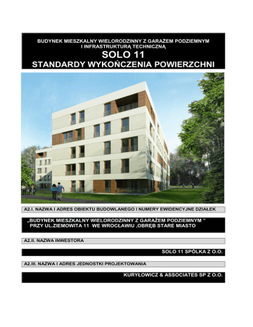 BUDYNEK MIESZKALNY WIELORODZINNY Z GARAŻEM PODZIEMNYM I INFRASTRUKTURĄ TECHNICZNĄ SOLO 11 STANDARDY WYKOŃCZENIA POWIERZCHNI A2.I. NAZWA I ADRES OBIEKTU BUDOWLANEGO I NUMERY EWIDENCYJNE DZIAŁEK „BUDYNEK MIESZKALNY WIELORODZINNY Z GARAŻEM PODZIEMNYM ” PRZY UL.ZIEMOWITA 11 WE WROCŁAWIU ,OBRĘB STARE MIASTO A2.II. NAZWA INWESTORA SOLO 11 SPÓLKA Z O.O. A2.III. NAZWA I ADRES JEDNOSTKI PROJEKTOWANIA KURYŁOWICZ & ASSOCIATES SP Z O.O. 1. MATERIAŁY WYKOŃCZENIOWE 1.1 Posadzki Hol główny wejściowy Płytki ceramiczne Klatki schodowe Płytki ceramiczne Korytarze Płytki ceramiczne Pomieszczenia mieszkalne Szlichta cementowa zbrojona siatką lub zbrojeniem rozproszonym. Pomieszczenia techniczne - garaż Gres techniczny Garaż podziemny Nadlewka betonowa ze zbrojeniem i dylatacjami skurczowymi z wykończeniem niepylącym – Sicafloor 263 SL – 1mm. Oznaczenia miejsc postojowych i ciągów komunikacyjnych - malowane. 1.2 Ściany Hol główny wejściowy Ściany wykończone tynkiem mineralnym. Na fragmentach zastosowano płyty HPL Fundermax . Klatki schodowe Ściany żelbetowe i murowane z bloczków silikatowych gr. 24cm, wykończone tynkiem mineralnym. Przedścianki instalacyjne z bloczków silikatowych gr. 12cm wykończone tynkiem. Korytarze Ściany wykończone tynkiem mineralnym. Pomieszczenia mieszkalne Ściany żelbetowe i murowane z bloczków silikatowych gr. 24cm (oddzielenie mieszkań) oraz murowane z bloczków silikatowych gr. 8 i 12cm (działowe w mieszkaniach) wykończone tynkiem maszynowym gipsowym. Pomieszczenia techniczne - garaż Ściany pomieszczeń tynkowane wyprawą cementowo-wapienną. Malowane farbą białą odporną na zarysowania, matową, zmywalną. Garaż podziemny Ściany garażu wykonane z żelbetu i murowane z bloczków silikatowych o powierzchni surowego betonu lub tynkowane i malowane. 1.3 Sufity Hol główny wejściowy Sufit podwieszany z płyt g-k z zamontowanym oświetleniem. Klatki schodowe Spoczniki- sufit podwieszany z płyt g-k z zamontowanym oświetleniem. Korytarze Sufit podwieszany z płyt g-k z zamontowanym oświetleniem. Pomieszczenia mieszkalne Sufity wykończone tynkiem maszynowym gipsowym Pomieszczenia techniczne - garaż Sufity stanowi surowy strop betonowy płyty filigranowej, w części izolowany termicznie wełną mineralną z okładziną z płyt strukturalnych cementowo-wiórowych. Garaż podziemny Sufity o powierzchni surowego betonu w kolorze szarym i białym, a pod częścią budynku izolowane wełną mineralną i płytą strukturalną cementowo wiórową. 1.4 Drzwi Hol główny wejściowy Drzwi do pomieszczeń przedsionka drewniane, przeszklone. Pomieszczenia mieszkalne Drzwi do lokali mieszkalnych w 2 klasie odporności na włamanie, z zamkami serii S firmy Schlage. Drzwi wewnątrzlokalowe do wykonania indywidualnego przez nabywcę lokalu. Pomieszczenia techniczne Drzwi do pomieszczeń technicznych stalowe, przeciwpożarowe EI 30, EI 60 według wymagań indywidualnych. Garaż podziemny Drzwi do pomieszczeń przedsionka oraz pomieszczeń technicznych stalowe, przeciwpożarowe EI 30, EI 60 według wymagań indywidualnych. Brama garażowa o szer. w świetle konstrukcji 500 x 205 cm - brama sterowana pilotem 1.5 Szyb windowy Szacht szybu dźwigu osobowego o monolitycznej konstrukcji żelbetowej. 1.6 Izolacja ścian zewnętrznych Wełna mineralna, nienasiąkliwa, montowana na tzw. kotwy ciepłe 1.7 Zagospodarowanie terenu Komunikacja piesza Główne dojście do budynku zapewnia chodniki wykończone płytami betonowymi. Ogrodzenie terenu Ogrodzenie terenu z przęseł stalowych, ażurowych, systemowych o wysokości ok. 1,8m. Zieleń Na terenie działki pozostawia się część zieleni rodzimej. Dodatkowo teren zostanie zagospodarowany zgodnie z projektem zieleni uwzględniającej charakter miejsca. Elementy małej architektury Na terenie usytuowane zostaną stalowe stojaki na rowery ocynkowane i malowane proszkowo, ławki stalowe oraz kosze na śmieci ze stali malowane proszkowo. Wszystkie wymienione elementy zabezpieczone przed kradzieżą. Na terenie zaprojektowany został plac zabaw. 1.8 Wyposażenie Dźwig osobowy Marki Otis. Instalacje sanitarne i technologiczne: instalacja wentylacji grawitacyjnej, instalacja wentylacji mechanicznej garażu, instalacja grzewcza, instalacja wodociągowa, instalacja hydrantowa garażu, instalacja ciepłej wody użytkowej, instalacja kanalizacji sanitarnej, instalacja kanalizacji deszczowej z odwodnieniem garażu podziemnego, Instalacje elektryczne i teletechniczne: instalacja zasilająca , instalacja oświetlenia i gniazd wtykowych, instalacja odgromowa, uziemiająca i wyrównawcza, okablowanie strukturalne instalacji telefonicznej, dostępu do Internetu, instalacja anteny zbiorczej RTV - SAT, system telewizji dozorowej obsługiwany z panelu video domofonu, system kontroli dostępu (zintegrowany z systemem video domofonu), Przedsionki klatek schodowych Wyposażenie holu wejściowego stanowią skrzynki na listy, tablica informacyjna mieszkańców montowane w ścianie G-K oraz wycieraczka wewnętrzna, zewnętrzna. Tablica informacyjna budynku Tablica informacyjna budynku z numerem, adresem i nazwą usytuowana na zewnątrz budynku. Okna i drzwi balkonowe konstrukcja drewniana konstrukcja z trójwarstwowego, klejonego drewna szklenie szybami zespolonymi (U=1,1), szkło bezpieczne P2 kolorystyka (wewnętrzna: biała, zewnętrzna: drewno w kolorze odpowiadającym płytom Fundermax) wyposażone w system nawiewny - nawiewniki higrosterowane Ogrzewanie Dla pomieszczeń mieszkalnych przyjęto grzejniki płytowe, podłączenie z wyjściem od ściany. Wielkość grzejników w zależności od zapotrzebowania na ciepło. W pomieszczeniach łazienek przyjęto grzejniki drabinkowe. Aparatura pomiarowa - Liczniki wody Zaprojektowano pomiary zużycia wody zimnej i ciepłej dla poszczególnych mieszkań. Liczniki wody ciepłej i zimnej umieszcza się w szachcie pomiarowym przy klatce schodowej odpowiedniej kondygnacji, a 