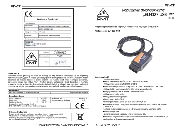 - URZĄDZENIE DIAGNOSTYCZNE „ELM327 USB ™” Ver. 01 Urządzenie przeznaczone do diagnostyki samochodowej przy uŜyciu komputera PC Widok ogólny ELM 327 USB GWARANCJA. Producent udziela gwarancji na okres 12 miesięcy od daty zakupu i zobowiązuje się do bezpłatnej naprawy urządzenia, jeŜeli w okresie tym wystąpią wady z winy producenta. Wadliwe urządzenie naleŜy dostarczyć do miejsca zakupu w stanie czystym i na własny koszt wraz z niniejszą gwarancją, paragonem zakupu lub fakturą VAT i krótkim opisem uszkodzenia. Koszt demontaŜu i montaŜu urządzenia ponosi uŜytkownik. Gwarancja nie obejmuje baterii w pilotach oraz wszystkich uszkodzeń powstałych w wyniku nieprawidłowego uŜytkowania, samowolnych regulacji, przeróbek i napraw. Producent: AMT, 57-100 Strzelin, ul. DzierŜoniowska 14 Wyprodukowano w Polsce Dane techniczne: Napięcie zasilania 12V OBD Pobór prądu 45mA Port komunikacyjny USB 5V Urządzenie to spełnia wymogi dyrektyw EMC 2004/108/EC kompatybilność elektromagnetyczna Środowisko pracy Oprogramowanie Hardware Windows XP V1.5 Ochrona środowiska Produkt ten nie moŜe być traktowany jako odpad domowy i wrzucony do śmieci. Aby chronić środowiska naturalne zapewnij prawidłową utylizacje. Informacje dotyczące recyklingu niniejszego produktu otrzymasz w punkcie sprzedaŜy lub u przedstawicieli władz lokalnych. DIAGNOSTYKA SAMOCHODOWA™ Funkcjonalność: Interfejs pozwala na: • Odczyt i kasowanie błędów OBD-II - wszystkie protokoły • Odczyt i kasowanie lampki CHECK ENGINE • Monitorowanie parametrów pracy silnika w czasie rzeczywistym - LIVE DATA • Odczyt kodów oczekujących i charakterystycznych producenta • Podgląd ZAMROZONYCH RAMEK - FREEZE FRAMES • Odczyt parametrów online • Odczyt błędów według kodów • Pomiar mocy silnika (KM) • Pomiar parametrów takich jak czas od 0-100 km/h itd. • Pozwala adaptować i korygować niektóre urządzenia w samochodzie: kąt wtrysku, przepustnica, regulacja obrotów i zapłonu, dawka wtrysku przy rozruchu, uchylenie EGR) • Kodowanie pilotów • Zmiana zapisanego przebiegu auta (w liczniku i w ECU • UmoŜliwia diagnozowanie wszystkich systemów elektronicznych w samochodzie (w zaleŜności od uŜytego oprogramowania) ELM 327 USB ™ Oprogramowanie, które współpracuje z ELM 327 USB: • Scantool.net • Polski Vag 4.9 • Engine Check • GM Mode 22 Scan Tool by Terry • OBD Gauge for PalmOS and Pocket PC by Dana Peters • OBD Logger by Jonathan Senkerik • OBD-II ScanMaster • obd2crazy.com • OBD2 Scantool by Ivan Andrzejewski • OBDII for ELM322 by David Huffman • pyOBD by Donour Sizemore • RDDTC by Pete Calinski • Real Scan by Brent Harris • ScanTest for Pocket PC by Ivan Ganev • wOBD by WDT • easy OBD • DigiMoto • PCMSCAN (umoŜliwia m.in. pomiar mocy i czasow) • i wieloma innymi darmowymi i płatnymi programami równieŜ w wersji PL Podłączenie i obsługa Korzystanie z interfejsu diagnostycznego jest niezwykle proste. Urządzenie z jednej strony podłączamy do złącza diagnostycznego w samochodzie, a z drugiej strony do dowolnego komputera PC wyposaŜonego w złącze USB (przy pierwszym podłączeniu do komputera naleŜy zainstalować sterowniki – instrukcja poniŜej). Po prawidłowym podłączeniu wybieramy dowolny program diagnostyczny współpracujący z kablem i włączamy zapłon. Interfejs sam wybierze odpowiedni protokół aby móc połączyć się z autem. Instalacja sterowników Instalacja i ustawienie sterownika interfejsu [na przykładzie Windows XP] Aby móc uŜywać interfejsu, naleŜy zainstalować odpowiednie sterowniki VCP dostępne na stronie http://www.ftdichip.com/Drivers/VCP.htm DIAGNOSTYKA SAMOCHODOWA™ Sterowniki moŜna pobrać na róŜne platformy systemowe. W przypadku sterowników na platformę Windows polecamy ściągnąć automatyczny instalator sterowników klikając odnośnik „setup executable” Uwagi instalacyjne • NaleŜy pamiętać aby po zainstalowaniu i skonfigurowaniu interfejsu wpiętego w wybrany port USB uŜywać tego portu juŜ zawsze. Wpięcie kabla w inny port USB wymusza przeprowadzenie ponownej konfiguracji interfejsu • Oprogramowanie diagnostyczne wykryje interfejs tylko wtedy gdy zostanie on poprawnie skonfigurowany oraz gdy interfejs będzie wpięty w port diagnostyczny samochodu i kluczyk będzie przekręcony w pozycję ZAPŁON. • Podczas podłączania kabla do samochodu i komputera naleŜy zachować następującą kolejność: podłączenie kabla do wtyku ODB2 samochodu; włoŜenie drugiego końca kabla do portu USB komputera; przekręcenie kluczyka samochodu w pozycję ZAPŁON. Odłączanie interfejsu powinno odbywać się w odwrotnej kolejności co jego podłączenie. • Podczas pracy z interfejsem moŜna usłyszeć charakterystyczne „tykanie”. Jest to normalny objaw poprawnej pracy urządzenia i nie naleŜy się nim przejmować Wymagania sprzętowe PC • Auto zgodne ze specyfikacja OBD2 • Gniazdo OBD2 w samochodzie • Komputer klasy Pentium • Port USB w komputerze, laptopie, Pocket-PC (PDA) • Windows CE, 95, 98, Me, 2000, XP, Vista 32/64bit, 7 32/64bit, Mac 1.Obsugiwane protokoły • J1850 PWM (41.6 kbaud) • J1850 VPW (10.4 kbaud) • ISO 9141-2 (5 baud init, 10.4 kbaud) • ISO KWP (5 baud init, 10.4 kbaud) • ISO KWP (fast init, 10.4 kbaud) • ISO CAN (11 bit ID, 500 kbaud) • ISO CAN (29 bit ID, 500 kbaud) • ISO CAN (11 bit ID, 250 kbaud) • ISO CAN (29 bit ID, 250 kbaud) ELM 327 USB ™