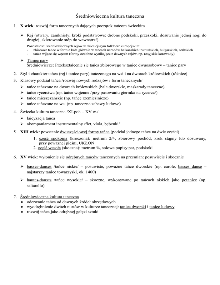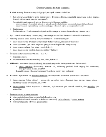 Średniowieczna kultura taneczna 1. X wiek: rozwój form tanecznych dających początek tańcom świeckim Rej (otwary, zamknięty; kroki podstawowe: drobne podskoki, przeskoki, dosuwanie jednej nogi do drugiej, skierowanie stóp do wewnątrz!) Pozostałości średniowiecznych rejów w dziesiejszym folklorze europejskim: - zbiorowe tańce w formie koła głównie w tańcach narodów bałkańskich: rumuńskich, bułgarskich, serbskich - tańce wijące się wężem (formy ozdobne wynikające z dawnych rejów, np. rosyjskie korowody) Taniec pary Średniowiecze: Przekształcenie się tańca zbiorowego w taniec dwuosobowy – taniec pary 2. Styl i charakter tańca (rej i taniec pary) tańczonego na wsi i na dworach królewskich (różnice) 3. Klasowy podział tańca /rozwój nowych rodzajów i form tanecznych/ tańce tańczone na dworach królewskich (bale dworskie, maskarady taneczne) tańce rycerstwa (np. tańce wojenne /przy pasowaniu giermka na rycerza/) tańce mieszczańskie (np. tańce rzemieślnicze) tańce tańczone na wsi (np. taneczne zabawy ludowe) 4. Świecka kultura taneczna /XI-poł. – XV w./ laicyzacja tańca akompaniament instrumentalny /flet, viola, bębenki/ 5. XIII wiek: powstanie dwuczęściowej formy tańca (podział jednego tańca na dwie części) 1. część spokojna (kroczona): metrum 2/4, zbiorowy pochód, krok stąpny lub dosuwany, przy poważnej pieśni, UKŁON 2. część wesoła (skoczna): metrum ¾, solowe popisy par, podskoki 6. XV wiek: wyłonienie się odrębnych tańców tańczonych na przemian: posuwiście i skocznie basses-danses /tańce niskie/ – posuwiste, poważne tańce dworskie (np. carole, basses danse – najstarszy taniec towarzyski, ok. 1400) hautes-danses /tańce wysokie/ – skoczne, wykonywane po tańcach niskich jako potaniec (np. saltarello). 7. Średniowieczna kultura taneczna ♦ oderwanie tańca od dawnych źródeł obrzędowych ♦ wyodrębnienie dwóch nurtów w kulturze tanecznej: taniec dworski i taniec ludowy ♦ rozwój tańca jako odrębnej gałęzi sztuki