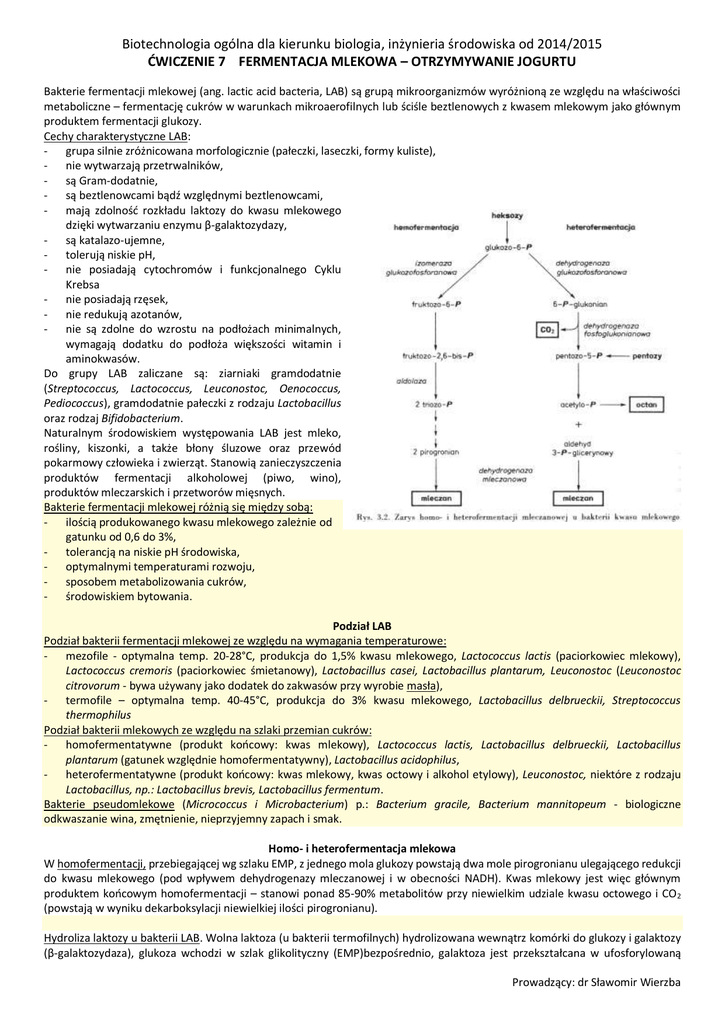 Biotechnologia ogólna dla kierunku biologia, inżynieria środowiska od 2014/2015 ĆWICZENIE 7 FERMENTACJA MLEKOWA – OTRZYMYWANIE JOGURTU Bakterie fermentacji mlekowej (ang. lactic acid bacteria, LAB) są grupą mikroorganizmów wyróżnioną ze względu na właściwości metaboliczne – fermentację cukrów w warunkach mikroaerofilnych lub ściśle beztlenowych z kwasem mlekowym jako głównym produktem fermentacji glukozy. Cechy charakterystyczne LAB: - grupa silnie zróżnicowana morfologicznie (pałeczki, laseczki, formy kuliste), - nie wytwarzają przetrwalników, - są Gram-dodatnie, - są beztlenowcami bądź względnymi beztlenowcami, - mają zdolność rozkładu laktozy do kwasu mlekowego dzięki wytwarzaniu enzymu β-galaktozydazy, - są katalazo-ujemne, - tolerują niskie pH, - nie posiadają cytochromów i funkcjonalnego Cyklu Krebsa - nie posiadają rzęsek, - nie redukują azotanów, - nie są zdolne do wzrostu na podłożach minimalnych, wymagają dodatku do podłoża większości witamin i aminokwasów. Do grupy LAB zaliczane są: ziarniaki gramdodatnie (Streptococcus, Lactococcus, Leuconostoc, Oenococcus, Pediococcus), gramdodatnie pałeczki z rodzaju Lactobacillus oraz rodzaj Bifidobacterium. Naturalnym środowiskiem występowania LAB jest mleko, rośliny, kiszonki, a także błony śluzowe oraz przewód pokarmowy człowieka i zwierząt. Stanowią zanieczyszczenia produktów fermentacji alkoholowej (piwo, wino), produktów mleczarskich i przetworów mięsnych. Bakterie fermentacji mlekowej różnią się między sobą: - ilością produkowanego kwasu mlekowego zależnie od gatunku od 0,6 do 3%, - tolerancją na niskie pH środowiska, - optymalnymi temperaturami rozwoju, - sposobem metabolizowania cukrów, - środowiskiem bytowania. Podział LAB Podział bakterii fermentacji mlekowej ze względu na wymagania temperaturowe: - mezofile - optymalna temp. 20-28°C, produkcja do 1,5% kwasu mlekowego, Lactococcus lactis (paciorkowiec mlekowy), Lactococcus cremoris (paciorkowiec śmietanowy), Lactobacillus casei, Lactobacillus plantarum, Leuconostoc (Leuconostoc citrovorum - bywa używany jako dodatek do zakwasów przy wyrobie masła), - termofile – optymalna temp. 40-45°C, produkcja do 3% kwasu mlekowego, Lactobacillus delbrueckii, Streptococcus thermophilus Podział bakterii mlekowych ze względu na szlaki przemian cukrów: - homofermentatywne (produkt końcowy: kwas mlekowy), Lactococcus lactis, Lactobacillus delbrueckii, Lactobacillus plantarum (gatunek względnie homofermentatywny), Lactobacillus acidophilus, - heterofermentatywne (produkt końcowy: kwas mlekowy, kwas octowy i alkohol etylowy), Leuconostoc, niektóre z rodzaju Lactobacillus, np.: Lactobacillus brevis, Lactobacillus fermentum. Bakterie pseudomlekowe (Micrococcus i Microbacterium) p.: Bacterium gracile, Bacterium mannitopeum - biologiczne odkwaszanie wina, zmętnienie, nieprzyjemny zapach i smak. Homo- i heterofermentacja mlekowa W homofermentacji, przebiegającej wg szlaku EMP, z jednego mola glukozy powstają dwa mole pirogronianu ulegającego redukcji do kwasu mlekowego (pod wpływem dehydrogenazy mleczanowej i w obecności NADH). Kwas mlekowy jest więc głównym produktem końcowym homofermentacji – stanowi ponad 85-90% metabolitów przy niewielkim udziale kwasu octowego i CO 2 (powstają w wyniku dekarboksylacji niewielkiej ilości pirogronianu). Hydroliza laktozy u bakterii LAB. Wolna laktoza (u bakterii termofilnych) hydrolizowana wewnątrz komórki do glukozy i galaktozy (β-galaktozydaza), glukoza wchodzi w szlak glikolityczny (EMP)bezpośrednio, galaktoza jest przekształcana w ufosforylowaną Prowadzący: dr Sławomir Wierzba Biotechnologia ogólna dla kierunku biologia, inżynieria środowiska od 2014/2015 ĆWICZENIE 7 FERMENTACJA MLEKOWA – OTRZYMYWANIE JOGURTU glukozę w szlaku Leloira. Ufosforylowana laktoza (u bakterii mezofilnych) jest hydrolizowana przez fosfo-β-galaktozydazę do glukozy i galaktozo-6-fosforanu, który następnie jest przekształcany do fosfodihydroksyacetonu i aldehydu trifosfoglecerynowego (szlak tagatozowy) i w takiej postaci są włączane do szlaku EMP. W przypadku heterofermentacji glukoza ulega glikolizie w szlaku HMP, a częściowo w szlaku EMP. W wyniku tych przemian na każdy mol kwasu mlekowego powstaje dodatkowo 1 mol etanolu lub kwasu octowego oraz 1 mol dwutlenku węgla. Końcowym produktem heterofermentacji jest więc tylko w około 50% kwas mlekowy. Pozostałe metabolity stanowią głównie kwas octowy, etanol i CO2. Ponadto, w trakcie fermentacji mlekowej u obu typów bakterii powstają śladowe ilości dodatkowych produktów ubocznych nadających charakterystyczne cechy organoleptyczne powstającym produktom fermentacji: diacetyl, acetoina, aldehyd octowy, w mniejszych ilościach: kwasy lotne (propionowy, mrówkowy), lotne kwasy tłuszczowe, alkohole, aceton i estry. Na przykład Streptococcus diacetilactis, pałeczka heterofermentatywna, wytwarza niewielkie ilości kwasu octowego, etanolu oraz diacetylu – związek ten odpowiada za powstawanie świeżego zapachu masła. Specyficzny rodzaj heterofermentacji mlekowej przeprowadzają bifidobakterie – jest to to szlak fosfoketolazy pentozowej. Ten odrębny szlak jest wynikiem obecności u bifidobakterii specyficznych enzymów zastępujących kluczowe enzymy odpowiedzialne za przeprowadzanie typowej fermentacji mlekowej. Sumaryczny schemat heterofermentacji typu Bifidobacterium przedstawia się następująco: 2 C6H12O6 → 2 CH3-CHOH-COOH + 3 CH3COOH glukoza kwas mlekowy kwas octowy Charakterystyka LAB Rodzaj Lactobacillus: L. acidophilus, L. amylovorus, L. casei, L. crispatus, L. gasseri, L. johnsonii, L. paracasei, L. plantarum, L. reuteri, L. rhamnosus. - Grupa I bezwzględnie homofermentatywne (fermentują heksozy do kwasu mlekowego, pentozy i glukonian nie fermentują). Obejmuje 15 gatunków, z których tylko: L. delbrueckii, L. helveticus, L. acidophilus są wykorzystywane w mleczarstwie. 