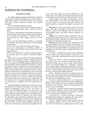 178 Pol. J. Sport Tourism 2011, 18, 178-182 Pol. J. Sport Tourism 2011, 18, 172-177 Hosek et al.: FAIR PLAY W TRENINGU SPORTOWYM... Guidelines for Contributors Instruction to Authors The Polish Journal of Sport and Tourism publishes manuscripts in Polish and English from various fields of medical and natural as well as humanistic sciences linked with sport, physical education, tourism and physical recreation. It covers the following types of papers: − original research papers (maximum 12 standard pages of typescript, including tables, figures, references and abstract), − review papers commissioned by the Editor (maximum 20 standard pages of typescript, including documentation), − short communications (maximum 3 standard pages of typescript plus one table or figure and up to 5 references), − Letters to the Editor delivering an opinion or a comment to published manuscripts (maximum 2 standard pages of typescript), − Note to the discussion connected with journal’s issues, − Current news (information on conferences, abstracts of Ph.D. theses and Post-Doc. theses, book reviews, biographical notes), − advertisements that may be covered on separate pages of the quarterly (prices are subject to individual negotiations). Papers must be accompanied by the following submission letter (form available at journal’s website), signed by all Authors: “The undersigned Authors transfer the ownership of copyright to the Polish Journal of Sport and Tourism should their work be published in this journal. Authors state that the article is original, has not been submitted for publication in other journals and has not already been published except in abstract form, preliminary report or thesis. Authors state that they are responsible for the research that they have carried out and designed; that they have participated in drafting and revising the manuscript submitted, which they approve in its contents. Authors also state that the reported article (if it involves human experiments) has been approved by the appropriate ethical committee and was undertaken in compliance with The Helsinki Declaration.” Papers submitted for publication should be sent to the Editorial Office in duplicate typescripts in A4 format. They should be single-page typed in Times New Roman (12 points), with the following margins: 3 cm on the left, 2 cm on the right, 2 cm on the top and 2 cm on the bottom, with 1.5 line spacing, without justification nor formatting. Indentations should be made of 3 characters not using a tabulator. Subsequent pages should be numbered with a pencil. Authors are recommended to enclose an electronic form of the manuscript (CD-ROM disc) prepared in WORD XP2007 text editor. The disc should be labeled with the name of the file containing the manuscript (acceptable file for- mats: *.doc). Manuscripts may also be submitted via electronic mail (a cover letter with attached manuscript) to the e-mail address provided at the end of Instruction to Authors. Research papers and short communications will be sent anonymously to two reviewers. Depending on the reviewers’ opinion, the Editors will make a decision on their acceptance or rejection. The Editors’ decision is ultimate. Title page. The title page should contain: title of the paper, short title (maximum 40 characters), first and last names of authors with affiliation, first and last name of corresponding author with postal address, telephone, fax and e-mail. Abstract (up to 250 characters) consisting of the following sections: justification and aim of the study, material and methods, results, conclusions as well as 3-6 key words, should be provided before the body text. Body text should be sectioned into: Introduction, Material and Methods, Results, Discussion, Conclusions, Acknowledgements (if necessary), and Literature. In articles of other types, the text should follow in a logical sequence and headings of its particular sections should reflect issues discussed therein. Introduction – should be short and concise; it should introduce readers into research problems addressed in the study as well justify undertaking the research and specify its objective. Material and methods – should describe the subject of the study (in the case of human subjects data should include their number, age, sex and any other typical characteristics) and methods applied in a sufficiently exhaustive way to enable readers to repeat the experiments or observations. For generally known methods only references should be given, whereas detailed descriptions are to be provided for new or substantially modified methods. Results – should be presented in a logical sequence in the text, tables and figures. Data collated in tables and figures should not be repeated in the text which should summarize the most important observations. Discussion – should emphasize new or important aspects of experimental results and discuss their implications. Results of own studies are to be compared with findings described in the respective domestic and international references used by the Authors. Conclusions – should be stated in points or descriptively and should be logically connected with objectives stated in the Introduction. Statements and conclusions not derived from own observations should be avoided. Acknowledgements – should list persons or institutions that helped the Author(s) in preparing the manuscript or provided financial support or technical assistance. Literature – should list only to those quoted in the text and connected directly with the topic of the study (not more than 25 references in original papers and not more GUIDELINES FOR CONTRIBUTORS than 50 references in review papers). They should be presented in the order, in which they are cited in the text. In quoting them in the text only their respective number from the list of Literature should be given in parentheses. References quoted in tables and figures are to be included in the list of Literature. Non-