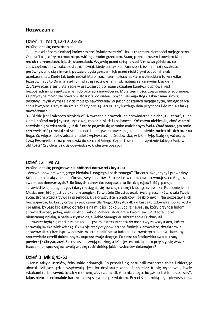 Rozważania Dzień: 1 Mt 4,12-17.23-25 Prośba: o łaskę nawrócenia. 1. „…mieszkańcom cienistej krainy śmierci światło wzeszło”. Jezus rozprasza ciemności mojego serca. On jest Tym, który ma moc rozprawić się z moim grzechem. Stanę przed Jezusem i powiem Mu o moich ciemnościach, lękach, słabościach. Wyjawię przed sobą i przed Nim szczególnie to, co zauważyłem/am w trakcie ostatnich świąt, kiedy spotykałem/am się z bliskimi: moją zazdrość, porównywanie się z innymi, poczucie bycia gorszym, lęk przed niektórymi osobami, brak przebaczenia… Kiedy tak będę mówił Mu o moich ciemnościach aktem woli oddam to wszystko Jezusowi, aby to On miał nad tym władzę i rozświetlał mrok mojego serca swoim blaskiem… 2. „Nawracajcie się”. Stanięcie w prawdzie co do mojej aktualnej kondycji duchowej jest bezpośrednim przygotowaniem do przyjęcia nawrócenia. Moje ciemności, często nieuświadomione, są przyczyną moich zachowań w stosunku do siebie, innych i samego Boga. Jakie czyny, słowa, postawy i myśli wymagają dziś mojego nawrócenia? W jakich obszarach mojego życia, mojego serca chciałbym/chciałabym się zmienić? Czy proszę Jezusa, aby każdego dnia przychodził do mnie z łaską nawrócenia? 3. „Bliskie jest królestwo niebieskie”. Nawrócenie prowadzi do doświadczenia nieba „tu i teraz”, tu na ziemi, pośród mojej sytuacji życiowej, moich bliskich i znajomych. Królestwo niebieskie, choć w pełni rozwinie się w wieczności, już dziś może pojawić się w moim codziennym życiu. Choć otaczająca mnie rzeczywistość pozostaje niezmieniona, ja odkrywam nowe spojrzenie na siebie, moich bliskich oraz na Boga. Co więcej, doświadczana radość wpływa też na środowisko, w jakim żyję. Staję się wówczas żywą Ewangelią, która przemawia do serca bliźniego. Czy jest we mnie pragnienie takiego życia w obfitości? Czy chcę już dziś doświadczyć królestwa bożego? Dzień : 2 Ps 72 Prośba: o łaskę przyjmowania obfitości darów od Chrystusa „Wyzwoli bowiem wołającego biedaka i ubogiego i bezbronnego” Chrystus jako jedyny i prawdziwy Król napełnia całą ziemię obfitością swych darów. Zobacz jak wiele darów otrzymujesz od Boga w swoim codziennym życiu? Ile Bożych darów dostrzegasz, a za ile dziękujesz?. Bóg panuje sprawiedliwie, a Jego rządy i dary rozciągają się na całą naturę i każdego człowieka. Podobnie jest z Mesjaszem, który jest opiekunem ubogich. To właśnie Chrystus ocala życie grzeszników, ocala Twoje życie. Broni przed krzywdą i przemocą. Dba o wszystkich biedaków i bezbronnych. Nie pozostawia ich bez wsparcia, bo każdy człowiek jest cenny dla Niego. Chrystus dba o każdego człowieka, bo go kocha i pragnie, by Jego królestwo oprało się na miłości i pokoju. Spójrz na Jezusa, który przynosi ludom sprawiedliwość, pokój, miłosierdzie, miłość. Zobacz jak działa w twoim życiu? Otacza Ciebie nieustanną opieką, a nade wszystko daje Siebie Samego w sakramencie Eucharystii. „… zawsze będą się modlić za niego…” – psalm jest też zachętą do modlitwy za wszystkich, którzy sprawują jakąkolwiek władzę. By swoje rządy czy powierzone funkcje kierownicze, dyrektorskie sprawowali mądrze i sprawiedliwie. Warto modlić się za ludzi na kierowniczych stanowiskach, by rzeczywiście czynili dobro innym, poprzez swoje decyzje. Popatrz na środowisko swojej pracy i powierz je Chrystusowi. Spójrz też na swoją rodzinę, a jeśli jesteś rodzicem to przyjrzyj się wraz z Jezusem jak sprawujesz swoją władzę rodzicielską, jakich wyborów dokonujesz? Dzień 3 Mk 6,45-51 1. Jezus odsyła uczniów, żeby sobie odpoczęli. Bo przecież się natrudzili roznosząc chleb i zbierając ułomki. Miejsce, gdzie wypływają, jest im doskonale znane ? przecież tu się wychowali, bycie rybakami to ich zawód. Idealny moment, aby nabrać sił. A tu nic z tego, bo „wiatr był im przeciwny”. Jakoś nieproporcjonalnie bardzo męczą się walcząc z wiatrem. Przecież nie robią tego pierwszy raz… Scenę tę można zinterpretować też symbolicznie. Wiatr – ruah, jest obrazem ducha, ale też duszy człowieka. Zatem duch był im przeciwny, czyli w ich duszach było wiele sprzecznych odczuć. Nie bardzo wiedzieli, co z nimi zrobić. Z nami jest podobnie. Przychodzą takie momenty, kiedy zmagamy się ze sobą, z ludźmi, z Bogiem. Kiedy wszystko wydaje się być przeciwne naszym zamiarom. Przypomnij sobie takie momenty. Jak się czułeś? Co myślałeś o Bogu? 2. Jezus wychodzi na górę. Na pierwszy rzut oka, trochę to dziwne. Zmęczony, a jeszcze się wspina. Podobno ze wzgórza, na które wyszedł Jezus, widać całe jezioro. Wszystko jak na dłoni. Jezus idzie się modlić, spotkać z Ojcem, ale jednocześnie „ma na oku” apostołów. Czuwa nad nimi. Oni się zmagają, jakby bez pomocy Jezusa, ale tak naprawdę jest inaczej… Zatrzymaj się na chwilę nad sceną modlitwy Jezusa. Popatrz na Niego. Co wyraża Jego postawa? Może słyszysz, jakie słowa wypowiada? Pomyśl o swojej modlitwie, kiedy jest Ci najtrudniej. Kiedy jesteś bardzo zmęczony, rozdrażniony, przybity. Jak ona wygląda? Jaka jest wtedy Twoja postawa wobec Ojca? 3. Jezus przychodzi do uczniów po jeziorze. Zjawia się nad ranem. Co więcej – robi coś, czego żaden człowiek nie mógłby dokonać. Chodzi po wodzie. W Starym Testamencie tylko Bóg mógł chodzić po wodzie. Zatem przez to, jak przychodzi – po raz kolejny objawia uczniom Kim jest. A ci w pierwszej chwili Go nie poznają. Jeszcze bardziej zaczynają się bać. Nie dość, że walczą z przeciwnym wiatrem, to jeszcze to… Dopiero, gdy Jezus odzywa się do nich, wszystko się zmienia w nastroju sceny. Zaraz wchodzi do łodzi i nagle wiatr przestaje być przeciwnikiem. Przypomnij sobie momenty, chodziłeś z dala od Boga. Kiedy popełniałeś grzech, a z tym mógł iść w parze lęk przed sobą, Bogiem, drugim cz