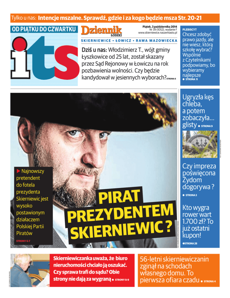 Tylko u nas: Intencje mszalne. Sprawdź, gdzie i za kogo będzie msza Str. 20-21 Piątek, 3 października 2014 Nr 39 (1052), wydanie F www.skierniewice.naszemiasto.pl PLEBISCYT Chcesz zdobyć prawo jazdy, ale nie wiesz, którą szkołę wybrać? Wspólnie z Czytelnikami podpowiamy, bo wybieramy najlepsze S K I E R N I E W I C E • ŁOW I C Z • R AWA M A ZOW I EC K A Dziś u nas: Włodzimierz T., wójt gminy Łyszkowice od 25 lat, został skazany przez Sąd Rejonowy w Łowiczu na rok pozbawienia wolności. Czy będzie kandydował w jesiennych wyborach? STRONA 6 a STRONA 11 Ugryzła kęs chleba, a potem zobaczyła... glisty FOT. SŁAWOMIR BURZYŃSKI a STRONA 9 FOT. ROMAN BEDNAREK STRONY 6-7 PIRAT M E T N E D PREZY ? C I W E I N SKIER Skierniewiczanka uważa, że biuro nieruchomości chciało ją oszukać. Czy sprawa trafi do sądu? Obie strony nie dają za wygraną a STRONY 8-9 Czy impreza poświęcona Żydom dogorywa ? a STRONA 3 FOT. FACEBOOK.COM/SLOWINSKITOMASZ b Najnowszy pretendent do fotela prezydenta Skierniewic jest wysoko postawionym działaczem Polskiej Partii Piratów Kto wygra rower wart 1.700 zł? To już ostatni kupon! aSTRONA 28 56-letni skierniewiczanin zginął na schodach własnego domu. To pierwsza ofiara czadu a STRONA 4 ITS Piątek, 3 października 2014 Z DRUGIEJ STRONY Pogoda Od redaktora SOBOTA Agnieszka Kubik Kto zadba o cmentarze ŚRODA min. min. 3° 3° 3° 3° 4° maks. maks. maks. maks. maks. 14° 14 ° 13° 14° 16° FOT. ARCHIWUM Dominik Moskwa b W Państwowej Wyższej Szkole Zawodowej odbyła się inauguracja roku akademickiego 2014/2015. Na uczelni wiedzę zdobywa 1.284 studentów na ośmiu kierunkach w trybie dziennym i zaocznym. W tym roku studia rozpoczęło 367 osób. Kierunki cieszące się największym zainteresowaniem to bezpieczeństwo wewnętrzne oraz finanse i rachunkowość. W Wyższej Szkole Ekonomiczno-Humanistycznej uroczystość inauguracyjna odbędzie się w najbliższą sobotę. bed Wywalczyli więcej autobusów Skierniewice Wiesława Maciejak na Festiwalu Literatury Kobiecej w Siedlcach za swoją powieść „...a życie się toczy” zdobyła główną nagrodę Polonii. VFOT. MAGDALENA GALICZEK-KREMPA Skierniewice Agnieszka Kubik [email protected] www.dzienniklodzki.pl, e-mail: [email protected] WTOREK min. WójtgminySkierniewiceobiecałpomócmieszkańcowiBud Grabskich,doktórego podeszczachniemożedojechaćsamochódspółkiEko-Region,abyodebraćśmieci.Rozwiązanieproblemumiałopolegaćnawykonaniuprzepustu wdrodze,abywodyzbagien przyKorabiewcemogłyswobodnieodpływaćdoRawki orazpodniesieniudrogiprzez nawiezieniejejtłuczniem. Pierwszaobietnicapadłazjegoustwmaju2014r.Druga ponadtydzieńtemu.Sprawa miałabyćzałatwionawciągu tygodnia.Niejest. Pani Wiesia z nagrodą Nagrodajestprzyznawanaprzez polonijne blogerki. Skierniewiczankapokonałacztery inne powieści nominowane do tej nagrody: „Magnolia” Grażyny Jeromin-Gałuszka (ta powieść zdobyła pierwsze miejsce w kategorii „Pióro” czyli jest najlepszą powieścią roku 2013), „Modliszka” Ireny Matuszkiewicz, „Nalewka zapomnienia” Katarzyny BuliczKasprzak oraz „Trup zNottingham”SaszyHady.–Bardzosię cieszę,żezostałamwten sposób wyróżniona, choć z dru- PONIEDZIAŁEK min. Skierniewice Z cmentarzami mamy w Skierniewicach problem. Zadbany jest cmentarz komunalny, bo ma sprawnego zarządcę oraz św. Stanisława, głównie dzięki aktywności młodzieży, która ściągnięta ze szkół uprzątnie czasem zabytkowe mogiły. Ale dzieciaków nie poprosi się już przecież, by skosiły chaszcze na kirkucie, a urzędnikom łatwiej jest zorganizować raz w roku imprezę poświęconą pamięci dawnych mieszkańców Skierniewic niż częściej niż raz w roku zadbać o miejsce spoczynku ich przodków. Podobnie jest z cmentarzem św. Józefa, gdzie brak dobrego gospodarza widać na każdym kroku. Znów usłyszymy od jego administratorów, że „dziennikarze szukają sensacji?”. Jeśli śmieci rozwiewane przez wiatr, nieprzycięte drzewa, błotniste alejki i zardzewiałe ogrodzenie nie są faktem, tylko tanią sensacją, to tak. NIEDZIELA min. FOT. EDYTA CIEŚLAK 02//tygodnik bWiesława Maciejak podczas odbioru nagrody na gali giej strony trochę się zdziwiłam, że powieść o biednych Skierniewicach tak spodobała się czytelniczkom za granicą – mówi Wiesława Maciejak. Miejska Biblioteka Publiczna ma nadzieję, że nagroda będzie przepustką do wydania powieściprzez ogólnopolskie wydawnictwa. a ADRES REDAKCJI 96-100 Skierniewice, ul. Batorego 21, 99-400 Łowicz, ul. Stary Rynek 2, REDAKTOR NACZELNY POLSKA DZIENNIK ŁÓDZKI Robert Sakowski, 42 66 59 100 WYDAWCA Polskapresse Sp. z o.o., Oddział Prasa Łódzka, 90-532 Łódź, ul. ks. Skorupki 17/19, tel. 42 630 35 83 Od 1 października kolej dwukrotnie zwiększyła liczbę autobusów odjeżdżających do Warszawy ze Skierniewic i z powrotem. Agnieszka Kubik [email protected] – Dodano autobus przed godziną 5 rano, kiedy był największy tłok,potemkursująoneco15minut – mówi Jędrzej Lenarcik zgrupy„Łodź-Warszawa,ciężka przeprawa”, jeden z gorliwie walczącychokomfortdojazdów dopracywstolicy.– ZWarszawy mamymiędzy15:30a17:30dziewięć autobusów co 15 minut, apotemostatni,dlaosóbpóźniej wracających z pracy o godzinie 18. Taką informację podał mi PREZES PRASY ŁÓDZKIEJ Marcin Polak SZEF REDAKCJI LOKALNEJ, REDAKTOR ODPOWIEDZIALNY Edyta Cieślak, tel. 46 833 29 59, 502 499 123, e-mail: [email protected] ZESPÓŁ Roman Bednarek, tel. 46 833 31 92, e-mail: [email protected], rzecznik PKP PLK – to pokłosie spotkania z przedstawicielami PKPPLK,byliśmyunichtydzień temu w towarzystwie Dariusza Klimczaka, wicemarszałka województwa łódzkiego oraz Krzysztofa Jażdżyka, radnego miejskiego ze Skierniewic. Trochę czuję się tak, jakby udało nam się wywalczyć dodatkowy pociąg – cieszy się Jędrzej Lenarcik. Dodajmy, że efektem rozmówjestrównieżhonorowanie biletów.–Totylko