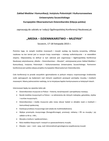 Zakład Mediów i Komunikacji, Instytutu Polonistyki i Kulturoznawstwa Uniwersytetu Szczecioskiego Europejskie Obserwatorium Dziennikarskie (Edycja polska) zapraszają do udziału w I edycji Ogólnopolskiej Konferencji Naukowej pt. „MEDIA – DZIENNIKARSTWO – MUZYKA” Szczecin, 17-18 listopada 2015 r. Pomimo tego, że związki mediów masowych i muzyki wydają się kwestią oczywistą, refleksja naukowa na ten temat jest w naszym kraju rozwinięta – mówiąc eufemistycznie – w niewielkim stopniu. Odpowiedzią na deficyt w tym zakresie jest organizacja I Ogólnopolskiej Konferencji Naukowej zatytułowanej „Media – Dziennikarstwo – Muzyka”, zainicjowanej przez Zakład Mediów i Komunikacji, Instytutu Polonistyki i Kulturoznawstwa Uniwersytetu Szczecioskiego. Partnerem konferencji jest polska edycja projektu Europejskie Obserwatorium Dziennikarskie. Cele konferencji to przede wszystkim zgromadzenie w jednym miejscu rozproszonego środowiska osób zajmujących się badaniami nad różnymi aspektami powiązao pomiędzy muzyką i mediami masowymi. Mamy jednocześnie nadzieję, że ta inicjatywa będzie kontynuowana w kolejnych latach. Interesowad będą nas zjawiska takie jak: Dziennikarstwo muzyczne w Polsce – historia, teraźniejszośd i perspektywy rozwoju; Rynek mediów muzycznych w Polsce – w odniesieniu do różnych rodzajów, gatunków, stylów i nurtów muzycznych; Dziennikarstwo i media muzyczne jako nowy obszar badao w obrębie nauk o mediach i komunikacji społecznej; Ewolucja przekazu muzycznego (od Jubala do multimedialności); Wpływ przemysłu muzycznego (fonograficznego), promocji, reklamy i PR na muzykę i jej odbiór w XX w. i XXI.; Muzyka a kultura i społeczeostwo ; Rola mediów klasycznych i nowych w upowszechnianiu muzyki; Klasyka – jazz – rock – pop, czyli różnorodnośd genologiczna współczesnej muzyki Jesteśmy także otwarci na inne propozycje związane z wiodącym tematem Konferencji. Konferencja odbędzie się w dniach 17-18 listopada 2015 r. w Szczecinie, w siedzibie Zachodniopomorskiego Centrum Doskonalenia Nauczycieli (ul. Sowioskiego 68). Zgłoszenia udziału w konferencji oraz abstrakty referatów (150-200 słów) lub propozycje sesji panelowych (150-300 słów) prosimy przesyład do dnia 15 października 2015 r. na adres e-mail dra Artura Trudzika: [email protected] Opłata konferencyjna wynosi 300 złotych. W jej ramach organizatorzy gwarantują: materiały konferencyjne, catering, (obiady, uroczysta kolacja pierwszego dnia konferencji, przerwy kawowe) oraz imprezy towarzyszące. Planowana jest także publikacja pokonferencyjna. Dokładne szczegóły związane ze stroną organizacyjną konferencji przesyłane będą w późniejszym terminie. Z wyrazami szacunku, Organizatorzy konferencji: Dr Artur Trudzik (Zakład Mediów i Komunikacji, Instytutu Polonistyki i Kulturoznawstwa Uniwersytetu Szczecioskiego) – kierownik konferencji Dr Michał Kuś (Europejskie Obserwatorium Dziennikarskie)