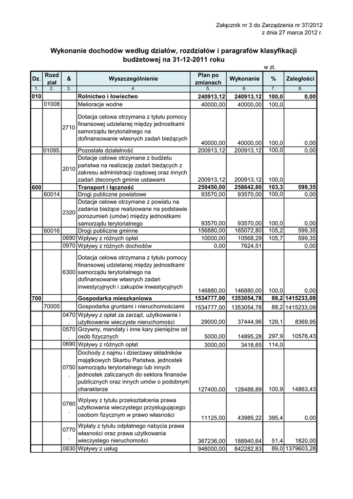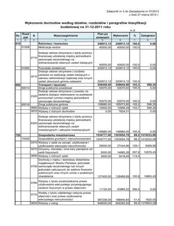 Załącznik nr 3 do Zarządzenia nr 37/2012 z dnia 27 marca 2012 r. Wykonanie dochodów według działów, rozdziałów i paragrafów klasyfikacji budżetowej na 31-12-2011 roku w zł. Rozd Dz. ział 1. 2. & 3. 010 01008 . Wyszczególnienie 4. Rolnictwo i łowiectwo Melioracje wodne 2010 600 60014 2320 60016 0690 . 0970 . 5. 70005 0470 . 0570 . 0690 . 0750 . 6. % Zaległości 7. 8. 240913,12 40000,00 100,0 100,0 0,00 40000,00 200913,12 40000,00 200913,12 100,0 100,0 0,00 0,00 200913,12 250450,00 93570,00 200913,12 258642,80 93570,00 100,0 103,3 100,0 599,35 0,00 93570,00 156880,00 10000,00 0,00 93570,00 165072,80 10568,29 7624,51 100,0 105,2 105,7 146880,00 1534777,00 Gospodarka mieszkaniowa Gospodarka gruntami i nieruchomościami 1534777,00 Wpływy z opłat za zarząd, użytkowanie i 29000,00 użytkowanie wieczyste nieruchomości Grzywny, mandaty i inne kary pieniężne od 5000,00 osób fizycznych Wpływy z różnych opłat 3000,00 Dochody z najmu i dzierżawy składników majątkowych Skarbu Państwa, jednostek samorządu terytorialnego lub innych jednostek zaliczanych do sektora finansów publicznych oraz innych umów o podobnym charakterze 127400,00 146880,00 1353054,78 100,0 0,00 88,2 1415233,09 1353054,78 88,2 1415233,09 Pozostała działalność Dotacje celowe otrzymane z budżetu państwa na realizację zadań bieżących z zakresu administracji rządowej oraz innych zadań zleconych gminie ustawami Transport i łączność Drogi publiczne powiatowe Dotacje celowe otrzymane z powiatu na zadania bieżące realizowane na podstawie porozumień (umów) między jednostkami samorządu terytorialnego Drogi publiczne gminne Wpływy z różnych opłat Wpływy z różnych dochodów Dotacja celowa otrzymana z tytułu pomocy finansowej udzielanej między jednostkami 6300 samorządu terytorialnego na dofinansowanie własnych zadań inwestycyjnych i zakupów inwestycyjnych 700 Wykonanie 240913,12 40000,00 Dotacja celowa otrzymana z tytułu pomocy finansowej udzielanej między jednostkami 2710 samorządu terytorialnego na dofinansowanie własnych zadań bieżących 01095. Plan po zmianach Wplywy z tytułu przekształcenia prawa 0760 użytkowania wieczystego przysługującego . osobom fizycznym w prawo własności Wpłaty z tytułu odpłatnego nabycia prawa 0770 własności oraz prawa użytkowania . wieczystego nieruchomości 0830 Wpływy z usług . 0,00 599,35 599,35 0,00 37444,96 129,1 8369,95 14895,28 3418,65 297,9 114,0 10576,43 128488,89 100,9 14863,43 11125,00 43985,22 395,4 0,00 367236,00 946000,00 188940,64 842282,83 51,4 1820,00 89,0 1379603,28 Dz. Rozd ział 1. 2. & 3. 0870 . 0910 . 0920 . 0970 . 710 71035 2020 750 75011 2010 75023 0580 . 0690 0920 0970 8120 75056 2010 751 75101 Wyszczególnienie Plan po zmianach Wykonanie % Zaległości 4. 5. 6. 7. 8. Wpływy ze sprzedaży składników majątkowych Odsetki od nieterminowych wpłat z tytułu podatków i opłat Pozostałe odsetki Wpływy z różnych dochodów Działalność usługowa Cmentarze Dotacje celowe otrzymane z budżetu państwa na zadania bieżące realizowane przez gminę na podstawie porozumień z organami administracji rządowej Administracja publiczna Urzędy wojewódzkie Dotacje celowe otrzymane z budżetu państwa na realizację zadań bieżących z zakresu administracji rządowej oraz innych zadań zleconych gminie ustawami Urzędy gmin Grzywny i inne kary pieniężne od osób prawnych i innych jednostek organizacyjnych Wpływy z różnych opłat Pozostałe odsetki Wpływy z różnych dochodów Odsetki od pożyczek udzielonych przez jednostkę samorządu terytorialnego Spis powszechny i i nne Dotacje celowe otrzymane z budżetu państwa na realizację zadań bieżących z zakresu administracji rządowej oraz innych zadań zleconych gminie ustawami Urzędy naczelnych organów władzy państwowej, kontroli i ochrony prawa oraz sądownictwa Urzędy naczelnych organów władzy państwowej, kontroli i ochrony prawa Dotacje celowe otrzymane z budżetu państwa na realizację zadań bieżących z 2010 zakresu administracji rządowej oraz innych zadań zleconych gminie ustawami 75108 Wybory do Sejmu i Senatu Dotacje celowe otrzymane z budżetu państwa na realizację zadań bieżących z 2010 zakresu administracji rządowej oraz innych zadań zleconych gminie ustawami 752 Obrona narodowa 75212 Pozostałe wydatki obronne 0,00 621,88 13600,00 13321,75 98,0 0,00 32416,00 3000,00 3000,00 52,37 79602,31 3000,00 3000,00 245,6 100,0 100,0 3000,00 139063,00 79073,00 3000,00 158556,48 79073,00 100,0 114,0 100,0 0,00 0,00 79073,00 35096,00 79073,00 54642,18 100,0 155,7 0,00 6500,00 2300,00 23000,00 2500,00 0,0 0,00 2327,50 101,2 94,3 21683,77 29852,97 1194,1 796,00 24894,00 777,94 24841,30 97,7 99,8 24894,00 24841,30 99,8 21037,00 20877,00 99,2 1550,00 1550,00 100,0 1550,00 1550,00 100,0 19487,00 19327,00 19487,00 200,00 200,00 19327,00 200,00 200,00 100,0 100,0 0,00 0,00 Dz. Rozd ział & Wyszczególnienie Plan po zmianach Wykonanie % Zaległości 1. 2. 3. 4. 5. 6. 7. 8. 200,00 200,00 100,0 71000,00 0,00 5068,51 634,91 7,1 0,00 11,69 0,00 1000,00 623,22 1000,00 100,0 1000,00 70000,00 1000,00 3433,60 100,0 4,9 3816,40 70000,00 3433,60 4,9 3816,40 7298083,00 7016580,56 15700,00 13040,91 83,1 30682,89 15400,00 13040,28 84,7 30682,89 300,00 0,63 0,2 2173254,00 2019680,00 52518,00 68799,00 6140,00 15000,00 0,00 0,00 1757512,59 1554761,89 67852,00 68214,00 6140,00 508,00 6532,80 167,20 Dotacje celowe otrzymane z budżetu państwa na realizację zadań bieżących z 2010 zakresu administracji rządowej oraz innych zadań zleconych gminie ustawami Bezpieczeństwo publiczne i ochrona 754 przeciwpożarowa 75412 Ochotnicze straże pożarne Odsetki od dotacji oraz płatności: wykorzystanych niezgodnie z 0900 przeznaczeniem lub wykorzystanych z . naruszeniem procedur, o których mowa w art. 184 ustawy, pobranych nienależnie lub w nadmiernej wysokości Wpływy ze zwrotów dotacji oraz płatności, w tym wykorzystanych niezgodnie z 2910 przeznaczenie