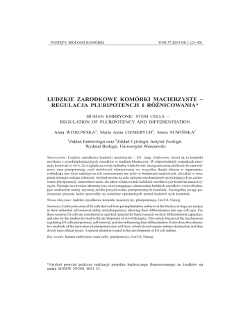 LUDZKIE ZARODKOWE KOMÓRKI MACIERZYSTE 23 POSTÊPY BIOLOGII KOMÓRKI TOM 37 2010 NR 1 (2340) LUDZKIE ZARODKOWE KOMÓRKI MACIERZYSTE REGULACJA PLURIPOTENCJI I RÓ¯NICOWANIA* HUMAN EMBRYONIC STEM CELLS REGULATION OF PLURIPOTENCY AND DIFFERENTIATION Anna WITKOWSKA1, Maria Anna CIEMERYCH2, Aneta SUWIÑSKA1 1 Zak³ad Embriologii oraz 2Zak³ad Cytologii, Instytut Zoologii. Wydzia³ Biologii, Uniwersytet Warszawski Streszczenie: Ludzkie zarodkowe komórki macierzyste ES (ang. Embryonic Stem) s¹ to komórki uzyskane z przedimplantacyjnych zarodków w stadium blastocysty. W odpowiednich warunkach mo¿na je hodowaæ in vitro. Ze wzglêdu na swoje unikalne w³aciwoci: nieograniczon¹ zdolnoæ do samoodnowy oraz pluripotencjê, czyli mo¿liwoæ ró¿nicowania we wszystkie tkanki obecne w organizmie, wzbudzaj¹ one du¿e nadzieje na ich zastosowanie nie tylko w badaniach naukowych, ale tak¿e w terapiach ró¿nego rodzaju schorzeñ. Artyku³ ten ma na celu opisanie mechanizmów pozwalaj¹cych na zachowanie pluripotencji, samoodnawianie, ale tak¿e ró¿nicowanie ludzkich zarodkowych komórek macierzystych. Opisuje on równie¿ alternatywne, niewymagaj¹ce umiercania ludzkich zarodków i niewzbudzaj¹ce zastrze¿eñ natury etycznej ród³a pozyskiwania pluripotentnych komórek. Szczególn¹ uwagê powiêcono pracom, które pozwoli³y na ustalenie optymalnych metod hodowli tych komórek. S³owa kluczowe: ludzkie zarodkowe komórki macierzyste, pluripotencja, Oct3/4, Nanog. Summary: Embryonic stem (ES) cells derived from preimplantation embryos at the blastocyst stage are unique in their unlimited self-renewal ability and pluripotency allowing their differentiation into any cell type. For these reasons ES cells are considered as a perfect material for basic research on their differentiation capacities, and also for the studies devoted to the development of novel therapies. This article focuses at the mechanisms regulating ES cells pluripotency, self-renewal, and also influencing their differentiation. It also describes alternative methods of the derivation of pluripotent stem cell lines, which do not require embryo destruction and thus do not raise ethical issues. A special attention is paid to the development of ES cell culture. Key words: human embryonic stem cells, pluripotency, Oct3/4, Nanog. *Artyku³ powsta³ podczas realizacji projektu badawczego finansowanego ze rodków na naukê MNiSW NN301 4051 33. 24 A. WITKOWSKA, M. A. CIEMERYCH, A. SUWIÑSKA 1. WSTÊP W okresie przedimplantacyjnym zarodek ssaków ma postaæ blastocysty pêcherzyka z³o¿onego z dwóch warstw komórek zewnêtrznej zwanej trofektoderm¹, i wewnêtrznej zawieraj¹cej grupê niezró¿nicowanych komórek, tworz¹cych tzw. wêze³ zarodkowy ICM (ang. Inner Cell Mass). Komórki wêz³a zarodkowego maj¹ zdolnoæ ró¿nicowania w ka¿d¹ tkankê organizmu, a wiêc s¹ pluripotentne. Stosuj¹c odpowiednie techniki z komórek tych mo¿na uzyskaæ tzw. zarodkowe komórki macierzyste ES (ang. Embryonic Stem), które hodowane in vitro w odpowiednich warunkach zachowuj¹ niezró¿nicowany charakter i pozostaj¹ pluripotentne. Ze wzglêdu na swoje niemal nieograniczone mo¿liwoci komórki ES wzbudzaj¹ du¿e nadzieje na zastosowanie nie tylko w badaniach naukowych, ale tak¿e w terapiach chorób degeneracyjnych. Warunkiem ich wykorzystania do celów terapeutycznych jest jednak rozwi¹zanie dwóch problemów. Po pierwsze, nale¿y dok³adnie poznaæ mechanizmy zarówno reguluj¹ce zachowanie przez nie stanu pluripotencji, jak i odpowiedzialne za ich ró¿nicowanie. Po drugie, trzeba ustaliæ warunki hodowli pozwalaj¹ce na wyeliminowanie sk³adników pochodzenia zwierzêcego rutynowo stosowanych do wzbogacania pod³o¿y hodowlanych, które stwarzaj¹ ryzyko kontaminacji zwierzêcymi patogenami. Opracowanie specjalnych po¿ywek hodowlanych zawieraj¹cych oprócz soli wy³¹cznie sk³adniki otrzymywane syntetycznie, które zapewnia³yby efektywny wzrost kolonii zarodkowych komórek macierzystych, nadal sprawia wiele trudnoci. Niniejszy artyku³ ma na celu scharakteryzowanie najwa¿niejszych cie¿ek sygna³owych odpowiedzialnych za utrzymywanie pluripotencji, samoodnawianie, a tak¿e ró¿nicowanie ludzkich zarodkowych komórek macierzystych. Jego celem jest tak¿e omówienie obecnie stosowanych metod hodowli tych komórek. 2. HISTORIA UZYSKANIA LUDZKICH ZARODKOWYCH KOMÓREK MACIERZYSTYCH Próby uzyskania komórek pluripotentnych rozpoczê³y siê w latach 70. ubieg³ego wieku. W tym czasie zainteresowanie naukowców wzbudzi³y linie komórek wyprowadzone z guzów rozwijaj¹cych siê w gonadach myszy szczepów 129 i LT/Sv. By³y to tak zwane komórki raka zarodkowego EC (ang. Embryonic Carcinoma). Mia³y one zdolnoæ nieprzerwanej proliferacji i ró¿nicowania w komórki wszystkich trzech listków zarodkowych, ale jednoczenie charakteryzowa³ je nieprawid³owy kariotyp [4]. Po wszczepieniu komórek EC do organizmu (np. pod skórê) myszy, o nie w pe³ni funkcjonalnym uk³adzie odpornociowym, tworzy³y one guzy okrelane mianem potworniaków lub te¿ teratom (od gr. teratos potwór) zbudowane z wielu tkanek pochodzenia ekto-, endo- i mezodermalnego. Komórki te charakteryzowa³ jednak niestabilny kariotyp, co powodowa³o, ¿e nie mog³y byæ one traktowane jako idealne ród³o materia³u do badañ np. nad ich ró¿nicowaniem. LUDZKIE ZARODKOWE KOMÓRKI MACIERZYSTE 25 W 1981 roku Evans i Kaufman oraz niezale¿nie od nich Martin, wyizolowali z blastocyst myszy linie pluripotentnych zarodkowych komórek macierzystych o prawid³owym kariotypie [18, 45]. W 1995 roku z blastocyst ma³p gatunku Rhesus uzyskano komórki, które przypomina³y raczej ludzkie komórki raka zarodkowego ni¿ mysie komórki ES. Tworzy³y one kolonie p³askie i mniej zwarte w porównaniu z mysimi komórkami ES, syntetyzowa³y równie¿ markery powierzchniowe charakterystyczne dla ludzkich komórek EC [78, 87]. W 1998 roku, Thomson i jego wspó³pracownicy wyizolowali z ludzk