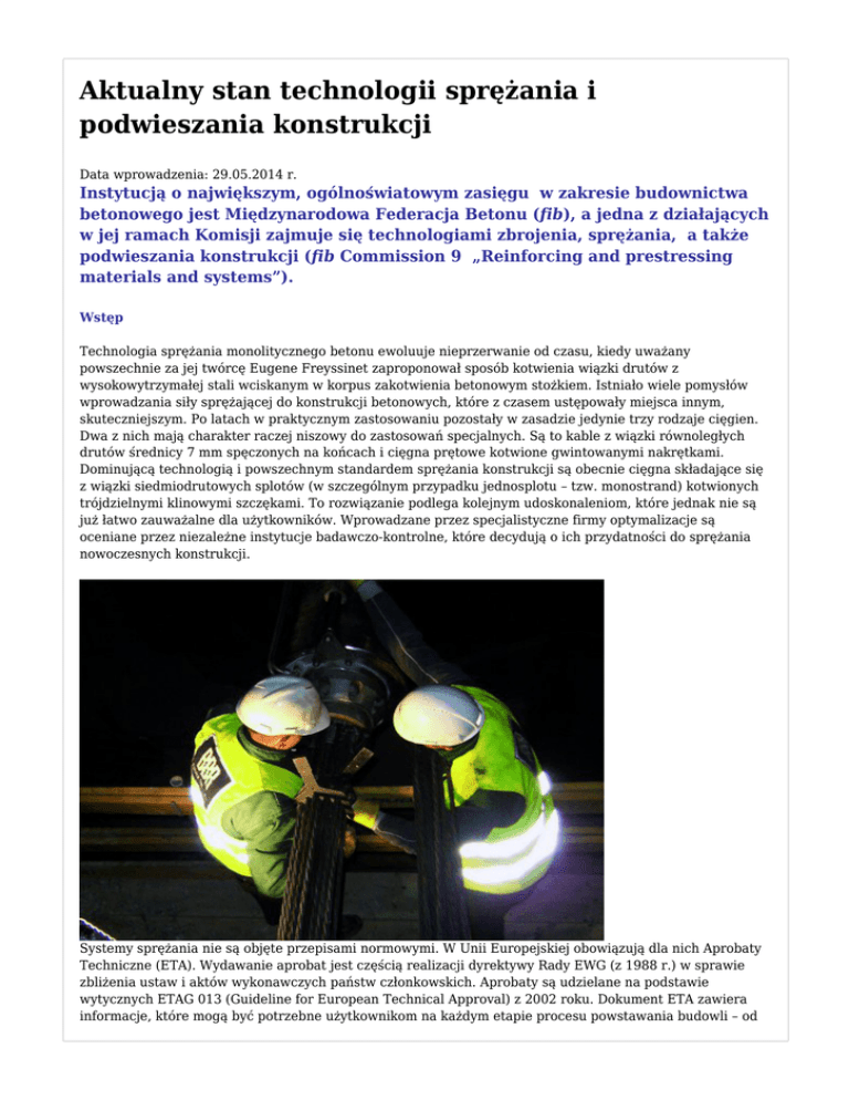 Aktualny stan technologii sprężania i podwieszania konstrukcji Data wprowadzenia: 29.05.2014 r. Instytucją o największym, ogólnoświatowym zasięgu w zakresie budownictwa betonowego jest Międzynarodowa Federacja Betonu (fib), a jedna z działających w jej ramach Komisji zajmuje się technologiami zbrojenia, sprężania, a także podwieszania konstrukcji (fib Commission 9 „Reinforcing and prestressing materials and systems”). Wstęp Technologia sprężania monolitycznego betonu ewoluuje nieprzerwanie od czasu, kiedy uważany powszechnie za jej twórcę Eugene Freyssinet zaproponował sposób kotwienia wiązki drutów z wysokowytrzymałej stali wciskanym w korpus zakotwienia betonowym stożkiem. Istniało wiele pomysłów wprowadzania siły sprężającej do konstrukcji betonowych, które z czasem ustępowały miejsca innym, skuteczniejszym. Po latach w praktycznym zastosowaniu pozostały w zasadzie jedynie trzy rodzaje cięgien. Dwa z nich mają charakter raczej niszowy do zastosowań specjalnych. Są to kable z wiązki równoległych drutów średnicy 7 mm spęczonych na końcach i cięgna prętowe kotwione gwintowanymi nakrętkami. Dominującą technologią i powszechnym standardem sprężania konstrukcji są obecnie cięgna składające się z wiązki siedmiodrutowych splotów (w szczególnym przypadku jednosplotu – tzw. monostrand) kotwionych trójdzielnymi klinowymi szczękami. To rozwiązanie podlega kolejnym udoskonaleniom, które jednak nie są już łatwo zauważalne dla użytkowników. Wprowadzane przez specjalistyczne firmy optymalizacje są oceniane przez niezależne instytucje badawczo-kontrolne, które decydują o ich przydatności do sprężania nowoczesnych konstrukcji. Systemy sprężania nie są objęte przepisami normowymi. W Unii Europejskiej obowiązują dla nich Aprobaty Techniczne (ETA). Wydawanie aprobat jest częścią realizacji dyrektywy Rady EWG (z 1988 r.) w sprawie zbliżenia ustaw i aktów wykonawczych państw członkowskich. Aprobaty są udzielane na podstawie wytycznych ETAG 013 (Guideline for European Technical Approval) z 2002 roku. Dokument ETA zawiera informacje, które mogą być potrzebne użytkownikom na każdym etapie procesu powstawania budowli – od projektu do ostatecznego odbioru. Wymogi obowiązujących obecnie aprobat oparte są na założonym 100letnim okresie użytkowania cięgien. Aprobaty zawierają wytyczne zarówno do projektowania jak i instalowania systemów sprężania. Stanowią pomoc merytoryczną nie tylko dla projektantów i wykonawców, ale także dla organizacji nadzoru i kontroli procesu budowlanego. Broszury informacyjno-techniczne wydawane przez specjalistyczne firmy zawierają zwykle najważniejsze informacje zawarte w aprobatach i, co istotne, nie mogą być z nimi sprzeczne ani zmieniać ich zapisów. Aprobaty definiują wymagania dotyczące każdego z zastosowanych w systemie materiałów. Finalny produkt, którym jest cięgno sprężające oceniany jest pod kątem zgodności z aprobatą, którą poświadcza oznaczenie znakiem CE. Poszczególne elementy systemu mają jedynie promesę tego oznaczenia, które jest wydawane po zakończeniu wszystkich czynności związanych ze sprężeniem konstrukcji i dopełnieniu wszystkich wymaganych procedur. Wynika z tego, że stosowanie systemu sprężania wymaga odpowiednich poświadczonych kwalifikacji i nie może być wykonane przez podmioty nieuprawnione. Wytyczne europejskie wymagają odpowiedniego certyfikatu „Post Tensioning Specialist Company”, który wystawia właściciel systemu uprawnionemu wykonawcy na podstawie załącznika D.1 ETAG 013 oraz przepisu CWA 14646. W Polsce nie wdrożono dotychczas jednoznacznych przepisów regulujących uprawnienia do wykonywania prac sprężalniczych. Kable sprężające do sprężania wewnętrznego z przyczepnością Przez sprężenie wewnętrzne rozumie się rozwiązanie, w którym kable przebiegają wewnątrz przekroju betonowego, który je otacza. Kable mogą osiągać wysoką nośność, co czyni je szczególnie użytecznymi w budownictwie mostowym i w innych wielkogabarytowych konstrukcjach inżynierskich. Podstawowy system kabli tego typu oferowany przez wiodące firmy obejmuje zwykle typoszereg kabli od 4 do nie mniej niż 31 splotów – nośność największego z nich przekracza 8 500 kN. Niektóre firmy oferują kable większe, złożone nawet z 61 splotów (nośność blisko 15 000 kN) przeznaczone do zastosowań specjalnych. Tak duże kable do zastosowań np. w energetyce jądrowej wymagają przeprowadzenia odpowiednich wszechstronnych testów. Odpowiedni program badawczy można zrealizować jedynie w nielicznych wyspecjalizowanych laboratoriach dysponujących odpowiednim sprzętem. Na system kabli składają się następujące jego komponenty: ■ cięgno składające się z od 4 do 31 lub więcej splotów 7-drutowych o nominalnej średnicy od 15,3 do 15,7 mm i wytrzymałości na rozciąganie 1860 N/mm2 ■ zakotwienie ze szczękami kotwiącymi; mogą to być zakotwienia końcowe lub łączniki stałe bądź ruchome ■ płyta oporowa ■ spirale i dodatkowe zbrojenie ze stali miękkiej w obszarze zakotwienia ■ środki ochrony antykorozyjnej dla cięgien i zakotwień. Zbrojenie miękkie strefy zakotwienia zdefiniowane w aprobacie należy rozumieć jako wymóg minimalny. Projektant może je określić inaczej z zachowaniem zasady ekwiwalentności. Specyfikację zabezpieczenia antykorozyjnego uszczegółowia norma EN 447. Ważne elementy jakimi są osłonki kabli nie są wg ETA komponentem systemu. W przypadku osłonek metalowych aprobata odsyła do normy EN 523, a osłon z tworzyw sztucznych do załącznika C.3. ETAG 013. Kable wewnętrzne umieszczane są zwykle ciasno w przekroju sprężanej konstrukcji. Ważnym zagadnieniem jest więc określenie minimalnych odstępów osiowych pomiędzy zakotwieniami kabli oraz ich minimalnego odstępu od krawędzi konstrukcji. To właśnie tu najlepiej widać stały post