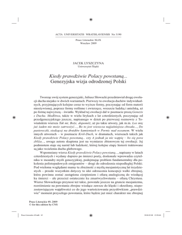 ACTA UNIVERSITATIS WRATISLAVIENSIS No 3190 Prace Literackie XLIX Wrocław 2009 JACEK LYSZCZYNA Uniwersytet Śląski Kiedy prawdziwie Polacy powstaną... Genezyjska wizja odrodzonej Polski Tworząc swój system genezyjski, Juliusz Słowacki przedstawiał drogę ewolucji ducha niejako w dwóch wariantach. Pierwszy to ewolucja duchów indywidualnych, przyjmujących kolejno coraz to wyższe formy, poczynając od form materii nieożywionej, poprzez formy roślinne i zwierzęce, wreszcie ludzką i anielską, aż po formę najwyższą – światło. Wykład tej ewolucji dał w poemacie prozą Genezis z Ducha. Modlitwa, także w wielu lirykach z lat czterdziestych, poczynając od przedgenezyjskiego jeszcze, napisanego w dzień po pierwszej rozmowie z Towiańskim wiersza Tak mi, Boże, dopomóż, aż po takie utwory, jak m.in. Los mię już żaden nie może zatrwożyć..., Bo to jest wieszcza najjaśniejsza chwała..., Do pastereczki, siedzącej na druidów kamieniach w Pornic nad oceanem. W wielu innych utworach – w poemacie Król-Duch, w dramatach, wierszach takich jak Kiedy prawdziwie Polacy powstaną... czy A jednak ja nie wątpię – bo się pora zbliża..., uwaga autora skupiona jest na wymiarze zbiorowym tej ewolucji. Jej podmiotem staje się naród lub ludzkość, której kolejne etapy historii traktowane są jako wcielenia ducha globowego. Wspomniany wiersz Kiedy prawdziwie Polacy powstaną..., napisany w latach czterdziestych i wydany dopiero po śmierci poety, doskonale wprowadza czytelnika w meandry myśli genezyjskiej, podejmując problem fundamentalny dla pokolenia polistopadowych emigrantów – drogi do odrodzenia niepodległej Polski. Pod wieloma względami mamy tu zbieżność z myślą mesjanistyczną lat trzydziestych – przede wszystkim dotyczy to idei odrzucenia koncepcji walki zbrojnej, która powinna zostać zastąpiona cierpieniem i ofiarą analogiczną do wiodącej ku śmierci – ale przecież ostatecznie ku zmartwychwstaniu – ofiarą Chrystusa. Wiersz Słowackiego przynosi też takie, powstałe jeszcze na gruncie mesjanizmu, rozróżnienie na powstania zbrojne wiodące zawsze do klęski i określony, niepozostawiającym wątpliwości co do jego wartościowania przysłówkiem „prawdziwie” moment przyszłego powstania, które będzie już mieć charakter nie zbrojnej Prace Literackie 49, 2009 © for this edition by CNS Prace-Literackie-49.indb 63 2010-02-08 13:50:46 64 JACEK LYSZCZYNA walki, lecz zmagań ducha. Jednocześnie wiersz poddaje owe dawne usiłowania wywalczenia sobie wolności drogą zbrojnego czynu skrajnej ironii: Kiedy prawdziwie Polacy powstaną, To składek zbierać nie będą narody [...]1 (t. 1, s. 226) Jak zwrócił uwagę w swej biografii poety Zbigniew Sudolski, reakcja Słowackiego na inicjatywy społeczeństw zachodu Europy po klęsce powstania krakowskiego w 1846 roku była jednoznaczna. Krytycznie odniósł się również poeta do akcji składkowej, jaka rozwinęła się na Zachodzie na rzecz walczącej Polski. Doskonale rozumiał, iż filantropijny gest sympatii przy całkowitej obojętności politycznej nic nie daje krajowi zmagającemu się z przeważającą siłą wroga2. Ale ironia tego wiersza jest dalej jeszcze bardziej gryząca – narody Zachodu spodziewają się z doświadczenia, że tak jak w poprzednich razach, gdy „na pieśń strzelaną” Polaków „wytężą uszy”, rzecz skończy się szybko klęską i pozostanie im tylko owo zbieranie składek, a zaraz potem „odemkną gospody”, aby przyjąć uchodźców, którzy kolejną falą emigracji wyruszą na obczyznę. Tak pewnie potoczyłyby się sprawy, gdyby chodziło o powstanie zbrojne, takie jak wcześniej, jak w latach 1794 czy 1830–1831. Tym razem będzie jednak inaczej, aż narody Zachodu „ogłupieją”, bo: [...] będą wieści z wichrami wchodziły, A każda będzie serce ludów pasła; Nieznajomymi świat poruszą siły Na nieznajome jakieś wielkie hasła. Nie pojmie Francuz, co to w świecie znaczy, Że jakiś naród wstał w ciemności dymie, Choć tak rozpaczny – nie w imię rozpaczy. Choć taki mściwy – a nie w zemsty imię. (t. 1, s. 226) I teraz dopiero odsłania się prawdziwy charakter tego boju, toczonego bez oręża, który można zrozumieć jedynie w kategoriach genezyjskiego postępu, dlatego też inni, niewtajemniczeni jeszcze w genezyjskie prawdy, nie są w stanie pojąć jego istoty, zwłaszcza tego, że o jego skuteczności decyduje uprzedni wysiłek ducha odbywający się w głębi ludzkich serc, niewidoczny dla tych, którzy oczekują głośnych i spektakularnych wyrazów walki. Tak więc ów „Francuz”: Nie pojmie, jaką duch odbył robotę W przeświętej serca ludzkiego ciemnicy, 1 Cytaty utworów Słowackiego pochodzą z wydania J. Słowacki, Dzieła, pod red. J. Krzyżanowskiego, t. 1–14, Warszawa 1959. 2 Z. Sudolski, Słowacki, Warszawa 1978, s. 237. Prace Literackie 49, 2009 © for this edition by CNS Prace-Literackie-49.indb 64 2010-02-08 13:50:46 Genezyjska wizja odrodzonej Polski 65 I przez sztandary jest tłuczony złote, I przez bój wielki przy dział błyskawicy. „Cóż to” – zapyta – „są za bezimieńce, Którzy na dawnym wstali mogilniku? Bój tylko widać i ogniste wieńce, A zwierzęcego nic nie słychać krzyku! Nie, to nie ludzie z krwi i ciał być muszą, Lecz jacyś pewnie upiorni rycerze, Którzy za duszę walczą tylko duszą I ogniem biją niebieskim w pancerze. (t. 1, s. 226) Trudno nie skojarzyć słów z tego wiersza z relacją Juliana Klaczki, który wspominał wystąpienie Słowackiego w Poznaniu w 1848 roku. „Na to powstaje Słowacki [...] i stojąc ze skrzyżowanymi na piersiach rękoma zaczął mówić podniesionym głosem: »Cóż wy myślicie? Wam sie zdaje, że dzisiaj potrzeba jeszcze jak dawniej armat, pułków, oficerów? A ja wam powiadam, że dzisiaj przyszła epoka świętej anarchii...«”3. Wiersz ten odsłania też zasadnicze różnice między systemem genezyjskim a i