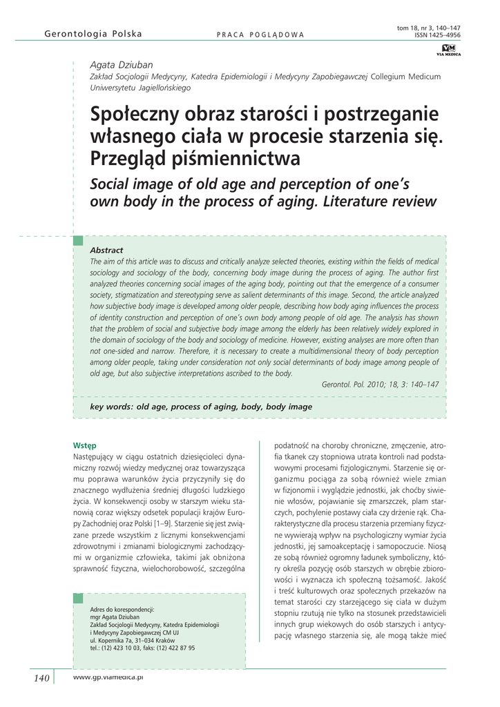 Gerontologia Polska PRACA POGLĄDOWA tom 18, nr 3, 140–147 ISSN 1425–4956 Agata Dziuban Zakład Socjologii Medycyny, Katedra Epidemiologii i Medycyny Zapobiegawczej Collegium Medicum Uniwersytetu Jagiellońskiego Społeczny obraz starości i postrzeganie własnego ciała w procesie starzenia się. Przegląd piśmiennictwa Social image of old age and perception of one’s own body in the process of aging. Literature review Abstract The aim of this article was to discuss and critically analyze selected theories, existing within the fields of medical sociology and sociology of the body, concerning body image during the process of aging. The author first analyzed theories concerning social images of the aging body, pointing out that the emergence of a consumer society, stigmatization and stereotyping serve as salient determinants of this image. Second, the article analyzed how subjective body image is developed among older people, describing how body aging influences the process of identity construction and perception of one’s own body among people of old age. The analysis has shown that the problem of social and subjective body image among the elderly has been relatively widely explored in the domain of sociology of the body and sociology of medicine. However, existing analyses are more often than not one-sided and narrow. Therefore, it is necessary to create a multidimensional theory of body perception among older people, taking under consideration not only social determinants of body image among people of old age, but also subjective interpretations ascribed to the body. Gerontol. Pol. 2010; 18, 3: 140–147 key words: old age, process of aging, body, body image Wstęp Następujący w ciągu ostatnich dziesięcioleci dynamiczny rozwój wiedzy medycznej oraz towarzysząca mu poprawa warunków życia przyczyniły się do znacznego wydłużenia średniej długości ludzkiego życia. W konsekwencji osoby w starszym wieku stanowią coraz większy odsetek populacji krajów Europy Zachodniej oraz Polski [1–9]. Starzenie się jest związane przede wszystkim z licznymi konsekwencjami zdrowotnymi i zmianami biologicznymi zachodzącymi w organizmie człowieka, takimi jak obniżona sprawność fizyczna, wielochorobowość, szczególna Adres do korespondencji: mgr Agata Dziuban Zakład Socjologii Medycyny, Katedra Epidemiologii i Medycyny Zapobiegawczej CM UJ ul. Kopernika 7a, 31–034 Kraków tel.: (12) 423 10 03, faks: (12) 422 87 95 140 www.gp.viamedica.pl podatność na choroby chroniczne, zmęczenie, atrofia tkanek czy stopniowa utrata kontroli nad podstawowymi procesami fizjologicznymi. Starzenie się organizmu pociąga za sobą również wiele zmian w fizjonomii i wyglądzie jednostki, jak choćby siwienie włosów, pojawianie się zmarszczek, plam starczych, pochylenie postawy ciała czy drżenie rąk. Charakterystyczne dla procesu starzenia przemiany fizyczne wywierają wpływ na psychologiczny wymiar życia jednostki, jej samoakceptację i samopoczucie. Niosą ze sobą również ogromny ładunek symboliczny, który określa pozycję osób starszych w obrębie zbiorowości i wyznacza ich społeczną tożsamość. Jakość i treść kulturowych oraz społecznych przekazów na temat starości czy starzejącego się ciała w dużym stopniu rzutują nie tylko na stosunek przedstawicieli innych grup wiekowych do osób starszych i antycypację własnego starzenia się, ale mogą także mieć Agata Dziuban, Obraz ciała w procesie starzenia się istotne konsekwencje dla sposobu doświadczania i postrzegania własnego ciała przez osoby starsze. Celem tego artykułu jest zarysowanie koncepcji, obecnych we współczesnej socjologii ciała oraz socjologii medycyny, dotyczących zarówno społecznego obrazu ciała w procesie starzenia, jak i doświadczenia własnej cielesności przez osoby w wieku podeszłym. Umożliwi to z jednej strony wyróżnienie głównych czynników determinujących sposób tworzenia i negocjowania obrazu starzejącego się ciała oraz ustalenie najbardziej problematycznych aspektów tego procesu dla osób w wieku podeszłym, a z drugiej — pozwoli na krytyczną analizę istniejących teorii oraz wskazanie tych obszarów doświadczenia osób starszych, które domagają się dokładniejszego omówienia w literaturze przedmiotu. W artykule zostanie przedstawiona zarówno problematyka konstruowania społecznego obrazu starzejącego się ciała, jak i kwestia subiektywnego doświadczenia cielesności. Starzejące się ciało w „społeczeństwie somatycznym” — społeczny obraz ciała Sposób, w jaki społeczny obraz starości jest konstruowany w obrębie społeczeństwa konsumpcyjnego, stanowi przedmiot zainteresowania znacznej części literatury poświęconej problematyce cielesności osób starszych [10–13]. Turner i Schilling podkreślają, że procesowi starzenia się społeczeństw oraz postępującej medykalizacji i technicyzacji ludzkiego organizmu towarzyszy wzrost zainteresowania ciałem jako istotnym wymiarem zarówno życia zbiorowego, jak i codziennej egzystencji jednostek. Wiąże się to z powstaniem „społeczeństwa somatycznego” (somatic society), w którym ciało staje się głównym polem aktywności naukowej, politycznej i kulturoweji [12, 13]. Z jednej strony, głęboka transformacja gospodarki oraz zasad organizacyjnych społeczeństw zachodnich, rozwój przede wszystkim przemysłu lekkiego i sfery usług, wzrost dobrobytu i poziomu życia jednostek, przyczyniły się do wytworzenia społeczeństwa konsumpcyjnego, w którym nacisk jest położony nie tyle na pracę czy produkcję dóbr, ale na ich konsumpcję, na doraźne zaspokajanie potrzeb aktorów społecznych. Towarzyszy temu nie tylko powiększające się zróżnicowanie stylów życia i pluralizacja przekonań czy światopoglądów, ale i dominująca rola mediów w kreowaniu obrazu świata, cielesności czy tożsamości. Z drugiej strony, wzrost wiedzy medycznej i rozwój naukowych tec