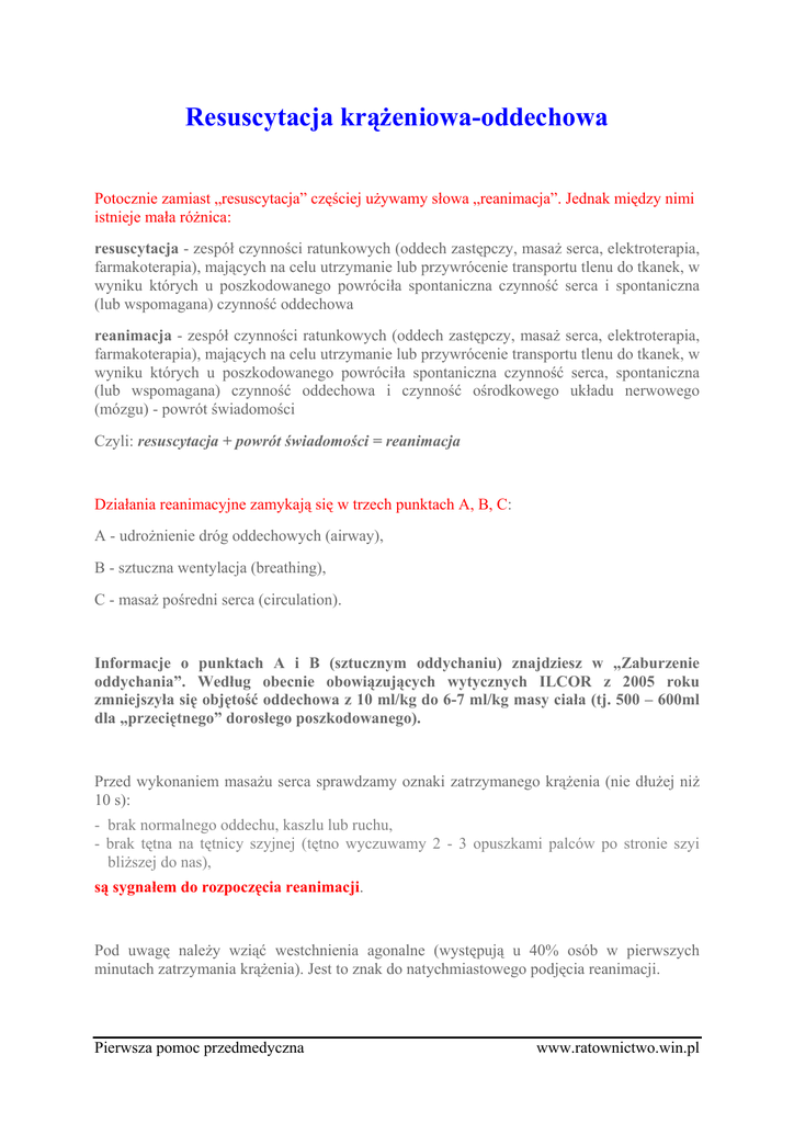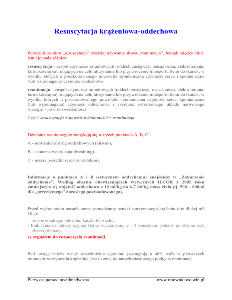 Resuscytacja krążeniowa-oddechowa Potocznie zamiast „resuscytacja” częściej używamy słowa „reanimacja”. Jednak między nimi istnieje mała różnica: resuscytacja - zespół czynności ratunkowych (oddech zastępczy, masaż serca, elektroterapia, farmakoterapia), mających na celu utrzymanie lub przywrócenie transportu tlenu do tkanek, w wyniku których u poszkodowanego powróciła spontaniczna czynność serca i spontaniczna (lub wspomagana) czynność oddechowa reanimacja - zespół czynności ratunkowych (oddech zastępczy, masaż serca, elektroterapia, farmakoterapia), mających na celu utrzymanie lub przywrócenie transportu tlenu do tkanek, w wyniku których u poszkodowanego powróciła spontaniczna czynność serca, spontaniczna (lub wspomagana) czynność oddechowa i czynność ośrodkowego układu nerwowego (mózgu) - powrót świadomości Czyli: resuscytacja + powrót świadomości = reanimacja Działania reanimacyjne zamykają się w trzech punktach A, B, C: A - udrożnienie dróg oddechowych (airway), B - sztuczna wentylacja (breathing), C - masaż pośredni serca (circulation). Informacje o punktach A i B (sztucznym oddychaniu) znajdziesz w „Zaburzenie oddychania”. Według obecnie obowiązujących wytycznych ILCOR z 2005 roku zmniejszyła się objętość oddechowa z 10 ml/kg do 6-7 ml/kg masy ciała (tj. 500 – 600ml dla „przeciętnego” dorosłego poszkodowanego). Przed wykonaniem masażu serca sprawdzamy oznaki zatrzymanego krążenia (nie dłużej niż 10 s): - brak normalnego oddechu, kaszlu lub ruchu, - brak tętna na tętnicy szyjnej (tętno wyczuwamy 2 - 3 opuszkami palców po stronie szyi bliższej do nas), są sygnałem do rozpoczęcia reanimacji. Pod uwagę należy wziąć westchnienia agonalne (występują u 40% osób w pierwszych minutach zatrzymania krążenia). Jest to znak do natychmiastowego podjęcia reanimacji. Pierwsza pomoc przedmedyczna www.ratownictwo.win.pl Postępowanie w zależności od wieku poszkodowanego: Poniżej przedstawiono, dla porównania, wytyczne ILCOR z 2000 roku, które są już nieaktualne, jak i obecnie obowiązujące, z 2005 roku. Tab.1. Według już nieaktualnych wytycznych ILCOR z 2000 roku: Reanimacja krążeniowooddechowa Miejsce ucisku Głębokość ucisku (generalnie: 1/3 głębokości mostka) Częstotliwość ucisku mostka (nie ilość!!!) Proporcje wddech - ucisk Ilość cykli na minutę (wartości idealne, w praktyce trudne do osiągnięcia) Niemowlę do 1 roku życia Dziecko 1 - 8 roku życia Dorosły od 8 roku życia jeden palec poniżej linii sutkowej jeden palec powyżej dołu mostka dwa palce powyżej dołu mostka 1,5 - 2,5 cm 2,5 - 3,5 cm 4,5 - 5 cm >100 na minutę >=100 na minutę =100 na minutę 1:5 1:5 2 : 15 20/min 20/min >4/min Tab.2. Według obowiązujących wytycznych ILCOR z 2005 roku: Reanimacja krążeniowooddechowa Rozpoczęcie działań ratujących od Miejsce ucisku Głębokość ucisku Częstotliwość ucisku mostka (nie ilość!!!) Proporcje wddech - ucisk Niemowlę do 1 roku życia Dziecko od 1 roku życia – do okresu pokwitania 5 wdechów, a następnie 30 ucisków 5 wdechów, a następnie 30 ucisków jeden palec powyżej dołu mostka jeden palec poniżej linii sutkowej Dorosły od okresu pokwitania 30 ucisków dwa palce powyżej dołu mostka 1,5 - 2,5 cm 2,5 - 3,5 cm 4 - 5 cm 100 na minutę 100 na minutę 100 na minutę 2 : 30 *) 2 : 30 *) 2 : 30 *) w przypadku wykonywania zabiegów resuscytacyjnych przez 2 i więcej ratowników, wtedy stosuje się proporcje 2 : 15 Pierwsza pomoc przedmedyczna www.ratownictwo.win.pl Właściwego wykonania masażu nie można nauczyć się tylko "z książki" (nie wolno reanimacji ćwiczyć na żywych ludziach, gdyż może to spowodować ich zgon z powodu zaburzenia pracy serca). Poniższy tekst jest tylko przypomnieniem dla osób mających możliwość przećwiczenia czynności reanimacyjnych na przeznaczonym do tego celu manekinie - fantomie. Podczas reanimacji chory leży na plecach, na twardym, nieelastycznym podłożu (w przypadku kobiet w zaawansowanej ciąży podkładamy klin pod jej prawy bok - aby nie utrudniać dopływu krwi do płodu). Zaczynamy od odgięciu głowy do tyłu i dwukrotnym wdmuchnieciu powietrza do płuc. Na wybranym miejscu (dwa palce powyżej dolnego końca mostka) kładzie się dłoń, przy czym palce powinny być odgięte ku górze, by nie dotykać klatki piersiowej. Drugą dłoń kładziemy na grzbiet dolnej ręki. Ramiona muszą znajdować się w pozycji prostopadłej do klatki piersiowej. Przy wyprostowanych łokciach, na zasadzie dźwigni, naciskamy na mostek wgłębiając go na 4-5 cm w kierunku kręgosłupa z częstotliwością około 100 razy na minutę. Siła uciskania powinna wynikać z przeniesienia masy ciała ratującego, a nie z pracy jego mięśni. W ten sposób oszczędza się siły przy długotrwałej akcji reanimacyjnej i zapewnia wywieranie prostopadłego nacisku. Zobacz to na poniższych rysunkach. Pierwsza pomoc przedmedyczna www.ratownictwo.win.pl W przypadku dziecka masaż serca wykonujemy jedną ręką, a u niemowlaka: w przypadku jednego ratownika - dwoma palcami, natomiast dla dwóch lub więcej ratowników - techniką dwóch kciuków i dłoni obejmujących klatkę piersiową. Pierwsza pomoc przedmedyczna www.ratownictwo.win.pl