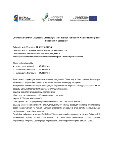 „Utworzenie Centrum Diagnostyki Obrazowej w Samodzielnym Publicznym Wojewódzkim Szpitalu Zespolonym w Szczecinie” Całkowita wartość projektu: 12 372 110,20 PLN Całkowita wartość wydatków kwalifikowanych: 12 121 965,90 PLN Dofinansowanie ze środków RPO WZ: 9 091 474,42 PLN Beneficjent: Samodzielny Publiczny Wojewódzki Szpital Zespolony w Szczecinie Okres realizacji projektu: rozpoczęcie realizacji: 03.06.2014 r. zakończenie rzeczowe: 23.03.2015 r. zakończenie finansowe: 31.03.2015 r. Przedmiotem projektu jest utworzenie Centrum Diagnostyki Obrazowej w Samodzielnym Publicznym Wojewódzkim Szpitalu Zespolonym w Szczecinie. W ramach inwestycji planuje się: 1) Wykonanie robót budowlanych polegających na przebudowie fragmentu istniejącego budynku M na potrzeby Centrum Diagnostyki Obrazowej w SPWSZ w Szczecinie. 2) Zakup specjalistycznej aparatury diagnostycznej: - Tomograf komputerowy min. 128 rzędowy wraz z osprzętem. - Aparat RTG (typu „telekomando”). - Trzy aparaty USG (w tym jeden aparat typu fibroskan, USG, USG klasy Premium ). 3) Zakup wartości niematerialnych i prawnych (systemy RIS i PACS służących do obsługi informatycznej zadań wykonywanych w ramach Centrum Diagnostyki Obrazowej) oraz sprzętu komputerowego niezbędnego do obsługi w/w systemu. Projekt jest realizowany w ramach Osi 7 Rozwój infrastruktury społecznej i ochrony zdrowia, Działania 7.3 Infrastruktura ochrony zdrowia, Poddziałania 7.3.1 Regionalna infrastruktura ochrony Regionalnego Programu Operacyjnego Województwa Zachodniopomorskiego na lata 2007-2013. zdrowia