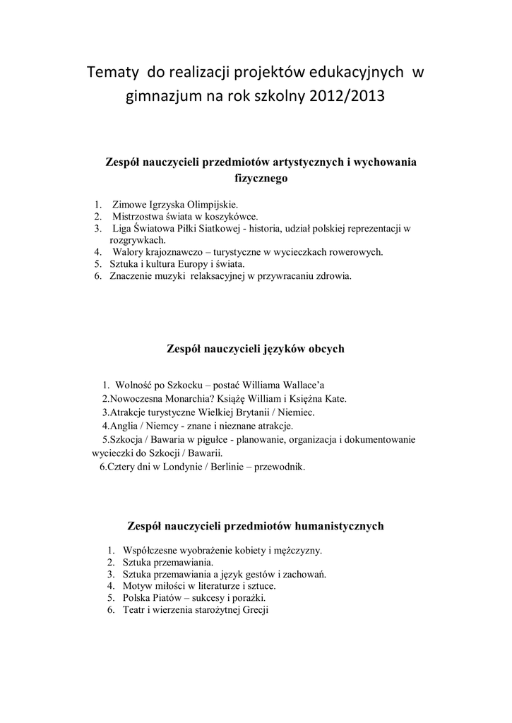 Tematy do realizacji projektów edukacyjnych w gimnazjum na rok szkolny 2012/2013 Zespół nauczycieli przedmiotów artystycznych i wychowania fizycznego 1. 2. 3. Zimowe Igrzyska Olimpijskie. Mistrzostwa świata w koszykówce. Liga Światowa Piłki Siatkowej - historia, udział polskiej reprezentacji w rozgrywkach. 4. Walory krajoznawczo – turystyczne w wycieczkach rowerowych. 5. Sztuka i kultura Europy i świata. 6. Znaczenie muzyki relaksacyjnej w przywracaniu zdrowia. Zespół nauczycieli języków obcych 1. Wolność po Szkocku – postać Williama Wallace’a 2.Nowoczesna Monarchia? Książę William i Księżna Kate. 3.Atrakcje turystyczne Wielkiej Brytanii / Niemiec. 4.Anglia / Niemcy - znane i nieznane atrakcje. 5.Szkocja / Bawaria w pigułce - planowanie, organizacja i dokumentowanie wycieczki do Szkocji / Bawarii. 6.Cztery dni w Londynie / Berlinie – przewodnik. Zespół nauczycieli przedmiotów humanistycznych 1. 2. 3. 4. 5. 6. Współczesne wyobrażenie kobiety i mężczyzny. Sztuka przemawiania. Sztuka przemawiania a język gestów i zachowań. Motyw miłości w literaturze i sztuce. Polska Piatów – sukcesy i porażki. Teatr i wierzenia starożytnej Grecji Zespół nauczycieli przedmiotów ścisłych 1.Słynni matematycy. 2.Rebusy matematyczne. 3.Symetria na co dzień. 4.Magia i matematyka. 5.Bądź bezpieczny w Internecie 6.Moja szkoła. Zespół nauczycieli przedmiotów przyrodniczych 1. 2. 3. 4. Chemia w kuchni Znaczenie odczynu roztworu- pH Gliwice-moje miasto-folder. Leki z bożej apteki-właściwości lecznicze pospolitych drzew, krzewów i bylin. 5. Czy uczniowie naszej szkoły odżywiają się zdrowo. 6. Prawa fizyki w przysłowiach ludow ych. Szkolny koordynator projektów mgr Grzegorz Koniczek