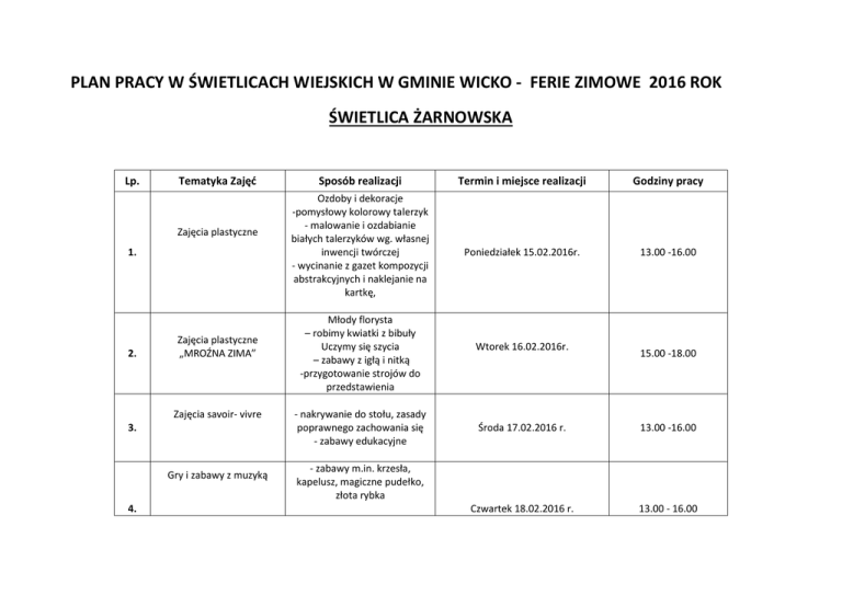 PLAN PRACY W ŚWIETLICACH WIEJSKICH W GMINIE WICKO - FERIE ZIMOWE 2016 ROK ŚWIETLICA ŻARNOWSKA Lp. Tematyka Zajęć Zajęcia plastyczne 1. 2. Zajęcia plastyczne „MROŹNA ZIMA” Zajęcia savoir- vivre 3. Gry i zabawy z muzyką 4. Sposób realizacji Ozdoby i dekoracje -pomysłowy kolorowy talerzyk - malowanie i ozdabianie białych talerzyków wg. własnej inwencji twórczej - wycinanie z gazet kompozycji abstrakcyjnych i naklejanie na kartkę, Młody florysta – robimy kwiatki z bibuły Uczymy się szycia – zabawy z igłą i nitką -przygotowanie strojów do przedstawienia - nakrywanie do stołu, zasady poprawnego zachowania się - zabawy edukacyjne Termin i miejsce realizacji Godziny pracy Poniedziałek 15.02.2016r. 13.00 -16.00 Wtorek 16.02.2016r. 15.00 -18.00 Środa 17.02.2016 r. 13.00 -16.00 Czwartek 18.02.2016 r. 13.00 - 16.00 - zabawy m.in. krzesła, kapelusz, magiczne pudełko, złota rybka Zabawy w plenerze 5. Zajęcia plastyczne 6. Zajęcia sportowe i gimnastyczne 7. Zajęcia zgaduj zgadula 8. 9. Zajęcia plastyczne Zabawy integracyjne Zajęcia muzyczne Zajęcia muzyczne 10. - gry i zabawy, dokarmianie zwierząt, - tworzenie kukiełek z rękawiczek - aerobik, - gry i zabawy integracyjne - rozgrywki w ping ponga - pogadanka na temat przemocy i agresji - czytanie bajek, zabawa w kalambury - przygotowanie wisiorków, łańcuszków dla pań z okazji Dnia Kobiet - gry i zabawy w świetlicy. - Zumba - kids - ognisko z kiełbaskami - śpiewanie, karaoke na wesoło Piątek 19.02.2016 r. Poniedziałek 22.02.2016r. 13.00 - 16.00 13.00 - 16.00 Wtorek 23.02.2016r. 15.00 – 18.00 Środa 24.02.2016r. 13.00 - 16.00 Czwartek 25.02.2016r. 13.00 – 16.00 Piątek 26.02.2016 r. 13.00 – 16.00 Gry planszowe PLAN PRACY NA ŚWIETLICY WIEJSKIEJ MOŻE ULEC NIEZNACZNYM MODYFIKACJOM. PODCZAS FERII REALIZOWANE BĘDĄ RÓWNIEŻ ZAGADNIENIA WYNIKAJĄCE Z PROGRAMU PROFILAKTYCZNEGO PN. „PO PIERWSZE BEZPIECZEŃSTWO NASZYCH DZIECI”