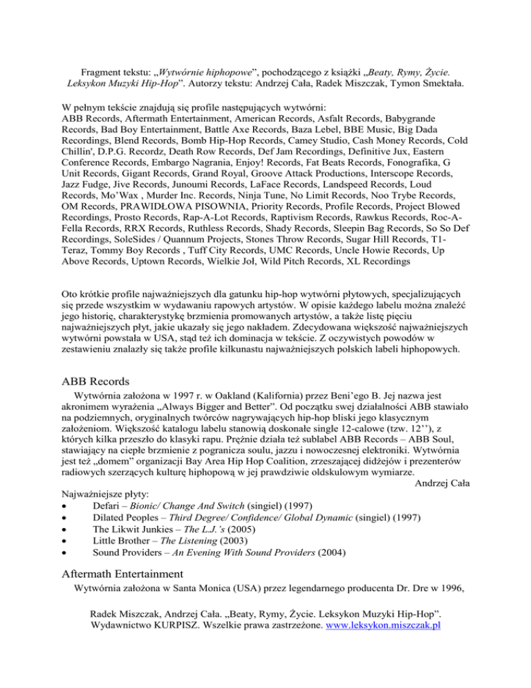 Fragment tekstu: „Wytwórnie hiphopowe”, pochodzącego z książki „Beaty, Rymy, Życie. Leksykon Muzyki Hip-Hop”. Autorzy tekstu: Andrzej Cała, Radek Miszczak, Tymon Smektała. W pełnym tekście znajdują się profile następujących wytwórni: ABB Records, Aftermath Entertainment, American Records, Asfalt Records, Babygrande Records, Bad Boy Entertainment, Battle Axe Records, Baza Lebel, BBE Music, Big Dada Recordings, Blend Records, Bomb Hip-Hop Records, Camey Studio, Cash Money Records, Cold Chillin', D.P.G. Recordz, Death Row Records, Def Jam Recordings, Definitive Jux, Eastern Conference Records, Embargo Nagrania, Enjoy! Records, Fat Beats Records, Fonografika, G Unit Records, Gigant Records, Grand Royal, Groove Attack Productions, Interscope Records, Jazz Fudge, Jive Records, Junoumi Records, LaFace Records, Landspeed Records, Loud Records, Mo’Wax , Murder Inc. Records, Ninja Tune, No Limit Records, Noo Trybe Records, OM Records, PRAWIDŁOWA PISOWNIA, Priority Records, Profile Records, Project Blowed Recordings, Prosto Records, Rap-A-Lot Records, Raptivism Records, Rawkus Records, Roc-AFella Records, RRX Records, Ruthless Records, Shady Records, Sleepin Bag Records, So So Def Recordings, SoleSides / Quannum Projects, Stones Throw Records, Sugar Hill Records, T1Teraz, Tommy Boy Records , Tuff City Records, UMC Records, Uncle Howie Records, Up Above Records, Uptown Records, Wielkie Joł, Wild Pitch Records, XL Recordings Oto krótkie profile najważniejszych dla gatunku hip-hop wytwórni płytowych, specjalizujących się przede wszystkim w wydawaniu rapowych artystów. W opisie każdego labelu można znaleźć jego historię, charakterystykę brzmienia promowanych artystów, a także listę pięciu najważniejszych płyt, jakie ukazały się jego nakładem. Zdecydowana większość najważniejszych wytwórni powstała w USA, stąd też ich dominacja w tekście. Z oczywistych powodów w zestawieniu znalazły się także profile kilkunastu najważniejszych polskich labeli hiphopowych. ABB Records Wytwórnia założona w 1997 r. w Oakland (Kalifornia) przez Beni’ego B. Jej nazwa jest akronimem wyrażenia „Always Bigger and Better”. Od początku swej działalności ABB stawiało na podziemnych, oryginalnych twórców nagrywających hip-hop bliski jego klasycznym założeniom. Większość katalogu labelu stanowią doskonałe single 12-calowe (tzw. 12’’), z których kilka przeszło do klasyki rapu. Prężnie działa też sublabel ABB Records – ABB Soul, stawiający na ciepłe brzmienie z pogranicza soulu, jazzu i nowoczesnej elektroniki. Wytwórnia jest też „domem” organizacji Bay Area Hip Hop Coalition, zrzeszającej didżejów i prezenterów radiowych szerzących kulturę hiphopową w jej prawdziwie oldskulowym wymiarze. Andrzej Cała Najważniejsze płyty: • Defari – Bionic/ Change And Switch (singiel) (1997) • Dilated Peoples – Third Degree/ Confidence/ Global Dynamic (singiel) (1997) • The Likwit Junkies – The L.J.’s (2005) • Little Brother – The Listening (2003) • Sound Providers – An Evening With Sound Providers (2004) Aftermath Entertainment Wytwórnia założona w Santa Monica (USA) przez legendarnego producenta Dr. Dre w 1996, Radek Miszczak, Andrzej Cała. „Beaty, Rymy, Życie. Leksykon Muzyki Hip-Hop”. Wydawnictwo KURPISZ. Wszelkie prawa zastrzeżone. www.leksykon.miszczak.pl Fragment tekstu: „Wytwórnie hiphopowe”, pochodzącego z książki „Beaty, Rymy, Życie. Leksykon Muzyki Hip-Hop”. Autorzy tekstu: Andrzej Cała, Radek Miszczak, Tymon Smektała. tuż po odejściu z kultowego dla gangsta rapu labelu: Death Row Records. Choć pierwsze produkcje wydane w Aftermath, jak składanka „Dr. Dre Presents The Aftermath” i „The Firm” supergrupy The Firm, nie odniosły sukcesu adekwatnego do wysokich oczekiwań, w ciągu kilkuletniej działalności firma wyrobiła sobie markę jednej z najważniejszych mainstreamowych wytwórni na hiphopowej mapie USA. Skupiając się na jakości, a nie ilości, słynny producent uważnie zasilał szeregi labelu nowymi artystami, nad których brzmieniem i promocją czuwał wyjątkowo starannie. Przełomowymi wydawnictwami w historii Aftermath były: wydany w 1999 oficjalny debiut Eminema: „Slim Shady LP”, oraz drugie solowe dzieło Doktora – „2001”. Kolejne multiplatynowe krążki białej gwiazdy rapu, jak i nowe odkrycia w postaci 50 Centa (2003) i The Game (2005) pomogły zarobić firmie – tylko na dziewięciu wydanych tytułach – prawdziwą fortunę. Oryginalne brzmienie beatów Dre’a i szeregu ghost-producerów (jak Scott Storch, Mel Man), owocuje od wielu lat najstaranniej dopracowanymi hiphopowymi hitami. To samo przebojowe brzmienie przewija się w twórczości blisko związanych z wytwórnią sublabeli, jak Shady Records (zarządzana przez Eminema) i G Unit Records (50 Centa). Pomimo licznych sukcesów komercyjnych materiałów z Aftermath, nad wytwórnią unosi się rodzaj fatum, o którym boleśnie przekonała się pewna grupa wykonawców. Jak pokazują biografie kilku raperów, chociażby Rakima, Knoc-Turn’Ala., The Last Emperora, Pharoahe Moncha i Hitmana, momentem ich odejścia ze sceny było właśnie podpisanie kontraktu z wytwórnią Dr. Dre. Wiele tytułów, których premiery zapowiadane są od lat, prawdopodobnie nigdy się nie ukaże. Albumy najnowszych gwiazd labelu – Busta Rhymes, Eve, Stat Quo – mają zdjąć tę swoistą klątwę z zachodniego labelu, powiązanego dystrybucyjnie z Interscope. Radek Miszczak Najważniejsze płyty: • 50 Cent – Get Rich Or Die Tryin’ (2003) • Dr. Dre – 2001 (1999) • Eminem – Marhsall Mathers LP (2000) • Eminem – Slim Shady LP (1998) • The Game – The Documentary (2005) American Records Rick Rubin, producent odpowiedzialny za ostre brzmienie debiutów Beastie Boys, Public Enemy i Run-D.M.C., był jednym z dwóch głównych założycieli legendarnej wytwórni Def Jam Records. Trwająca
