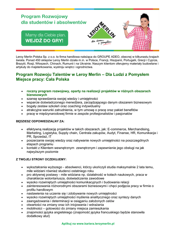 Leroy Merlin Polska Sp. z o.o. to firma handlowa należąca do GROUPE ADEO, obecnej w kilkunastu krajach świata. Ponad 450 sklepów Leroy Merlin działa m.in. w Polsce, Francji, Hiszpanii, Portugalii, Grecji i Cyprze, Brazylii, Rosji, Włoszech, Chinach, Rumunii i na Ukrainie. Naszym klientom oferujemy materiały budowlane i artykuły do majsterkowania, wystroju wnętrz i ogrodnictwa. Program Rozwoju Talentów w Leroy Merlin – Dla Ludzi z Pomysłem Miejsce pracy: Cała Polska roczny program rozwojowy, oparty na realizacji projektów w różnych obszarach biznesowych szansę sprawdzenia swojej wiedzy i umiejętności wsparcie doświadczonego menedżera, zarządzającego danym obszarem biznesowym bogaty zestaw szkoleń oraz coaching indywidualny atrakcyjne warunki zatrudnienia, w tym umowę o pracę oraz pakiet benefitów pracę w międzynarodowej firmie w zespole profesjonalistów i pasjonatów BĘDZIESZ ODPOWIEDZIALNY ZA: efektywną realizację projektów w takich obszarach, jak: E-commerce, Merchandising, Marketing, Logistyka, Supply chain, Centrala zakupów, Audyt, Finanse, HR, Komunikacja i PR, Sprzedaż, IT poszerzanie swojej wiedzy oraz nabywanie nowych umiejętności na poszczególnych etapach programu kontakt z Klientem wewnętrznym zewnętrznym i zapewnienie jego obsługi na jak najwyższym poziomie Z TWOJEJ STRONY OCZEKUJEMY: wykształcenia wyższego - absolwenci, którzy ukończyli studia maksymalnie 2 lata temu, mile widziani również studenci ostatniego roku pro aktywnej postawy - mile widziana np. działalność w kołach naukowych, praca w charakterze wolontariusza, doświadczenia zawodowe wysoko rozwiniętych umiejętności komunikacyjnych i budowania relacji zainteresowania różnorodnymi obszarami biznesowymi i chęci podjęcia pracy w firmie o profilu handlowym nastawienia na uczenie się i zdobywanie nowych umiejętności wysoko rozwiniętych umiejętności myślenia analitycznego oraz syntezy danych zaangażowania i determinacji w osiąganiu założonych celów otwartości na zmiany oraz ich inicjowania i wdrażania mobilności – gotowości do zmiany miejsca zamieszkania znajomości języka angielskiego (znajomość języka francuskiego będzie stanowiła dodatkowy atut) Aplikuj na www.kariera.leroymerlin.pl