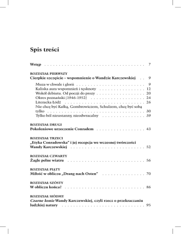 Spis treści Wstęp ��������������������������������������������������������������������������������������������������������� 7 Rozdział pierwszy Cierpkie szczęście – wspomnienie o Wandzie Karczewskiej ������� 9 Muza w chwale i glorii ������������������������������������������������������������������������ 9 Kaliska aura wspomnień i tęsknoty ������������������������������������������������� 12 Wokół debiutu. Od poezji do prozy �������������������������������������������������� 20 Okres poznański (1946-1952) ���������������������������������������������������������� 24 Literacka Łódź ������������������������������������������������������������������������������������� 26 Nie chcę być Kafką, Gombrowiczem, Schulzem, chcę być sobą tylko ������������������������������������������������������������������������������������������������������ 30 Tylko ból nieustanny, nieodwracalny ���������������������������������������������� 39 Rozdział drugi Pokoleniowe urzeczenie Conradem ��������������������������������������������������� 43 Rozdział trzeci „Etyka Conradowska” i jej recepcja we wczesnej twórczości Wandy Karczewskiej ������������������������������������������������������������������������������� 52 Rozdział czwarty Żagle pełne wiatru ���������������������������������������������������������������������������������� 56 Rozdział piąty Miłość w obliczu „Drang nach Osten” ���������������������������������������������� 70 Rozdział szósty W obliczu końca? ������������������������������������������������������������������������������������ 86 Rozdział siódmy Czarne konie Wandy Karczewskiej, czyli rzecz o przekraczaniu ludzkiej natury ���������������������������������������������������������������������������������������� 95 6 Spis treści Rozdział ósmy Wizerunek człowieka poszukującego ���������������������������������������������� 111 Generacja 1956 �������������������������������������������������������������������������������� Konflikt pokoleń ������������������������������������������������������������������������������ Przeciw mityzacji ���������������������������������������������������������������������������� Przeciw pozie egzystencjalnej ��������������������������������������������������������� Odejście według Zengla ������������������������������������������������������������������ 112 115 117 123 143 Rozdział dziewiąty Ułaskawienie świata i inne opowiadania �������������������������������������� 158 Rozdział dziesiąty Amerykańskie reminiscencje Wandy Karczewskiej w Weekendzie z Riverside ������������������������������������������������������������������ 178 Sprawa Mary, czyli przeszłość, która trwa ������������������������������������ 180 Powieść kobieca ����������������������������������������������