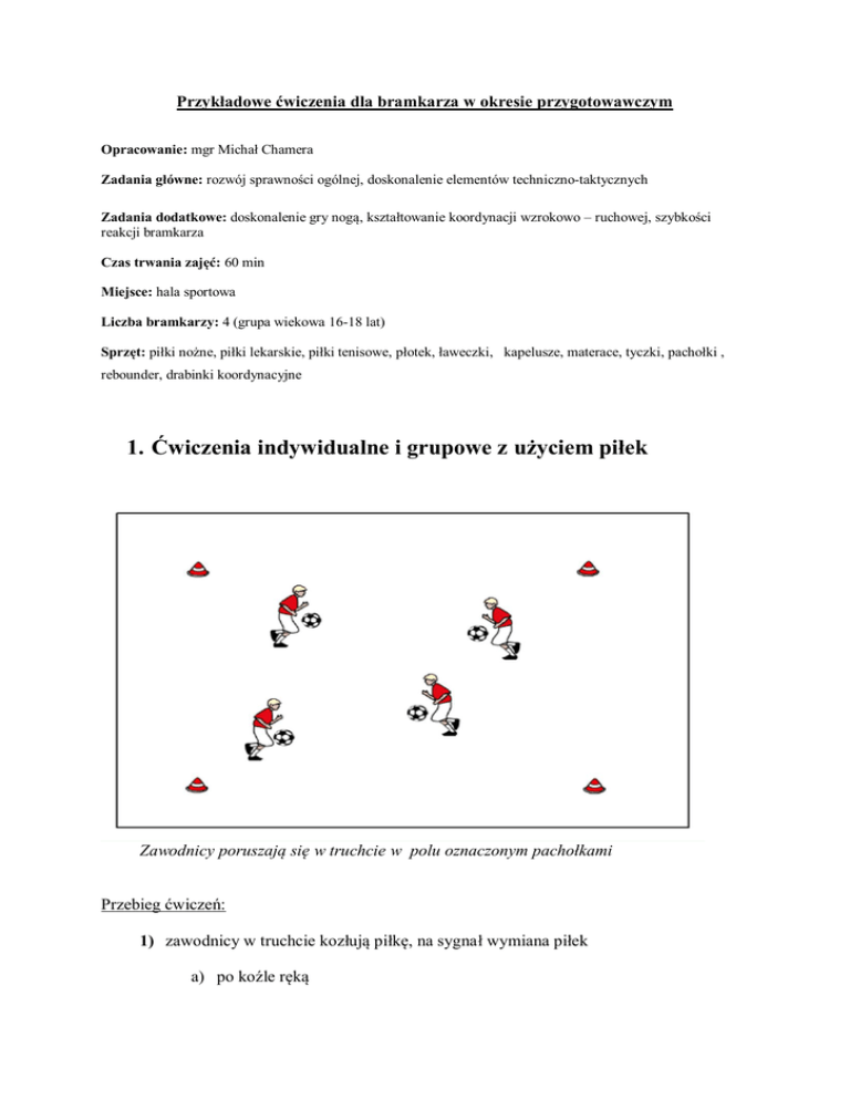 Przykładowe ćwiczenia dla bramkarza w okresie przygotowawczym Opracowanie: mgr Michał Chamera Zadania główne: rozwój sprawności ogólnej, doskonalenie elementów techniczno-taktycznych Zadania dodatkowe: doskonalenie gry nogą, kształtowanie koordynacji wzrokowo – ruchowej, szybkości reakcji bramkarza Czas trwania zajęć: 60 min Miejsce: hala sportowa Liczba bramkarzy: 4 (grupa wiekowa 16-18 lat) Sprzęt: piłki nożne, piłki lekarskie, piłki tenisowe, płotek, ławeczki, kapelusze, materace, tyczki, pachołki , rebounder, drabinki koordynacyjne 1. Ćwiczenia indywidualne i grupowe z użyciem piłek Zawodnicy poruszają się w truchcie w polu oznaczonym pachołkami Przebieg ćwiczeń: 1) zawodnicy w truchcie kozłują piłkę, na sygnał wymiana piłek a) po koźle ręką b) w powietrzu z przed klatki piersiowej c) po ziemi (zamachem dolnym) 2) kozłowanie piłki w pewnym momencie zawodnik odbija piłkę w wyższy kozioł wykonuje pad siatkarski lub do pompki ,szybkie powstanie i chwyt piłki 3) w podporze przodem kozłowanie piłki ,raz jedną raz druga ręką 1. Ćwiczenia indywidualne i grupowe z użyciem piłek Zawodnicy poruszają się w truchcie w polu oznaczonym pachołkami Przebieg ćwiczeń: 4) zawodnicy w truchcie kozłują dwie piłki (każdy!!!) a) jedna wyżej druga niżej b) kozłowanie ze zmianą 5) w parach wymiana dwóch piłek ,między sobą a. górą b. po koźle c. jedna górą ,druga po koźle 6 ) jedna piłka krążenie wokół bioder druga dorzucona przez partnera i oddanie piłki głową 2. Ćwiczenia z użyciem płotka 1) Podanie piłki ręka pod płotkiem ,przeskok i chwyt piłki 2) Podrzut piłki nad płotkiem ,przejście pod i chwyt piłki z powietrza 3) Zagranie piłki noga pod płotkiem, przeskok obunóż na płotkiem, uderzenie wew. cz. Stopy na chwyt dla zawodnika stojącego w bramce 4) Wyrzut piłki ręką nad płotkiem , przejście pod płotkiem ,chwyt piłki ,uderzenie piłki z wolej na chwyt na zawodnika stojącego w bramce 5) Przeskok z piłką nad płotkiem lub przejście z piłka pod płotkiem rzut ręka do bramki *dla ćwiczeń 1-5 ustawienie wyjściowe jak na rysunku poniżej 6) Podrzut piłki przez X1, chwyt i oddanie piłki lekarskiej od X2. X1 przeskok z piłka nad płotkiem, uderzenie piłki z półwoleja w bramkę, start do bramki,X3 po złapaniu piłki zagrywa piłkę do X4 ,którego zadaniem jest przyjęcie piłki i zagranie piłki po ziemi do X2 ,który odgrywa piłkę z powrotem do X4. X4 przyjmuje piłkę i prowadzi ją na miejsce X2 ( patrz rysunek) Zmiany zgodnie z ruchem wskazówek zegara 3. Ćwiczenia z wykorzystaniem ściany 1) Jedna piłka dla zawodnika, odbicie piłki o ściana jednorącz i chwyt również jednorącz 2) Dwie piłki dla każdego zawodnika, odbicia i chwyt piłek o ścianę a) w powietrzu b) po koźle 3) Zawodnik przodem do ściany w odległości około 3 m za nim zawodnik z piłką. Uderzenie piłki przez zawodnika z piłką z woleja o ścianę, chwyt piłki przez zawodnika stojącego z przodu (rys.1) 4) Ustawienie tak jw. na słowo TAK – chwyt piłki na Nie- przyjęcie piłki. Rzut piłki ręka przez zawodnika będącego z tyłu 5) Ustawienie jw. wykładnikiem są kolory piłek np.: piłka pomarańczowa to chwyt piłki, piłka biała to przyjęcie piłki. 6) Zawodnik przodem do ściany trzech zawodników z piłkami za jego plecami X1,lub X2 uderzają piłkę z woleja o ścianę ,chwyt piłki przez zawodnika, szybki obrót w stronę X3 i chwyt lub przyjęcie piłki (zależne od koloru piłek) (rys.2) 7)ustawienie zawodników w rzędzie około 5m przed ściana, za ich plecami ustawiony trener, który rzuca piłkę o ścianę wywołując imię bramkarza, jego zadaniem jest jak najszybszy chwyt piłki. 4. Ćwiczenia szybkości reakcji i koordynacji wzrokowo-ruchowej 1) Ustawienie jak na rysunku. Zawodnik X1 w postawie bramkarskiej z zamkniętymi oczami. Zawodnicy X2,X3 - różne kolory piłek (np.: czerwona ,zielona), na sygnał X1 lubX2 ( wcześniej ustalone) dorzuca piłkę bramkarzowi X1 ,który otwiera oczy i jeżeli otrzymuje piłkę zielona to ja chwyta, natomiast jeżeli czerwona to ją przyjmuję. Następnie X1,wykonuje szybki obrót w kierunku X4 i jeżeli np.: otrzymał piłkę najpierw zieloną to odgrywa piłkę wew.cz. stopy z powietrza (lewa, prawa, noga),natomiast jeżeli otrzymał czerwoną to odgrywa piłki głową . Różne warianty i rozwiązania a) różne kolory piłek b) po zamknięciu oczu zawodnicy X2, X3 wymieniają się piłkami c) różne formy ćwiczeń wykonywane przez X1 po dorzucie piłki od X4 4. Ćwiczenia szybkości reakcji i koordynacji wzrokowo-ruchowej 3) Ustawienie jak na rysunku, na sygnał bramkarze wykonują przewrót w przód na materacu i dotykają wywołanego przez trenera pachołka (czerwony lub żółty), start do piłki i chwyt jej podchwytem bez upadku. Odmiany: a) j. w. ale w trakcie wykonywania przewrotu trener wskazuje ręką (lewą lub prawą), którego pachołka powinien dotknąć bramkarz dalej jw. b) jw. ale przewrót w tył ,dotknięcie przeciwnego pachołka niż wskazany wcześniej przez trenera i start do piłki 4. Ćwiczenia szybkości reakcji i koordynacji wzrokowo-ruchowej 4) Ustawienie jak na rysunku Trener posiada 3 kolory piłek, zawodnik stojący przed trenerem ustawiony w postawie bramkarskiej. a) Jeżeli trener dorzuca piłkę koloru zielonego to bramkarz wykonuje przewrót w przód na materacu i chwyta jak najszybciej piłkę bez upadku b) Jeżeli trener dorzuca piłkę koloru pomarańczowego bramkarz wykonuje przewrót w tył na materacu i chwyta jak najszybciej piłkę bez upadku c) Jeżeli trener dorzuca piłkę koloru czarnego bramkarz wykonuje pad siatkarski na materacu i chwyta jak najszybciej piłkę bez upadku d) Jeżeli trener dorzuca piłkę koloru zielonego ale w kozioł bramkarz wykonuje jak najszybszy chwyt piłki z upadkiem na materacu e) Jeżeli trener dorzuca piłkę koloru pomarańczowego ale w kozioł bramkarz wykonuj