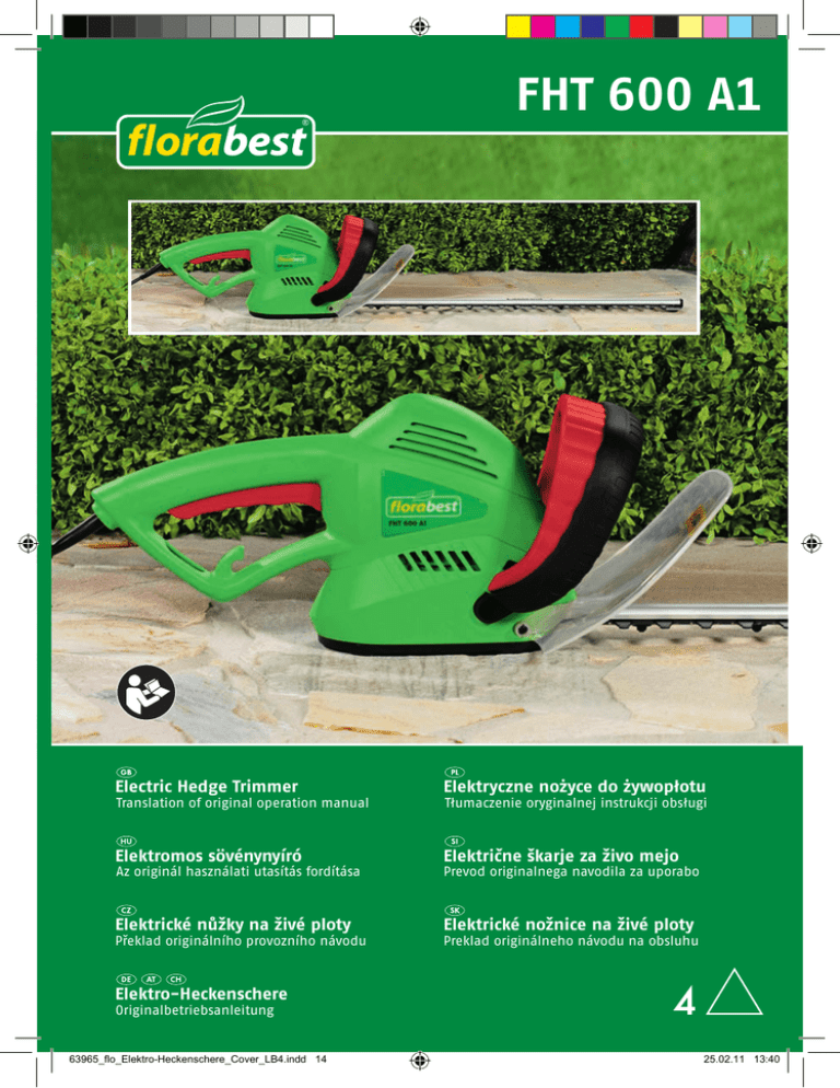 ® FHT 600 A1 E lectric Hedge Trimmer E lektryczne nożyce do żywopłotu E lektromos sövénynyíró A z originál használati utasítás fordítása E lektrične škarje za živo mejo E lektrické nůžky na živé ploty E lektrické nožnice na živé ploty Translation of original operation manual Překlad originálního provozního návodu E lektro-Heckenschere O riginalbetriebsanleitung 63965_flo_Elektro-Heckenschere_Cover_LB4.indd 14 Tłumaczenie oryginalnej instrukcji obsługi Prevod originalnega navodila za uporabo Preklad originálneho návodu na obsluhu 4 25.02.11 13:40 Before reading, unfold the page containing the illustrations and familiarise yourself with all functions of the device. Przed przeczytaniem proszę rozłożyć stronę z ilustracjami, a następnie proszę zapoznać się z wszystkimi funkcjami urządzenia. Olvasás előtt kattintson az ábrát tartalmazó oldalra és végezetül ismerje meg a készülék mindegyik funkcióját. Pred branjem odprite stran s slikami navzven in se nato seznanite z vsemi funkcijami naprave. Před čtením si otevřete stranu s obrázky a potom se seznamte se všemi funkcemi přístroje. Pred čítaním si odklopte stranu s obrázkami a potom sa oboznámte so všetkými funkciami prístroja. Klappen Sie vor dem Lesen die Seite mit den Abbildungen aus und machen Sie sich anschließend mit allen Funktionen des Gerätes vertraut. GB PL HU SI CZ SK DE / AT / CH Translation of original operation manual Tłumaczenie oryginalnej instrukcji obsługi Az originál használati utasítás fordítása Prevod originalnega navodila za uporabo Překlad originálního provozního návodu Preklad originálneho návodu na obsluhu Originalbetriebsanleitung 63965_flo_Elektro-Heckenschere_Cover_LB4.indd 15 Page Strona Oldal Stran Strana Strana Seite 4 14 24 34 45 55 65 25.02.11 13:40 A 1 5 4 3 2 6 7 8 9 10 C B 3 D 4 6 7 GB Beforefirstusingthemachine, pleasereadthisinstructionmanual carefully,foryourownsafetyand forthesafetyofothers.Keepthe manualinasafeplaceandpassit ontoanysubsequentownertoensurethattheinformationcontained thereinisavailableatalltimes. Notes on Safety Beforeworkingwiththeequipment,familiariseyourselfwithall operatingcomponents.Practice handlingtheequipmentandhave thefunction,operationandworkingmethodsexplainedtoyouby anexperienceduserorspecialist.Ensurethatyoucanshutoff theequipmentimmediatelyinan emergency.Inappropriateuseof thedevicemayresultinserious injury. Content Notes on Safety .................................... 4 SymbolsontheEquipment................ 4 Symbolsinthemanual....................... 5 GeneralSafetyDirectionsforPower Tools.................................................. 5 Hedgetrimmersafetywarnings......... 7 Intended Use ......................................... 7 General Description ............................. 8 FunctionDescription.......................... 8 Overview............................................ 8 Scopeofdelivery............................... 8 Mounting the Hand Protection ........... 8 Operating the Hedge Trimmer ............ 9 SwitchingOnandOff......................... 9 WorkingwiththeElectricHedge Trimmer.............................................. 9 CuttingTechniques............................ 9 Maintenance/Cleaning........................ 10 Storage .................................................11 Guarantee .............................................11 Technical Data .....................................11 Waste Disposal and Environmental Protection ............................................ 12 Spare Parts.......................................... 12 Trouble Shooting ................................ 13 EU declaration of conformity ............ 75 Exploded Drawing .............................. 79 Grizzly Service-Center ....................... 81 Symbols on the Equipment Caution! Readthroughtheinstructionmanualcarefully. Weareyeandearprotection. Donotusethehedgetrimmerin therainoronwethedges. Pulloutthepowerplugimmediatelyifthecableisdamaged,has beenbadlytwistedoriscompletely cutthroughandintheeventthat thedeviceisleftunattendedfora shorttime. LWA 98 dB Informationoftheacousticpower levelLWAindB. Machinesarenottobeplacewith domesticwaste. SafetyclassII Cuttinglength 4 GB Symbols in the manual Warning symbols with information on damage and injury prevention. Instructionsymbols(theinstructionisexplainedattheplaceofthe exclamationmark)withinformation onpreventingdamage. Helpsymbolswithinformationon improvingtoolhandling. while operating a power tool.Distractionscancauseyoutolosecontrol. Electrical safety • • General Safety Directions for Power Tools WARNING! Read all safety directions and instructions. Omissionsinthecompliancewithsafety directionsandinstructionscan causeelectricalshock,fireand/or severeinjuries. Retain all safety directions and instructions for future use. The term „power tool“ in the warnings refers to your mains-operated (corded) power tool or battery-operated (cordless) power tool. • • • Work area safety • • • Keep work area clean and well lit. Clutteredordarkareasinviteaccidents. Do not operate power tools in explosive atmospheres, such as in the presence of flammable Iiquids, gases or dust.Powertoolscreate sparkswhichmayignitethedustor fumes. Keep children and bystanders away • • Power tool plugs must match the outlet. Never modify the plug in any way. Do not use any adapter plugs with earthed (grounded) power tools.Unmodifiedplugsandmatching outletswillreduceriskofelectricshock Avoid body contact with earthed or grounded surfaces, such as pipes, radiators, ranges and refrigerators. Thereisanincreasedriskofelectricshockifyourbodyisearthedor grounded. Do not expose power tools to rain or wet conditions.Waterenteringa powertoolwillincreasetheriskofelectricshock. Do not abuse the cord. Never use the cord for carrying, pulling or unplugging the power tool. Keep cord away from heat, oil, sharp edges or moving parts.Damagedorentangledcordsincreas