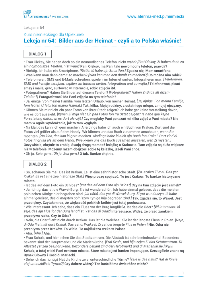 www.aterima-med.pl/niemiecki Lekcja nr 64 Kurs niemieckiego dla Opiekunek Lekcja nr 64: Bilder aus der Heimat - czyli a to Polska właśnie! DIALOG 1 • Frau Oleksy, Sie haben doch so ein neumodisches Telefon, nicht wahr? [Frał Oleksy, Zi haben doch zo ajn nojmodiszes Telefon, niśt waa?] Pani Oleksy, ma Pani taki nowomodny telefon, prawda? • Richtig. Ich habe ein Smartphone. [Riśtiś. Iś habe ajn Smartfon.] Zgadza się. Mam smartfona. • Was kann man denn damit so machen? [Was kan man den damit zo machen?] Co można nim robić? • Telefonieren, SMS und E-Mails schreiben, spielen, im Internet surfen, fotografieren usw. [Telefoniren, SMS und I-mejls szrajben, szpilen, im Internet serfen, fotografiren und zo wajta.] Telefonować, pisać smsy i maile, grać, surfować w Internecie, robić zdjęcia itd. • Fotografieren? Haben Sie Bilder auf diesem Telefon? [Fotografiren? Haben Zi Bilda ałf dizem Telefon?] Fotografować? Ma Pani zdjęcia na tym telefonie? • Ja, einige. Von meiner Familie, vom letzten Urlaub, von meiner Heimat. [Ja, ajnige. Fon maina Familje, fom lecten Urlałb, fon majna Hajmat.] Tak, kilka. Mojej rodziny, z ostatniego urlopu, z mojej ojczyzny. • Können Sie mir nicht ein paar Fotos von Ihrer Stadt zeigen? Ich habe gar keine Vorstellung davon, wie es dort aussieht. [Kynen Zi mija niśt ajn paa Fotos fon Ira Sztat cajgen? Iś habe gaa kajne Forsztelung dafon, wi es dort ałs-zijt.] Czy mogłaby Pani pokazać mi kilka zdjęć z Pani miasta? Nie mam w ogóle wyobrażenia, jak to tam wygląda. • Na klar, das kann ich gern machen. Allerdings habe ich auch ein Buch von Krakau. Dort sind die Fotos viel größer als auf dem Handy. Wir können uns das Buch zusammen anschauen, wenn Sie möchten. [Na klaa, das kan iś gern machen. Aladings habe iś ałch ajn Buch fon Krakał. Dort zind di Fotos fil grysa als ałf dem Hendi. Wija kynen uns das Buch cuzamen anszałen, wen Zi myśten.] Oczywiście, chętnie to zrobię. Swoją drogą mam też książkę o Krakowie. Tam zdjęcia są dużo większe niż w telefonie. Możemy razem obejrzeć sobie tę książkę, jeżeli Pani chce. • Oh ja. Sehr gern. [Oh ja. Zea gern.] O tak. Bardzo chętnie. DIALOG 2 • So, schauen Sie mal. Das ist Krakau. Es ist eine sehr historische Stadt. [Zo, szałen Zi mal. Das yst Krakał. Es yst ajne zea historisze Stat.] Więc proszę spojrzeć. To jest Kraków. To bardzo historyczne miasto. • Ist das auf dem Foto ein Schloss? [Yst das ałf dem Foto ajn Szlos?] Czy na tym zdjęciu jest zamek? • Ja richtig, das ist die Wawel-Burg. Sie ist wunderschön. Ich habe einmal gelesen, dass die meisten polnischen Könige hier begraben sind. [Ja riśtiś, das yst di Wawel-Burg. Zi yst wundaszyn. Iś habe ajnmal gelejzen, das di majsten polniszen Kynige hija begraben zind.] Tak, zgadza się, to Wawel. Jest przepiękny. Czytałam raz, że większość polskich królów jest tutaj pochowana. • Wie interessant. Ich sehe, dass ein Fluss vor der Burg langfließt. Ist das die Oder? [Wi interesant. Iś zeje, das ajn Flus for der Burg langflist. Yst das di Oda?] Interesujące. Widzę, że przed zamkiem przepływa rzeka. Czy to Odra? • Nein, die Oder fließt nicht durch Krakau. Das ist die Weichsel. Sie ist der längste Fluss in Polen. [Najn, di Oda flist niśt durś Krakał. Das yst di Wajksel. Zi yst der lengste Flus in Polen.] Nie, Odra nie przepływa przez Kraków. To Wisła. To najdłuższa rzeka w Polsce. • Aha. [Aha.] Aha. • Frau Schulz, und hier sehen Sie das Stadtzentrum. Die Altstadt ist sehr beeindruckend. Besonders bekannt sind der Hauptmarkt und die Marienkirche. [Frał Szulc, und hija zejen Zi das Sztatcentrum. Di Altsztat yst zea beajndrukend. Bezonders bekant zind der Hałptmarkt und di Marjenkirsie.] Pani Schulz, a tutaj widzi Pani centrum miasta. Stare miasto jest bardzo imponujące. Szczególnie znane są Rynek Główny i Kościół Mariacki. • Sehe ich das richtig? Hat die Kirche zwei unterschiedliche Türme? [Zeje iś das riśtiś? Hat di Kirsie cfaj untaszidlisie Tyrme?] Czy dobrze widzę? Ten kościół ma dwie różne wieże? 1 www.aterima-med.pl/niemiecki • Das haben Sie gut erkannt. Ein Turm ist tatsächlich höher als der andere. Es gibt aber noch viele andere Kirchen in Krakau. Insgesamt sind es ungefähr 100. [Das haben Zi gut erkant. Ajn Turm yst tatzechliś hyja als der andere. Es gibt aba noch file andere Kirsien in Krakał. Insgezamt zind es ungefea 100.] Dobrze to Pani rozpoznała. Jedna wieża faktycznie jest wyższa niż druga. Ale w Krakowie jest jeszcze dużo innych kościołów. Łącznie jest ich około 100. • Das ist eine Menge. Wie viele Leute wohnen eigentlich in der Stadt? [Das yst ajne Menge. Wi file Lojte wonen ajgentliś in der Sztat?] To bardzo dużo. Właściwie to ile osób mieszka w mieście? • Es gibt heute zirka eine Million Einwohner. Nach Warschau ist Krakau die zweitgrößte Stadt in Polen. • Und Warschau ist die Hauptstadt, richtig? [Und Warszał yst di Hałptsztat, riśtiś?] A Warszawa jest stolicą, prawda? • Sie sind ja gut informiert, Frau Schulz. Stimmt, Warschau ist die Hauptstadt. Aber bis zum Ende des 16. Jahrhunderts war Krakau die Hautpstadt des Landes. [Zi zind ja gut informirt, Frał Szulc. Sztymt, Warszał yst di Hałptsztat. Aba bis cum Ende des zekscejnten Jarhunderts war Krakał di Hałptsztat des Landes.] Jest Pani dobrze poinformowana, Pani Schulz. Zgadza się, Warszawa jest stolicą. Ale do końca XVI wieku to Kraków był stolicą kraju. • Interessant. Sie haben mir jetzt so viel von Ihrer schönen Heimat gezeigt. Aber ich weiß überhaupt nicht, wo die Stadt überhaupt liegt. [Interesant. Zi haben mija ject zo fil fon Ira szynen Hajmat gecajgt. Aba iś wajs ybahałpt niśt, wo di Sztat ybahałpt ligt.] Interesujące. Pokazała mi Pani tak dużo ze swojej pięknej ojczyzny. Ale w ogóle nie wiem, gdzie to miasto leży. DIALOG 3 • Ich habe hier eine Landkarte von Polen. Gucken Sie mal, Krakau liegt ganz im Süden. [
