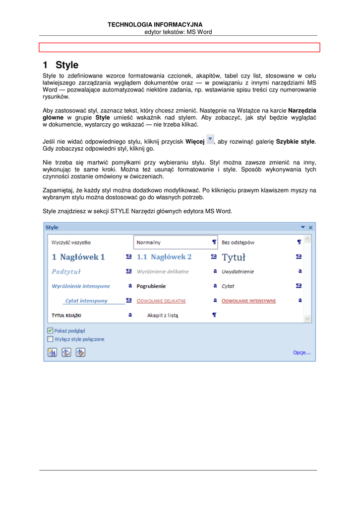 TECHNOLOGIA INFORMACYJNA edytor tekstów: MS Word 1 Style Style to zdefiniowane wzorce formatowania czcionek, akapitów, tabel czy list, stosowane w celu łatwiejszego zarządzania wyglądem dokumentów oraz — w powiązaniu z innymi narzędziami MS Word — pozwalające automatyzować niektóre zadania, np. wstawianie spisu treści czy numerowanie rysunków. Aby zastosować styl, zaznacz tekst, który chcesz zmienić. Następnie na Wstążce na karcie Narzędzia główne w grupie Style umieść wskaźnik nad stylem. Aby zobaczyć, jak styl będzie wyglądać w dokumencie, wystarczy go wskazać — nie trzeba klikać. Jeśli nie widać odpowiedniego stylu, kliknij przycisk Więcej Gdy zobaczysz odpowiedni styl, kliknij go. , aby rozwinąć galerię Szybkie style. Nie trzeba się martwić pomyłkami przy wybieraniu stylu. Styl można zawsze zmienić na inny, wykonując te same kroki. Można też usunąć formatowanie i style. Sposób wykonywania tych czynności zostanie omówiony w ćwiczeniach. Zapamiętaj, że każdy styl można dodatkowo modyfikować. Po kliknięciu prawym klawiszem myszy na wybranym stylu można dostosować go do własnych potrzeb. Style znajdziesz w sekcji STYLE Narzędzi głównych edytora MS Word.