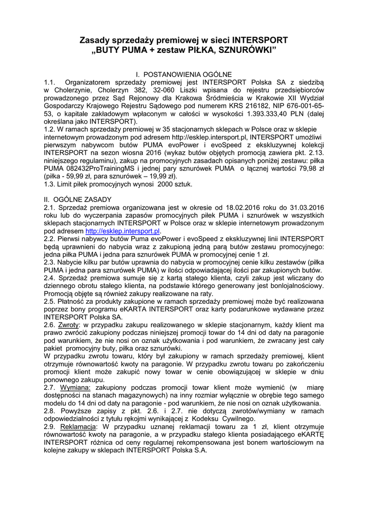 Zasady sprzedaży premiowej w sieci INTERSPORT „BUTY PUMA + zestaw PIŁKA, SZNURÓWKI” I. POSTANOWIENIA OGÓLNE 1.1. Organizatorem sprzedaży premiowej jest INTERSPORT Polska SA z siedzibą w Cholerzynie, Cholerzyn 382, 32-060 Liszki wpisana do rejestru przedsiębiorców prowadzonego przez Sąd Rejonowy dla Krakowa Śródmieścia w Krakowie XII Wydział Gospodarczy Krajowego Rejestru Sądowego pod numerem KRS 216182, NIP 676-001-6553, o kapitale zakładowym wpłaconym w całości w wysokości 1.393.333,40 PLN (dalej określana jako INTERSPORT). 1.2. W ramach sprzedaży premiowej w 35 stacjonarnych sklepach w Polsce oraz w sklepie internetowym prowadzonym pod adresem http://esklep.intersport.pl, INTERSPORT umożliwi pierwszym nabywcom butów PUMA evoPower i evoSpeed z ekskluzywnej kolekcji INTERSPORT na sezon wiosna 2016 (wykaz butów objętych promocją zawiera pkt. 2.13. niniejszego regulaminu), zakup na promocyjnych zasadach opisanych poniżej zestawu: piłka PUMA 082432ProTrainingMS i jednej pary sznurówek PUMA o łącznej wartości 79,98 zł (piłka - 59,99 zł, para sznurówek – 19,99 zł). 1.3. Limit piłek promocyjnych wynosi 2000 sztuk. II. OGÓLNE ZASADY 2.1. Sprzedaż premiowa organizowana jest w okresie od 18.02.2016 roku do 31.03.2016 roku lub do wyczerpania zapasów promocyjnych piłek PUMA i sznurówek w wszystkich sklepach stacjonarnych INTERSPORT w Polsce oraz w sklepie internetowym prowadzonym pod adresem http://esklep.intersport.pl. 2.2. Pierwsi nabywcy butów Puma evoPower i evoSpeed z ekskluzywnej linii INTERSPORT będą uprawnieni do nabycia wraz z zakupioną jedną parą butów zestawu promocyjnego: jedna piłka PUMA i jedna para sznurówek PUMA w promocyjnej cenie 1 zł. 2.3. Nabycie kilku par butów uprawnia do nabycia w promocyjnej cenie kilku zestawów (piłka PUMA i jedna para sznurówek PUMA) w ilości odpowiadającej ilości par zakupionych butów. 2.4. Sprzedaż premiowa sumuje się z kartą stałego klienta, czyli zakup jest wliczany do dziennego obrotu stałego klienta, na podstawie którego generowany jest bonlojalnościowy. Promocją objęte są również zakupy realizowane na raty. 2.5. Płatność za produkty zakupione w ramach sprzedaży premiowej może być realizowana poprzez bony programu eKARTA INTERSPORT oraz karty podarunkowe wydawane przez INTERSPORT Polska SA. 2.6. Zwroty: w przypadku zakupu realizowanego w sklepie stacjonarnym, każdy klient ma prawo zwrócić zakupiony podczas niniejszej promocji towar do 14 dni od daty na paragonie pod warunkiem, że nie nosi on oznak użytkowania i pod warunkiem, że zwracany jest cały pakiet promocyjny buty, piłka oraz sznurówki. W przypadku zwrotu towaru, który był zakupiony w ramach sprzedaży premiowej, klient otrzymuje równowartość kwoty na paragonie. W przypadku zwrotu towaru po zakończeniu promocji klient może zakupić nowy towar w cenie obowiązującej w sklepie w dniu ponownego zakupu. 2.7. Wymiana: zakupiony podczas promocji towar klient może wymienić (w miarę dostępności na stanach magazynowych) na inny rozmiar wyłącznie w obrębie tego samego modelu do 14 dni od daty na paragonie - pod warunkiem, że nie nosi on oznak użytkowania. 2.8. Powyższe zapisy z pkt. 2.6. i 2.7. nie dotyczą zwrotów/wymiany w ramach odpowiedzialności z tytułu rękojmi wynikającej z Kodeksu Cywilnego. 2.9. Reklamacja: W przypadku uznanej reklamacji towaru za 1 zł, klient otrzymuje równowartość kwoty na paragonie, a w przypadku stałego klienta posiadającego eKARTĘ INTERSPORT różnica od ceny regularnej rekompensowana jest bonem wartościowym na kolejne zakupy w sklepach INTERSPORT Polska S.A. 2.10. W przypadku zakupu realizowanego w sklepie internetowym prowadzonym przez INTERSPORT pod adresem http://esklep.intersport.pl, zgodnie z Ustawą z dnia 30 maja 2014 roku o prawach konsumenta, Uczestnik Promocji będący Konsumentem, może odstąpić od umowy bez podania przyczyny w ciągu 14 dni od daty odebrania przesyłki. Uczestnik promocji nie będący konsumentem może dokonać zwrotu towaru zakupionego w sklepie internetowym prowadzonym przez INTERSPORT, na warunkach określonych w pkt. 2.6 powyżej. 2.11. W sprzedaży premiowej nie mogą brać udziału pracownicy INTERSPORT oraz ich rodziny. 2.12. Promocja nie sumuje się z innymi promocjami. 2.13. Lista butów biorących udział w promocji: Buty Puma103273eSpeed4.4FGCPD Buty Puma103282eSpeed5.4INCPD Buty Puma103283eSpeed5.4TFCPD Buty Puma103286eSpeed5.4FGCPD Buty Puma103293eSpeed5.4FGJrCPD Buty Puma103294eSpeed5.4INJrCPD Buty Puma103296eSpeed5.4TFJrCPD Buty Puma103536ePower4.3FGCPD Zestaw promocyjny: Piłka Puma082432ProTrainingMS Sznurówki Puma EvoPowerSR053133 Sznurówki Puma EvoSpeedJR053136 Sznurówki Puma EvoSpeedSR053135 2.14. W przypadku gdy klient dokonuje zakupu w ramach promocji w e-sklepie prowadzonym przez INTERSPORT promocji pod adresem http://esklep.intersport.pl to do tej transakcji mają również zastosowanie zapisy regulaminu e-sklepu dostępne na stronie http://esklep.intersport.pl/pl/regulamin-nowy. 2.15. Niniejszy Regulamin jest dostępny w sklepach stacjonarnych i na witrynie INTERSPORT do dnia 14.04.2016 roku. 2.15. Wszelkie zapytania związane z Promocją powinny być kierowane na adres [email protected]