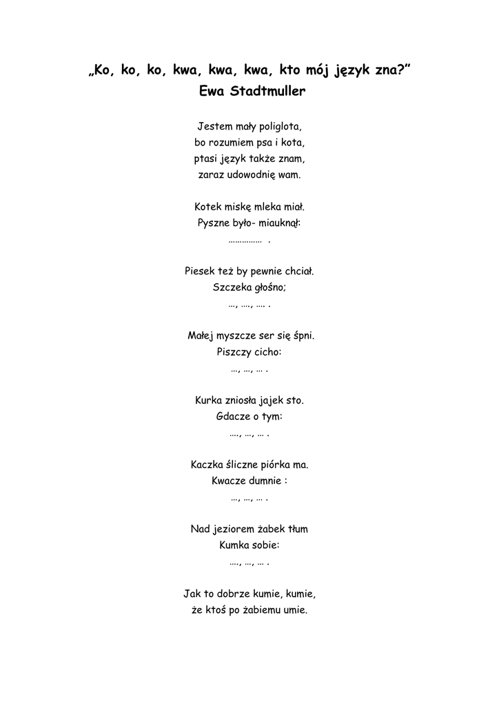 „Ko, ko, ko, kwa, kwa, kwa, kto mój język zna?” Ewa Stadtmuller Jestem mały poliglota, bo rozumiem psa i kota, ptasi język także znam, zaraz udowodnię wam. Kotek miskę mleka miał. Pyszne było- miauknął: …………… . Piesek też by pewnie chciał. Szczeka głośno; …, …., …. . Małej myszcze ser się śpni. Piszczy cicho: …, …, … . Kurka zniosła jajek sto. Gdacze o tym: …., …, … . Kaczka śliczne piórka ma. Kwacze dumnie : …, …, … . Nad jeziorem żabek tłum Kumka sobie: …., …, … . Jak to dobrze kumie, kumie, że ktoś po żabiemu umie. „Bal” Pan Języczek wybiera się na bal karnawałowy. Chce wyglądać pięknie, postanawia więc uszyć sobie strój balowy. Składa wizytę krawcowej. Krawcowa bierze miarę (kilkukrotnie dotykamy językiem prawego kącika ust, potem lewego kącika, potem górnej wargi, dolnej wargi), robi wykrój (językiem wysuniętym z buzi rysujemy w powietrzu koła), tnie materiał („nasze wargi są nożyczkami”- na przemian rozciągam wargi w uśmiechu i układam je w „ dzióbek”). Wreszcie zasiada do maszyny do szycia . Maszyna turkoce (wypowiadamy „tur, tur, tur”), strój Języczka jest gotowy. Teraz już może iść na bal. Sala balowa wygląda pięknie, przystrojona kolorowymi balonami (robimy z buzi „balonik”- wdychamy powietrze nosem i zatrzymujemy je przez chwilę w buzi, nadymając policzki, następnie wypuszczamy powietrze ustami) i serpentynami (robimy z języka „serpentynę”- wolno wysuwamy język z buzi ruchem wahadłowym- od prawej do lewej strony, następnie chowamy język tym samym ruchem). Orkiestra gra skoczne melodie (śpiewamy w różnym tempie: la, la, la). Rozbawieni goście tańczą. Pan Języczek również tańczy (otwierając buzię szeroko poruszamy językiem w różne strony). Na balu można skosztować coś pysznego (oblizujemy wargi ruchem okrężnym). Wszyscy bawią się wyśmienicie (śmiejemy się „ha, ha; ho, ho; hi, hi; he, he ). Na podstawie: „Języczkowe przygody i inne bajeczki” Anna Tońska-Mrowiec. Rymowanka Sia, sia, sia- baranki dwa. Sio, sio, sio- małpka w zoo. Sie, sie, sie- lubię Cię. Siu, siu, siu- słodkich snów. Na podstawie: „Zaczarowany języczek w krainie zwierząt” Katarzyna Patalan.