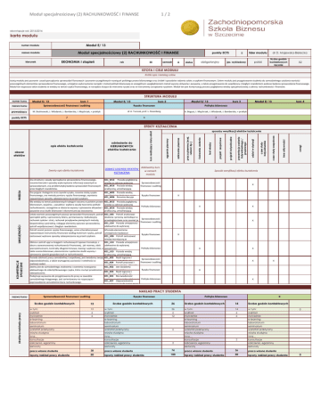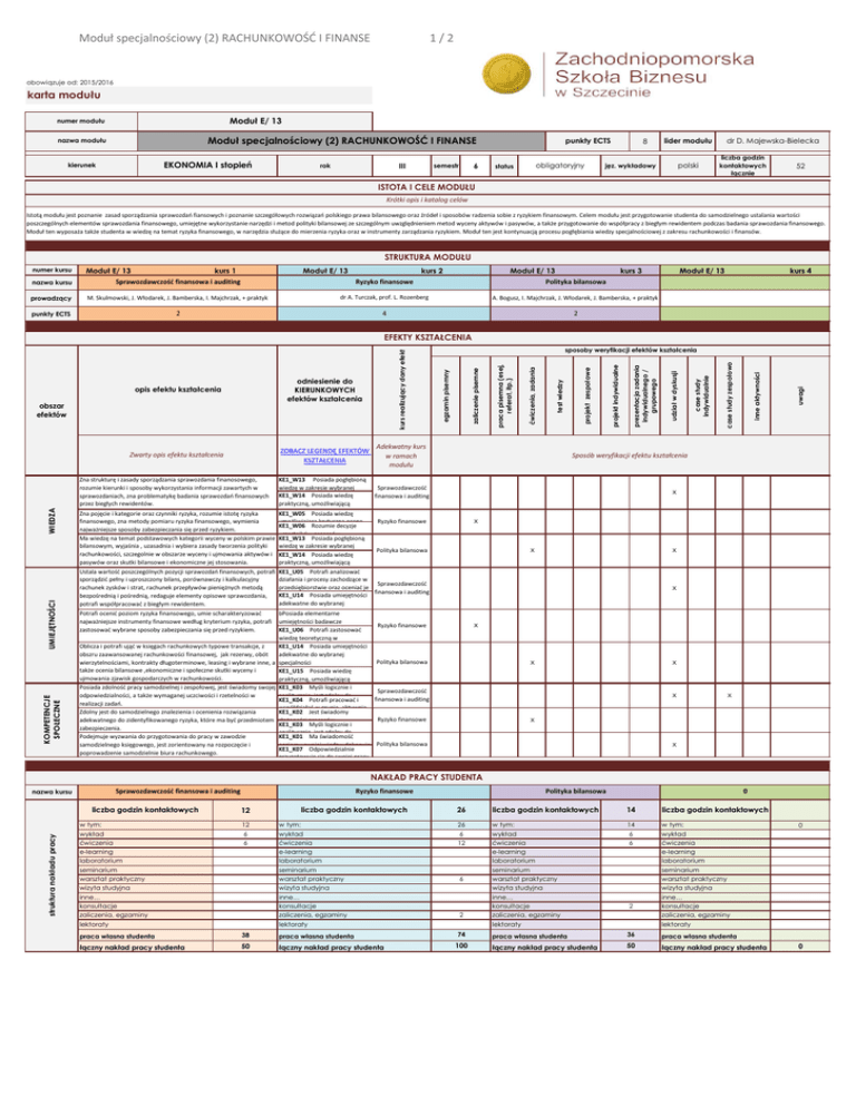 Moduł specjalnościowy (2) RACHUNKOWOŚĆ I FINANSE 1/2 obowiązuje od: 2015/2016 karta modułu Moduł E/ 13 numer modułu Moduł specjalnościowy (2) RACHUNKOWOŚĆ I FINANSE nazwa modułu EKONOMIA I stopień kierunek III rok 6 semestr punkty ECTS obligatoryjny status 8 lider modułu polski jęz. wykładowy dr D. Majewska-Bielecka liczba godzin kontaktowych łącznie 52 ISTOTA I CELE MODUŁU Krótki opis i katalog celów Istotą modułu jest poznanie zasad sporządzania sprawozdań fiansowych i poznanie szczegółowych rozwiązań polskiego prawa bilansowego oraz źródeł i sposobów radzenia sobie z ryzykiem finansowym. Celem modułu jest przygotowanie studenta do samodzielnego ustalania wartości poszczególnych elementów sprawozdania finansowego, umiejętne wykorzystanie narzędzi i metod polityki bilansowej ze szczególnym uwzględnieniem metod wyceny aktywów i pasywów, a także przygotowanie do współpracy z biegłym rewidentem podczas badania sprawozdania finansowego. Moduł ten wyposaża także studenta w wiedzę na temat ryzyka finansowego, w narzędzia służące do mierzenia ryzyka oraz w instrumenty zarządzania ryzykiem. Moduł ten jest kontynuacją procesu pogłębiania wiedzy specjalnościowej z zakresu rachunkowości i finansów. STRUKTURA MODUŁU numer kursu Moduł E/ 13 kurs 1 Moduł E/ 13 kurs 2 Moduł E/ 13 kurs 3 nazwa kursu Sprawozdawczość finansowa i auditing Ryzyko finansowe Polityka bilansowa prowadzący M. Skulmowski, J. Włodarek, J. Bamberska, I. Majchrzak, + praktyk dr A. Turczak, prof. L. Rozenberg A. Bogusz, I. Majchrzak, J. Włodarek, J. Bamberska, + praktyk punkty ECTS 2 4 2 Moduł E/ 13 kurs 4 KOMPETENCJE SPOŁECZNE UMIEJĘTNOŚCI WIEDZA Zna strukturę i zasady sporządzania sprawozdania finanosowego, rozumie kierunki i sposoby wykorzystania informacji zawartych w sprawozdaniach, zna problematykę badania sprawozdań finansowych przez biegłych rewidentów. Zna pojęcie i kategorie oraz czynniki ryzyka, rozumie istotę ryzyka finansowego, zna metody pomiaru ryzyka finansowego, wymienia najważniejsze sposoby zabezpieczania się przed ryzykiem. Ma wiedzę na temat podstawowych kategorii wyceny w polskim prawie bilansowym, wyjaśnia , uzasadnia i wybiera zasady tworzenia polityki rachunkowości, szczegolnie w obszarze wyceny i ujmowania aktywów i pasywów oraz skutki bilansowe i ekonomiczne jej stosowania. KE1_W13 Posiada pogłębioną wiedzę w zakresie wybranej KE1_W14 Posiada wiedzę praktyczną, umożliwiającą podjęcie zawodowej KE1_W05pracy Posiada wiedzęlub uwagi inne aktywności case study zespołowo case study indywidualnie udział w dyskusji prezentacja zadania indywidualnego / grupowego projekt indywidualne projekt zespołowe test wiedzy Adekwatny kurs w ramach modułu ćwiczenia, zadania ZOBACZ LEGENDĘ EFEKTÓW KSZTAŁCENIA praca pisemna (esej, referat, itp.) Zwarty opis efektu kształcenia obszar efektów zaliczenie pisemne odniesienie do KIERUNKOWYCH efektów kształcenia sposoby weryfikacji efektów kształcenia egzamin pisemny opis efektu kształcenia kurs realizujący dany efekt EFEKTY KSZTAŁCENIA Sposób weryfikacji efektu kształcenia Sprawozdawczość finansowa i auditing x x Ryzyko finansowe umożliwiającą krytyczną ocenę KE1_W06 Rozumie decyzje uczestników procesów KE1_W13 Posiada pogłębioną wiedzę w zakresie wybranej Polityka bilansowa specjalności;Posiada zna podstawowe KE1_W14 wiedzę praktyczną, umożliwiającą podjęcie pracy zawodowej lub Ustala wartość poszczególnych pozycji sprawozdań finansowych, potrafi KE1_U05 Potrafi analizować sporządzić pełny i uproszczony bilans, porównawczy i kalkulacyjny działania i procesy zachodzące w Sprawozdawczość rachunek zysków i strat, rachunek przepływów pieniężnych metodą przedsiębiorstwie oraz oceniać je finansowa i auditing KE1_U14 Posiada umiejętności bezpośrednią i pośrednią, redaguje elementy opisowe sprawozdania, adekwatne do wybranej potrafi współpracować z biegłym rewidentem. specjalności Potrafi ocenić poziom ryzyka finansowego, umie scharakteryzować bPosiada elementarne najważniejsze instrumenty finansowe według kryterium ryzyka, potrafi umiejętności badawcze Ryzyko finansowe zastosować wybrane sposoby zabezpieczania się przed ryzykiem. (analitycznePotrafi i prognostyczne) KE1_U06 zastosować wiedzę teoretyczną w określonymPosiada obszarze zjawisk Oblicza i potrafi ująć w księgach rachunkowych typowe transakcje, z KE1_U14 umiejętności obszru zaawansowanej rachunkowości finansowej, jak rezerwy, obót adekwatne do wybranej Polityka bilansowa wierzytelnościami, kontrakty długoterminowe, leasing i wybrane inne, a specjalności także ocenia bilansowe ,ekonomiczne i społeczne skutki wyceny i KE1_U15 Posiada wiedzę ujmowania zjawisk gospodarczych w rachunkowości. praktyczną, umożliwiającą podjęcie pracy zawodowej Posiada zdolność pracy samodzielnej i zespołowej, jest świadomy swojej KE1_K03 Myśli logicznie i lub Sprawozdawczość odpowiedzialności, a także wymaganej uczciwości i rzetelności w analitycznie, jest zdolny do finansowa i auditing KE1_K04 Potrafi pracować i realizacji zadań. współdziałać w grupie, aktywnie Zdolny jest do samodzielnego znalezienia i ocenienia rozwiązania KE1_K02 Jest świadomy Ryzyko finansowe adekwatnego do zidentyfikowanego ryzyka, które ma być przedmiotem złożoności procesów KE1_K03 Myśli logicznie i zabezpieczenia. analitycznie, jest zdolny do Podejmuje wyzwania do przygotowania do pracy w zawodzie KE1_K01 Ma świadomość samodzielnego księgowego, jest zorientowany na rozpoczęcie i poziomu swojej wiedzy, dokonuje Polityka bilansowa KE1_K07 Odpowiedzialnie poprowadzenie samodzielnie biura rachunkowego. przygotowuje się do swojej pracy, x x x x x x x x x x NAKŁAD PRACY STUDENTA nazwa kursu Sprawozdawczość finansowa i auditing struktura nakładu pracy liczba godzin kontaktowych w tym: wykład ćwiczenia e-learning laboratorium seminarium warsztat