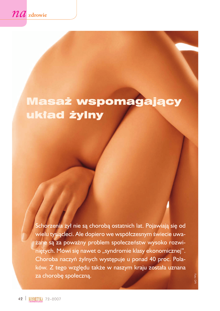 na zdrowie Masaż wspomagający układ żylny 42 72–2007 Foto: OPI Schorzenia żył nie są chorobą ostatnich lat. Pojawiają się od wielu tysiącleci. Ale dopiero we współczesnym świecie uważane są za poważny problem społeczeństw wysoko rozwiniętych. Mówi się nawet o „syndromie klasy ekonomicznej”. Choroba naczyń żylnych występuje u ponad 40 proc. Polaków. Z tego względu także w naszym kraju została uznana za chorobę społeczną. Z adaniem układu żylnego kończyn dolsiączką i w czasie owulacji. nych jest transport krwi w kierunku Masaż nóg powinien być przeprowadzony koserca. Proces ten odbywa się ku górze, lejno na udzie, podudziu i stopie z zachowawbrew grawitacji. Jest możliwy dzięki pracy niem kierunku dosercowego i zgodnego z przemięśni nóg i układowi zastawek zabezpieczająbiegiem naczyń limfatycznych. Masaż należy cych przed cofaniem się krwi w żyłach. Żylaki wykonać zarówno jednoręcznie, jak i oburącz, są najczęstszą chorobą żył. Dolegliwość ta jest uwzględniając ruchy głaszczące, drenujące, obspowodowana wrodzoną słabością żył i zaburęczowe, bransoletkowe, które się przeplata. rzeniami prawidłowego funkcjonowania zastaNależy pamiętać również o uciskach w okoliwek żylnych. U podstawy schorzenia leżą niecy dołu podkolanowego. Dodatkowo wskazane prawidłowości w przepływie krwi w żyłach wraz jest połączenie wspomnianego masażu z maz postępującym poszerzeniem żył, uszkodzesażem okolicy powłok brzusznych, jednakże tę niem zastawek i wzrostem ciśnienia w naczyczęść zabiegu wykonujemy po konsultacji z leniach objętych procesem chorobowym. karzem! Początkowo typowymi dolegliwościami są: Masaż Sophie Meyer jest ściśle skorelowauczucie ciężkości nóg, swędzenie, skurcze łyny z funkcjonowaniem układu oddechowego dek i ból nóg, zwłaszcza po dłuższym staniu. i musi także uwzględniać obecność narządów Z postępem choroby pojawiają się obrzęki, siwewnętrznych. Do zabiegu należy stosować ne, węzełkowate zgrubienia na żyłach, przebarprodukty nawilżające. Masaż daje podobne wienia skóry i trudno gojące się owrzodzenia. efekty jak drenaż limfatyczny: zdecydowanie Pomimo że chopoprawia funkcjoroba przysparza Żylaki ma co czwarta kobieta i co dzie- nowanie układu dużo problemów żylnego i szybko siąty mężczyzna. Choroby żył są spowo- przynosi widoczi jej przebieg jest bolesny, wiedowane skłonnościami dziedzicznymi, ne efekty. Powile osób zwraca się nien być stosowaale także niewłaściwym trybem życia. ny w przypadku o pomoc dopiero w późnym jej staNa pierwszy czynnik nie mamy wpływu. przewlekłej niedium. A przecież wydolności krążeNatomiast możemy zmienić codziennie nia obwodowego. początkowe obprzyzwyczajenia tak, by zapobiec roz- Najważniejszym jawy są tak charakterystyczne, przeciwwskazawojowi choroby. że gdyby ich nie niem do zabielekceważyć, wówgu są owrzodzeczas leczenie zapobiegawcze byłoby dużo efeknia okolicy podudzia. Masaż kończyn dolnych tywniejsze, a dolegliwości nie tak dokuczliwe. wpływa pobudzająco na układ krwionośny i limfatyczny, czego efektem jest lepszy transport składników odżywczych oraz tlenu do tkanek. Równocześnie ulega poprawie proces Terapia masażem usuwania produktów przemiany materii, liChociaż żylaki w zaawansowanym stadium są kwidując i wchłaniając obrzęki oraz objawy zapoważnym przeciwwskazaniem do wykonywastoinowe. Następuje zmniejszenie oporu krwi nia masażu, to jednak jest on jednym ze skuw tętnicach, a szybkość przepływu wzrasta. teczniejszych elementów profilaktyki. WymieCzęstotliwość zabiegów jest w dużej mierze nić tu można np. masaż wspomagający układ uzależniona od objawów chorobowych oraz od żylny opracowany przez Sophie Meyer z paryreakcji organizmu pacjenta na masaż. Najczęśskiej Massage Academy. Zabieg ten polecany ciej zaleca się wykonywanie zabiegów 2-3 razy jest szczególnie w okresie letnim. Stosując go w tygodniu, a seria powinna obejmować około w pierwszej fazie choroby można wpłynąć na 10 masaży. ograniczenie jej postępu. W celu utrwalenia efektów terapeutycznych Najlepiej wykonać tego typu masaż przed mie- www.kosmetykaikosmetologia.pl 43 na zdrowie zaleca się wykonywanie tzw. automasaży. Są to zabiegi, które pacjent wykonuje samodzielnie. Stosuje techniki głaskania, rozcierania i ugniatania w kierunku dosercowym. W trakcie tego zabiegu lub bezpośrednio po nim zaleca się stosowanie odpowiednich maści i żeli, które wspomagają efekt leczenia. Zmiany w obrębie naczyń żylnych można leczyć także za pomocą tzw. kompresoterapii. Jest to metoda zalecana przez lekarzy. Ma ona na celu przeciwdziałanie obrzękom i zastojom, a także zwiększa szybkość odpływu krwi z nóg i obniża ciśnienie żylne. Metoda jest bezpieczna, czego dowód stanowi zalecanie jej kobietom w ciąży. Opaski charakteryzują się różnorodnym stopniem ucisku. Powinny być zakładane od dolnej części nogi w sposób równomierny z jednakową siłą, najlepiej rano przed wstaniem z łóżka (wtedy obrzęki są najmniejsze). Wskazania dla osób z chorobą układu żylnego: Ø u nikamy długotrwałego stania i siedzenia Ø unikamy długotrwałych podróży (zalecany jest częsty odpoczynek w trakcie podróży) Ø utrzymujemy prawidłową wagę ciała Ø unikamy ciepła (opalania, depilacji gorącym woskiem, ogrzewania podłogowego) Ø unikamy antykoncepcji Ø ograniczamy cukier i sól Ø pijemy codziennie ok. 1,5 l wody mineralnej niegazowanej (u osób niemających problemów z wydolnością nerek) Ø odpowiednio unosimy kończyny w trakcie relaksu (co ułatwia odpływ krwi z nóg do serca) Ø umiarkowanie uprawiamy gimnastykę (rower, pływanie, spacery) Ø stosujemy luźny ubiór Ø stosujemy odpowiednie obuwie (nie za wysokie obcasy) Ø wykonujemy automasaż z użyciem produktów usuwających obrzęki Ø hartujemy nogi 