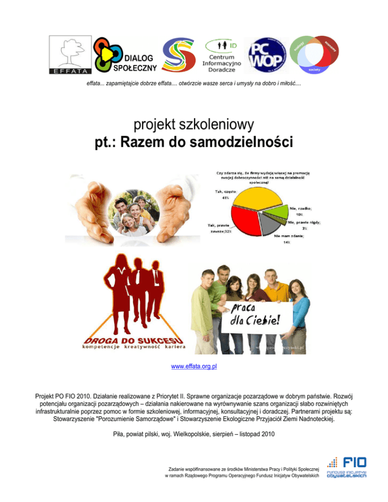 effata... zapamiętajcie dobrze effata.... otwórzcie wasze serca i umysły na dobro i miłość.... projekt szkoleniowy pt.: Razem do samodzielności www.effata.org.pl Projekt PO FIO 2010. Działanie realizowane z Priorytet II. Sprawne organizacje pozarządowe w dobrym państwie. Rozwój potencjału organizacji pozarządowych – działania nakierowane na wyrównywanie szans organizacji słabo rozwiniętych infrastrukturalnie poprzez pomoc w formie szkoleniowej, informacyjnej, konsultacyjnej i doradczej. Partnerami projektu są: Stowarzyszenie "Porozumienie Samorządowe" i Stowarzyszenie Ekologiczne Przyjaciół Ziemi Nadnoteckiej. Piła, powiat pilski, woj. Wielkopolskie, sierpień – listopad 2010 Zadanie współfinansowane ze środków Ministerstwa Pracy i Polityki Społecznej w ramach Rządowego Programu Operacyjnego Fundusz Inicjatyw Obywatelskich effata... zapamiętajcie dobrze effata.... otwórzcie wasze serca i umysły na dobro i miłość.... Stowarzyszenie Inicjatyw Społecznych EFFATA, zaprasza organizacje pozarządowe do projektu szkoleniowego pt.: Razem do samodzielności. Ministerstwo Pracy i Polityki Społecznej przyznało nam dotację z konkursu Programu Operacyjnego Fundusz Inicjatyw Obywatelskich 2010. Projekt nr 639. Projekt PO FIO 2010. Działanie realizowane z Priorytet II. Sprawne organizacje pozarządowe w dobrym państwie. Rozwój potencjału organizacji pozarządowych – działania nakierowane na wyrównywanie szans organizacji słabo rozwiniętych infrastrukturalnie poprzez pomoc w formie szkoleniowej, informacyjnej, konsultacyjnej i doradczej. Partnerami projektu są: Stowarzyszenie "Porozumienie Samorządowe" i Stowarzyszenie Ekologiczne Przyjaciół Ziemi Nadnoteckiej. Celem głównym projektu jest zwiększenie potencjału organizacji pozarządowych funkcjonujących na terenie powiatu pilskiego w okresie 5 miesięcy trwania projektu poprzez organizację szkoleń oraz pomoc w znalezieniu wolontariuszy. W odpowiedzi na zapotrzebowanie organizacji pozarządowych, pragniemy stworzyć podstawy ku podjęciu aktywności poprzez organizację szkoleń oraz treningów umiejętności, by te w przyszłości mogły podejmować inicjatywy na rzecz społeczności lokalnej z wykorzystaniem jak największej liczby wolontariuszy. Wstępny harmonogram szkoleń: 17.IX, Czym jest wolontariat, 8h, początek godz. 9.oo. 18.IX, Strategia mobilizowania społeczności lokalnych, 8h, początek godz. 9.oo. 19.IX, Szkolenie z autoprezentacji, 8h, początek godz. 9.oo. 20-21.IX, Czym jest NGO, 16h, początek godz. 9.oo. 24-25.IX, Tworzenie projektów i zarządzanie projektem, 16h, początek godz. 9.oo. 26.IX, Rozpoznawanie potrzeb środowiska lokalnego, 8h, początek godz. 9.oo. 8. X, Budowanie zespołu, 8h, początek godz. 9.oo. 9.X, Kierowanie zespołem, 8h, początek godz. 9.oo. 10.X, Szkolenie z komunikacji społecznej, 8h, początek godz. 9.oo. 16-17.X, Negocjacje i mediacje, 16h, początek godz. 9.oo. 23.X, Szkolenie motywacyjne, 12h, początek godz. 9.oo. Miejsce szkoleń: Piła, ul. 11 listopada 40, sala szkoleniowa NSZZ Solidarność. http://maps.google.com/maps?hl=pl&q=Pi%C5%82a,+ul.+11+listopada+40&ie=UTF8&hq=&hnear=11+Listopada+40,+Pi%C5%82a,+Pilski,+Wielkopolskie,+Polska&ei=15JSTIK0N4yoOM-hsJ4O&ved=0CBYQ8gEwAA&z=16 Celem projektu jest więc podjęcie działań nakierowanych na zwiększenie potencjału Organizacji Pozarządowych, a takŜe wsparcie liderów tych organizacji poprzez uruchomienie systemu szkoleń oraz treningów umiejętności. Przewidziane szkolenia: Czym jest wolontariat. Czym jest NGO. Rozpoznanie potrzeb środowiska lokalnego. Strategia mobilizowania społeczności lokalnych. Budowanie zespołu. WraŜliwość a kierowanie zespołem, czyli twarde reguły lidera bez uszczerbku dla osobowości. Tworzenie projektu i zarządzanie projektem. Zadanie współfinansowane ze środków Ministerstwa Pracy i Polityki Społecznej w ramach Rządowego Programu Operacyjnego Fundusz Inicjatyw Obywatelskich Przewidziane treningi: Trening motywacyjny. Trening z autoprezentacji. Trening z komunikacji. Trening z negocjacji i mediacji. Wszystkie szkolenia i treningi przeznaczone dla 15 uczestników w 16 godzinach. Tematyka szkoleń jest ściśle związana z funkcjonowaniem organizacji pozarządowych oraz działalnością wolontariuszy: czym jest wolontariat, czym jest NGO, rozpoznanie potrzeb środowiska lokalnego, strategia mobilizowania społeczności lokalnych, budowanie zespołu, kierowanie zespołem, tworzenie projektu i zarządzanie projektem, szkolenie z motywacji, autoprezentacji, komunikacji, negocjacji i mediacji. Wszystkie szkolenia mają podnieść kwalifikacje członków organizacji pozarządowych oraz zwiększyć efektywność ich pracy. Szkolenia mają równieŜ zachęcić do podejmowania wspólnych inicjatyw społecznych na rzecz środowiska lokalnego przez organizacje pozarządowe i wolontariuszy. • • • • • • • • • • • • Celami szczegółowymi projektu będą: zwiększenie wiedzy na temat wolontariatu zwiększenie wiedzy na temat organizacji pozarządowych zwiększenie wiedzy i umiejętności z zakresu rozpoznania potrzeb środowiska lokalnego zwiększenie wiedzy i umiejętności z zakresu mobilizowania społeczności lokalnych zwiększenie wiedzy i umiejętności z zakresu budowania zespołu zwiększenie wiedzy i umiejętności z zakresu kierowania zespołem zwiększenie wiedzy i umiejętności z zakresu tworzenia i zarządzania projektami zwiększenie wiedzy i umiejętności z zakresu motywacji zwiększenie wiedzy i umiejętności z zakresu autoprezentacji zwiększenie wiedzy i umiejętności z zakresu komunikacji interpersonalnej zwiększenie wiedzy i umiejętności z zakresu negocjacji i mediacji zwiększenie pewności siebie przedstawicieli organizacji pozarządowych do podejmowania działań na rzecz społeczności lokalnej Grupami docelowymi przedsięwzięcia są członkowie organizacji pozarządowych, które funkcjonują w regioni