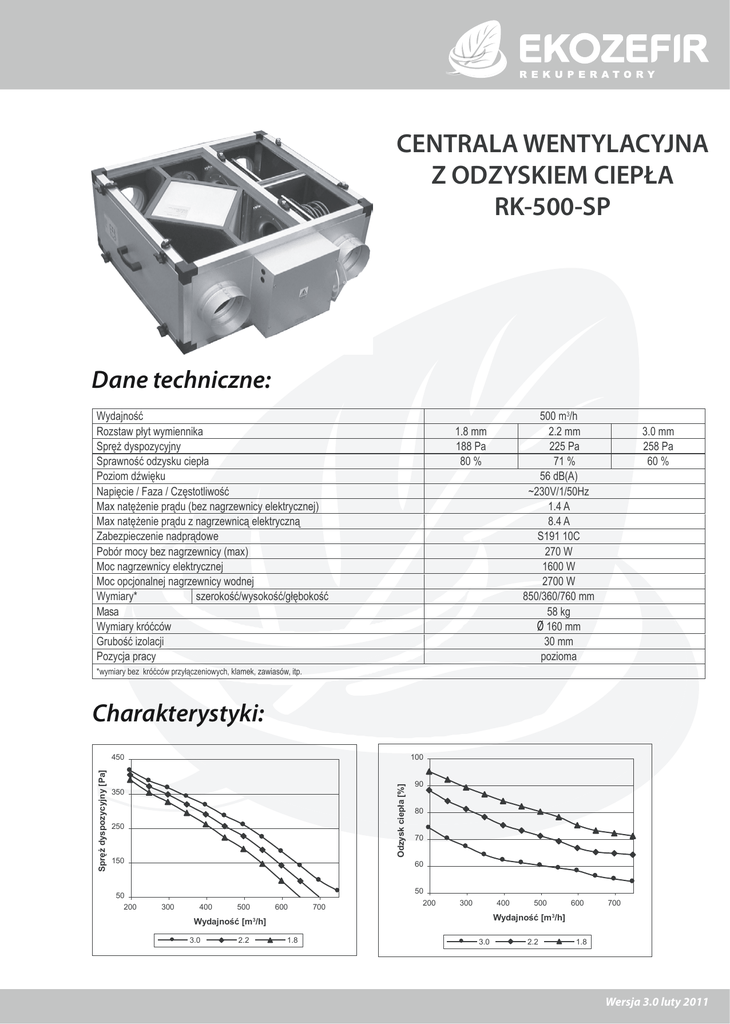 CENTRALA WENTYLACYJNA Z ODZYSKIEM CIEPŁA RK-500-SP Dane techniczne: Wydajność Rozstaw płyt wymiennika Spręż dyspozycyjny Sprawność odzysku ciepła Poziom dźwięku Napięcie / Faza / Częstotliwość Max natężenie prądu (bez nagrzewnicy elektrycznej) Max natężenie prądu z nagrzewnicą elektryczną Zabezpieczenie nadprądowe Pobór mocy bez nagrzewnicy (max) Moc nagrzewnicy elektrycznej Moc opcjonalnej nagrzewnicy wodnej Wymiary* szerokość/wysokość/głębokość Masa Wymiary króćców Grubość izolacji Pozycja pracy 500 m3/h 2.2 mm 225 Pa 71 % 56 dB(A) ~230V/1/50Hz 1.4 A 8.4 A S191 10C 270 W 1600 W 2700 W 850/360/760 mm 58 kg Ø 160 mm 30 mm pozioma 1.8 mm 188 Pa 80 % 3.0 mm 258 Pa 60 % *wymiary bez króćców przyłączeniowych, klamek, zawiasów, itp. Charakterystyki: 100 Odzysk ciepła [%] Spręż dyspozycyjny [Pa] 450 350 250 150 50 200 90 80 70 60 50 300 400 500 600 700 200 300 400 3.0 2.2 500 600 700 Wydajność [m3/h] Wydajność [m3/h] 1.8 3.0 2.2 1.8 Wersja 3.0 luty 2011 Wymiary: 280 28 70 70 40 Ø160 Ø160 Ø160 Ø160 Ø160 850 360 widok z góry 6 Ø1 widok z boku 0 360 6 Ø1 0 6 Ø1 0 850 28 widok z boku Schemat działania: NW W2 ZT TP N2 TR WN WW W3 NE SE TS WK N1 FN FW W1 N1 – powietrze zewnętrzne N2 – nawiew do pomieszczeń W1 – wywiew z pomieszczeń W2 – wywiew na zewnątrz W3 – wywiew z pomieszczeń bez odzysku (obejście wymiennika ciepła - opcja) WN – wentylator nawiewny WW – wentylator wywiewny WK – wymiennik krzyżowy NE – nagrzewnica elektryczna FW – filtr wywiewu FN – filtr nawiewu TR – termostat regulacyjny TP – zabezp. przeciwzamrożeniowe ZT – zabezpieczenie termiczne SE – sterowanie elektryczne TS – taca skroplin z odpływem NW – opcja nagrzewnica wodna Ekoklimax - Projekt Sp. j., 85-055 Bydgoszcz, ul. Podolska 13, tel.: +4852 321 24 53, fax: +4852 349 51 35 www.ekozefir.pl, email: [email protected] Wersja 3.0 luty 2011 W związku ze stałym rozwojem produktów, Ekoklimax-Projekt sp.j. zastrzega sobie prawo do wprowadzania zmiany parametrów i wymiarów bez uprzedniego informowania o tym. 760 70 760 105 70 Ø160 105 Ø160 372 280 Ø160