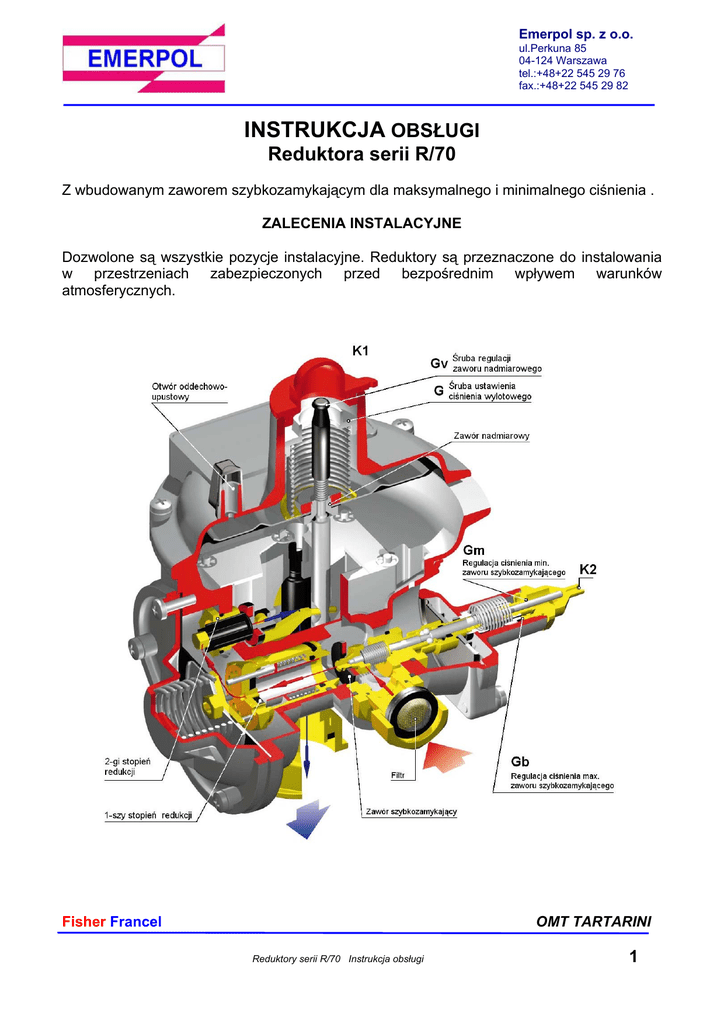 Emerpol sp. z o.o. ul.Perkuna 85 04-124 Warszawa tel.:+48+22 545 29 76 fax.:+48+22 545 29 82 INSTRUKCJA OBSŁUGI Reduktora serii R/70 Z wbudowanym zaworem szybkozamykającym dla maksymalnego i minimalnego ciśnienia . ZALECENIA INSTALACYJNE Dozwolone są wszystkie pozycje instalacyjne. Reduktory są przeznaczone do instalowania w przestrzeniach zabezpieczonych przed bezpośrednim wpływem warunków atmosferycznych. Fisher Francel OMT TARTARINI Reduktory serii R/70 Instrukcja obsługi 1 Emerpol sp. z o.o. ul.Perkuna 85 04-124 Warszawa tel.:+48+22 545 29 76 fax.:+48+22 545 29 82 WPROWADZENIE DO PRACY a) b) c) d) e) f) upewnić się ,że gaz przepływać będzie przez regulator zgodnie ze wskazaniem strzałki na korpusie reduktora oraz , że charakterystyki pracy umieszczone na tabliczce znamionowej są zgodne z wymaganiami eksploatacyjnymi otworzyć zawór odcinający umieszczony po stronie wlotowej reduktora otworzyć częściowo zawór odcinający umieszczony po stronie wylotowej reduktora dla otwarcia zaworu szybkozamykającego w reduktorze odkręcić aluminiowy kapturek K2, przekręcić go o 180stopni wobec reduktora i nakręcić na nagwintowany trzpień . Bardzo powoli i lekko wyciągnąć do czasu ustabilizowania się ciśnienia wylotowego , potem wyciągnąć do oporu otworzyć powoli do pełnego otwarcia zawór odcinający umieszczony po stronie wylotowej reduktora zamontować kapturek K2 w pozycji jak na początku Uwaga: dla ciągłej poprawnej pracy reduktora oraz jego zespołów bezpieczeństwa zaleca się przeprowadzanie okresowej kontroli pracy. Częstotliwość kontroli jest uzależniona od stopnia jakości przepływającego gazu. SPRAWDZANIE i REGULACJA REDUKTORA Zmianę ciśnienia wylotowego reduktora zaleca się przeprowadzać po odłączeniu odbiorników i można osiągnąć poprzez: a) zdjęcie korka plastikowego K1 znajdującego nad membraną główną osłaniającego śruby regulacyjne G ciśnienia po redukcji i Gv ciśnienia zadziałania zaworu wydmuchowego. b) dla podniesienia ciśnienia powoli wkręcać główną śrubę regulacyjną G (klucz 22 rurkowy) c) dla obniżenia ciśnienia powoli wykręcać główną śrubę regulacyjną G. Uwaga zmiany ciśnienia wylotowego przeprowadzać przy niewielkim przepływie gazu. Zmiany nastaw zaworu szybkozamykającego należy przeprowadzać po odłączeniu odbiorników . A) Aby zmienić wielkość nastawy maksymalnego ciśnienia należy : a) zdjąć kapturek aluminiowy K2 osłaniający śruby regulacyjne Gb ciśnienia maksymalnego i Gm ciśnienia minimalnego zaworu szybkozamykającego b) uruchomić reduktor zgodnie procedurą WPROWADZENIE DO PRACY c) dla zmiany ciśnienia maksymalnego wkręcić śrubę regulacyjną Gb (klucz 14 rurkowy) d) zdjąć kapturek K1 i ustawić główną śrubą regulacyjną G ciśnienie ,przy którym powinien zadziałać zawór szybkozamykający(wkręcanie powoduje wzrost ciśnienia zaś wykręcanie powoduje obniżanie ciśnienia). W przypadku braku możliwości uzyskania żądanego ciśnienia można wykorzystać pompkę . Fisher Francel OMT TARTARINI Reduktory serii R/70 Instrukcja obsługi 2 Emerpol sp. z o.o. ul.Perkuna 85 04-124 Warszawa tel.:+48+22 545 29 76 fax.:+48+22 545 29 82 e) wykręcać powoli śrubę regulacyjną Gb (max) zaworu szybkozamykającego(klucz 14 rurkowy) do momentu zadziałania zaworu szybkozamykającego (wyłączenia reduktora) f) wykręcić główną śrubą regulacyjną G dla obniżenia ciśnienia g) ponownie uruchomić reduktor i spowodować wzrost ciśnienia dla sprawdzenia działania zaworu szybkozamykającego. W razie potrzeby dokonać weryfikacji. B) Aby zmienić wielkość nastawy minimalnego ciśnienia należy : a) zdjąć kapturek aluminiowy K2 osłaniający śruby regulacyjne Gb ciśnienia maksymalnego i Gm ciśnienia minimalnego zaworu szybkozamykającego b) uruchomić reduktor zgodnie z procedurą WPROWADZENIE DO PRACY c) dla zmiany ciśnienia minimalnego wykręcić śrubę regulacyjną (klucz 8 rurkowy) d) ustawić główną śrubą regulacyjną G ciśnienie ,przy którym powinien zadziałać zawór szybkozamykający (wkręcanie powoduje wzrost ciśnienia zaś wykręcanie powoduje obniżanie ciśnienia).W przypadku braku możliwości uzyskania żądanego ciśnienia można wykorzystać pompkę. e) wkręcać powoli śrubę regulacyjną Gm (klucz 8 rurkowy) do momentu zadziałania zaworu szybkozamykającego (wyłączenia reduktora) f) wkręcić główną śrubą regulacyjną G dla podniesienia ciśnienia g) ponownie uruchomić reduktor i spowodować spadek ciśnienia dla sprawdzenia działania zaworu szybkozamykającego. W razie potrzeby dokonać weryfikacji. Należy pamiętać o konieczności ustawienia ciśnienia regulowanego po zakończeniu zmian nastaw zaworu szybkozamykającego. W przypadku stosowania pompki należy odłączyć zasilanie reduktora ciśnieniem wlotowym Zmianę nastawy zaworu wydmuchowego można osiągnąć poprzez: a) zdjęcie korka plastikowego K1 znajdującego nad membraną główną osłaniającego śruby regulacyjne G ciśnienia po redukcji i Gv ciśnienia zadziałania zaworu wydmuchowego. b) dla podniesienia wysokości ciśnienia należy wkręcić śrubę regulacyjną Gv (czarny plastikowy trzpień) c) dla obniżenia wysokości ciśnienia należy wykręcić śrubę regulacyjną Gv (czarny plastikowy trzpień) d) spowodować wzrost ciśnienia do wartości zadziałania i przeprowadzić regulację do stwierdzenia zaistnienia wypływu przez zawór wydmuchowy. Fisher Francel OMT TARTARINI Reduktory serii R/70 Instrukcja obsługi 3