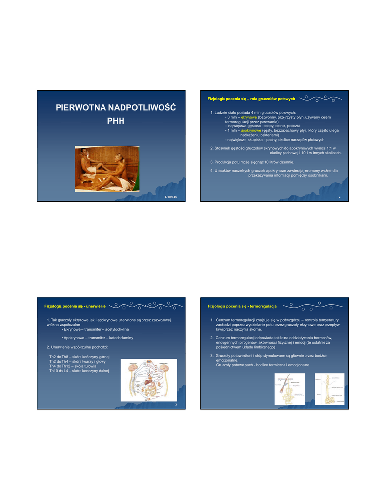 2008-05-08 Fizjologia pocenia się – rola gruczołów potowych PIERWOTNA NADPOTLIWOŚĆ PHH 1. Ludzkie ciało posiada 4 mln gruczołów potowych: • 3 mln – ekrynowe (bezwonny, przejrzysty płyn, używany celem termoregulacji przez parowanie) – największa gęstość – stopy, dłonie, policzki • 1 mln – apokrynowe (gęsty, bezzapachowy płyn, który często ulega nadkażeniu bakteriami) - największe skupiska – pachy, okolice narządów płciowych 2. Stosunek gęstości gruczołów ekrynowych do apokrynowych wynosi 1:1 w okolicy pachowej i 10:1 w innych okolicach. 3. Produkcja potu może sięgnąć 10 litrów dziennie. 4. U ssaków naczelnych gruczoły apokrynowe zawierają feromony ważne dla przekazywania informacji pomiędzy osobnikami. 1/58/116 Fizjologia pocenia się - unerwienie 2 Fizjologia pocenia się - termoregulacja 1. Tak gruczoły ekrynowe jak i apokrynowe unerwione są przez zazwojowej włókna współczulne • Ekrynowe – transmiter – acetylocholina 1. Centrum termoregulacji znajduje się w podwzgórzu – kontrola temperatury zachodzi poprzez wydzielanie potu przez gruczoły ekrynowe oraz przepływ krwi przez naczynia skórne. • Apokrynowe – transmiter – katecholaminy 2. Centrum termoregulacji odpowiada także na oddziaływania hormonów, endogennych pirogenów, aktywności fizycznej i emocji (te ostatnie za pośrednictwem układu limbicznego) 2. Unerwienie współczulne pochodzi: 3. Gruczoły potowe dłoni i stóp stymulowane są głównie przez bodźce emocjonalne. Gruczoły potowe pach - bodźce termiczne i emocjonalne Th2 do Th8 – skóra kończyny górnej Th2 do Th4 – skóra twarzy i głowy Th4 do Th12 – skóra tułowia Th10 do L4 – skóra konczyny dolnej 3 4 1 2008-05-08 Patofizjologia pocenia się w nadpotliwości Fizjologia pocenia się – kontekst ewolucyjny 1. Pocenie się w wyniku pobudzenia emocjonalnego – atawizm – wilgotne dłonie i stopy gwarantują lepszy kontakt z podłożem i gałęziami czy maczugą w czasie walki i ucieczki. 1. Gruczoły potowe nie różnią się morfologicznie ani ilościowo od gruczołów u osób zdrowych. 2. Zwiększony poziom wyjściowej produkcji potu oraz zwiększona reaktywność w wyniku pobudzenia emocjonalnego i termicznego. 2. Uogólnione wydzielanie potu ochładza ciało, gdy spodziewana jest aktywność fizyczna generująca ciepło. 3. Zjawisko nie ma podłoża psychicznego – PHH obserwowane jest u małych psychologiczne y g nie wskazują ją na dzieci, a nawet noworodków. Badania p różnice pomiędzy rysem psychologicznym osób chorych, a osób zdrowych. p y wydzielając y ją feromony y zawiadamiając ją resztę ę stada o 3. Gruczołu apokrynowe niebezpieczeństwie i wzywają na pomoc. 4. Obniżenie progu pobudzenia gruczołu i przesadna jego odpowiedź wynika z nadmiernego pobudzenia współczulnego. 6 5 Nadpotliwość wtórna - leki powodujące nadpotliwość • Przeciwbólowe (celeboxib. fentanyl, ketorolac, metadon, morfina, naproxen, oxycodon, tranmadol) • Antybiotyki i leki przeciwwirusowe Nadpotliwość (hyperhidrosis) (acyklowir, bacytracyna, ceftriaxon, ciprofloksacyna, piperacykina, tazobaktam, prazikwantel, zydowudyna) • Nasercowe i przeciwnadciśnieniowe (digoksyna, enalapril, losartan, metoprolol, sotalol, werapamil) • Endokrynologiczne Pierwotna (idiopatyczna) (kalcytonina, epinefryna, insulina, l-tyroksyna, prednisoon, progestyny, tamoksyfen, testosteron, wazopersyna) Wtórna • Gastroeneterologiczne (mesalazyna, omeprazol, rabeprazol) Ograniczona • Hematologiczne i immunosupresyjne Uogólniona (cyklosporyna, szczepionka p/WZW typu B, tacrolimus, MMF) • Neurologiczne i psychiatryczne (amitryptylina, buprenorfina, karbamazepiny, amfetamina, duloksetyna, fluoksetyna, haloperidol, lewodopa) 7 8 2 2008-05-08 Nadpotliwość wtórna - Choroby i stany przebiegające z nadpotliwością Nadpotliwość wtórna - Przyczyny nadpotliwości miejscowej • Ostre choroby gorączkowe • Ostre uszkodzenie rdzenia – utrata potliwości poniżej uszkodzenia, ale także nadpotliwość miesiące lub lata po uszkodzeniu. • Uszkodzenie rdzenia na poziomie Th6 lub powyżej – dysrefleksja współczulna (dolegliwości bólowe związane z wypełnieniem jelit lub pęcherza czy drażnieniem skóry, ponadto nadpotliwość twarzy i kończyn górnych, bóle głowy i czerwienienie się twarzy) • Hypotonia ortostatyczna związana z uszkodzeniem odcinka szyjnego rdzenia – nadpotliwość d tli ść twarzy, t szyii i górnej ó j części ś i ttułowia. ł i • Pourazowa syryngomielia. • Alkoholizm • Cukrzyca • Dna moczanowa • Niewydolność serca • Nadczynność tarczycy • Chłoniak • Menopauza • Otyłość • Choroba Parkinsona • Ciąża • Reumatoidalne zapalenie stawów • Ucisk przez żebra szyjne (nadpotliwość twarzy, szyi, ramion) • Guz wewnątrzklatkowy (naciek na pień współczulny) • Nadpotliwość kompensacyjna jako odpowiedź na anhydrozę (brak pocenia się): • Guzy nadnerczy (pheochromocytoma, guzy wirylizujące) • po uszkodzeniu pania współczulnego, • Zespoły paraneoplazmatyczne • po sympatektomii, • Karcinoid • w wyniku neuropatii cukrzycowej. 9 10 Rozpoznanie Czynniki genetyczne w PHH PHH jest chorobą o charakterze genetycznym: autosomalnym dominującym. 1. Dane z wywiadu 1. 1% - 2.8% występowania choroby w społeczeństwie. • nadpotliwość ograniczona do twarzy, dłoni, pach lub stóp; 2. 5% występowania alleli zawierających zmieniony gen. • choroba pojawiła się w dzieciństwie lub w wieku dojrzewania 3. 25% penetracja choroby. • występowanie rodzinne • objawy stymulowane termicznie i emocjonalnie, zmniejszają się pod wpływem alkoholu 4. Nie wykazano, który konkretnie gen odpowiedzialny jest za chorobę. • współistnienie drżenia dłoni (tremor) 5. 62-75% p pacjentów j wskazało osobyy chore w rodzinie. • znaczne upośledzenie jakości życia 6. Choroba pojawia się z reguły w dzieciństwie