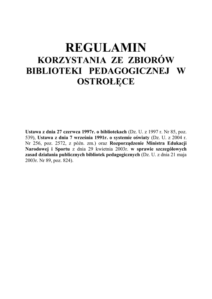 REGULAMIN KORZYSTANIA ZE ZBIORÓW BIBLIOTEKI PEDAGOGICZNEJ W OSTROŁĘCE Ustawa z dnia 27 czerwca 1997r. o bibliotekach (Dz. U. z 1997 r. Nr 85, poz. 539), Ustawa z dnia 7 września 1991r. o systemie oświaty (Dz. U. z 2004 r. Nr 256, poz. 2572, z późn. zm.) oraz Rozporządzenie Ministra Edukacji Narodowej i Sportu z dnia 29 kwietnia 2003r. w sprawie szczegółowych zasad działania publicznych bibliotek pedagogicznych (Dz. U. z dnia 21 maja 2003r. Nr 89, poz. 824). I. POSTANOWIENIA WSTĘPNE 1. Regulamin korzystania ze zbiorów biblioteki określa sposób i warunki korzystania ze zbiorów stanowiących własność biblioteki oraz uzyskanych drogą wypożyczeń międzybibliotecznych. 2. Biblioteka obejmuje zasięgiem swej działalności obszar miasta i powiatów województwa mazowieckiego: ostrołęckiego, makowskiego, ostrowskiego, przasnyskiego i wyszkowskiego. 3. Czytelnicy mogą korzystać z biblioteki w dniach i godzinach podanych do ogólnej wiadomości. II. PRAWA I WARUNKI KORZYSTANIA 1. Zbiory Biblioteki podlegają przepisom o ochronie własności społecznej. Korzystający ze zbiorów mają obowiązek szanowania udostępnionych im materiałów bibliotecznych. Są odpowiedzialni za wszystkie straty wynikłe z ich winy, a regulamin wypożyczeń jest dokumentem prawnym w dochodzeniu roszczeń Biblioteki w stosunku do czytelnika. 2. Prawo do korzystania z Wypożyczalni mają wymienione niżej osoby legitymujące się ważnym dokumentem zameldowania lub zatrudnienia na terenie powiatów województwa mazowieckiego: ostrołęckiego, ostrowskiego, makowskiego, przasnyskiego i wyszkowskiego. a) nauczyciele i wychowawcy, pracownicy naukowi, pracownicy oświaty, kultury, osoby przygotowujące się do zawodu nauczycielskiego oraz osoby prowadzące działalność pedagogiczną; b) pracownicy instytucji, których działalność wiąże się z zagadnieniami oświaty i wychowania, kultury, pracownicy samorządów terytorialnych, oficerowie WP, policji, straży; c) studenci; d) uczniowie szkół ponadgimnazjalnych; e) inne osoby po uzyskaniu zgody dyrektora, a w przypadku placówek filialnych – zgody kierownika filii. 3. Czytelnik jest zobowiązany zawiadomić bibliotekę o każdorazowej zmianie swego adresu, nazwiska, miejsca pracy, nr telefonu i adresu e-mail. 4. Przy zapisie zainteresowany ma obowiązek: a) okazać dowód osobisty i/lub aktualną legitymację służbową (studencką, szkolną); b) zapoznać się z regulaminem przyjmując tym samym zobowiązanie do przestrzegania jego zasad i wyrażenie zgody na zbieranie i przetwarzanie swoich danych osobowych. 5. Osoby nieletnie zapisywane są w obecności rodzica lub opiekuna prawnego. III. WYPOŻYCZENIA ZBIORÓW 1. Ilość wypożyczonych książek jest zależna od statusu czytelnika. Wymienieni poniżej czytelnicy mogą wypożyczyć jednorazowo: nauczyciele i pracownicy oświaty – 8 książek na 4 tygodnie; studenci – 8 książek na 4 tygodnie; uczniowie – 5 książek na 4 tygodnie; inni czytelnicy – 5 książek na 4 tygodnie. 2. Podstawę do wypożyczenia książek stanowi karta biblioteczna lub dokument tożsamości. Za wydanie karty lub jej duplikatu pobierana jest opłata (patrz: Aneks). 3. Uszkodzenie lub zagubienie karty bibliotecznej należy niezwłocznie zgłosić dyżurującemu bibliotekarzowi. 4. Czytelnik wypożycza książki na swoją kartę osobiście. 5. Czytelnik wypożyczając książki zobowiązany jest udostępnić bibliotekarzowi swoją kartę biblioteczną, biorąc tym samym pełną odpowiedzialność za terminowy zwrot i za całość dzieła. 6. Termin zwrotu książek może być przedłużony. Czytelnik może to zrobić osobiście, telefonicznie lub drogą internetową. Ostateczną decyzję o przedłużeniu podejmuje bibliotekarz. Przedłużeniu nie podlegają książki zarezerwowane przez innych czytelników. 7. Termin zwrotu książek może być przesunięty dwukrotnie na okres nie dłuższy niż 56 dni. 8. W szczególnie uzasadnionych przypadkach Wypożyczalnia ma prawo żądać zwrotu książek przed upływem 4 tygodni, nawet w kilka dni od daty wypożyczenia. 9. Czytelnik ma możliwość rezerwacji książek do wypożyczenia (osobiście drogą internetową). 10. Czytelnik biblioteki posiadający kartę biblioteczną ma możliwość przeszukiwania za pomocą Internetu komputerowej bazy zbiorów znajdujących się w bibliotece, rezerwowania ich oraz śledzenia stanu swojego konta i historii wypożyczeń poprzez katalog OPAC na stronie www.bp.ostroleka.pl. 11. Książki oznaczone w katalogach symbolem p udostępnia się tylko w Czytelni. IV. PRZETRZYMYWANIE ZBIORÓW 1. Czytelnik jest zobowiązany do terminowego zwrotu wypożyczonych książek. 2. Nieterminowy zwrot wypożyczonych materiałów bibliotecznych pociąga za sobą następujące konsekwencje: a) indywidualne upomnienie telefoniczne lub na piśmie, którego koszt ponosi czytelnik (cena druku i znaczka wg aktualnej taryfy Poczty Polskiej); b) zastosowanie sankcji finansowych przez obciążenie zalegającego ze zwrotem materiałów bibliotecznych; c) czasowe lub trwałe pozbawienie prawa korzystania z Wypożyczalni – blokada konta czytelnika. 3. Za nieterminowy zwrot książek pobierane są opłaty (patrz: Aneks). 4. Opłaty za przetrzymywanie książek podlegają umorzeniu tylko w wyjątkowych sytuacjach. Decyzję w tej sprawie podejmuje Dyrektor placówki lub kierownik filii. 5. Kary pieniężne pobierane od czytelników są rejestrowane w systemie bibliotecznym PROLIB i odprowadzane na konto biblioteki. 6. Czytelnik otrzymuje pokwitowanie na wpłacone sumy. 7. Nie wypożycza się książek dłużnikom Działu Zbiorów Specjalnych i filii Biblioteki Pedagogicznej - blokada konta czytelnika. 8. Wypożyczone książki należy chronić przed zniszczeniem, zagubieniem i kradzieżą. 9. W razie zagubienia, uszkodzenia lub zniszczenia książki czytelnik zobowiązany jest: a) zwrócić inny egzemplarz tego samego dzieła (to samo lub nowsze wydanie);