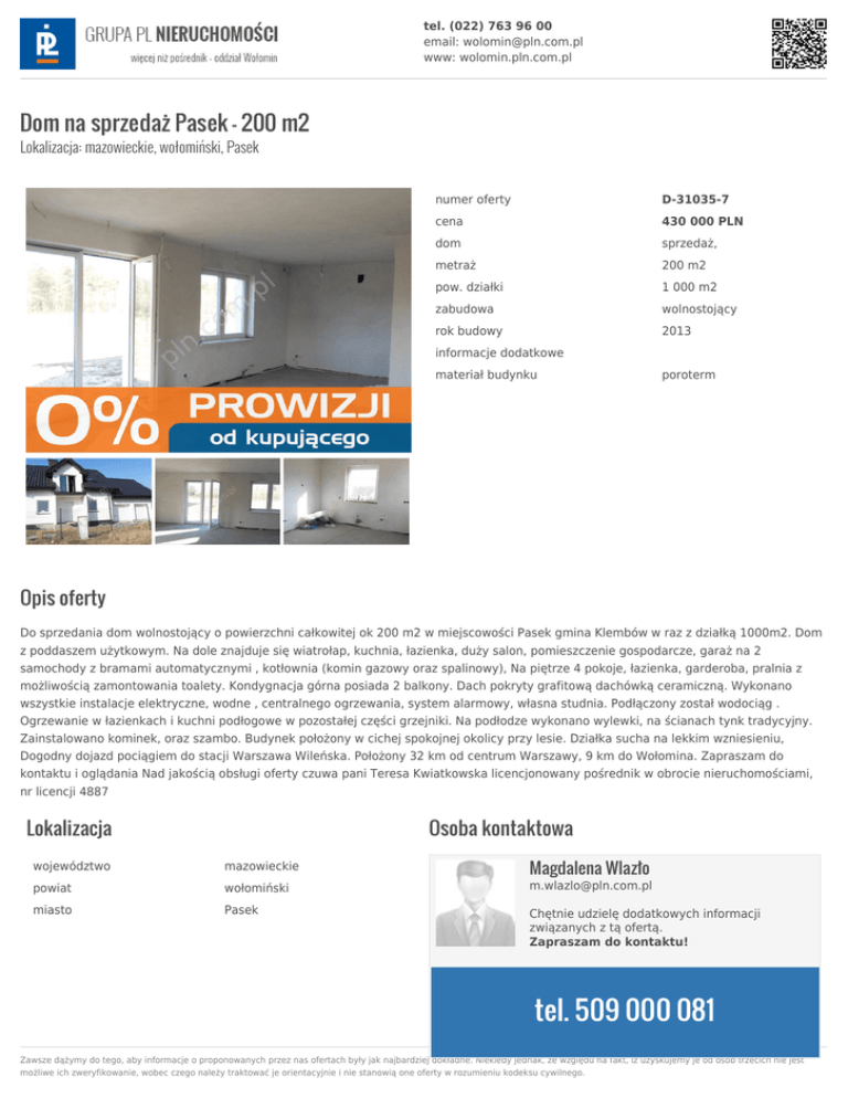 tel. (022) 763 96 00 email: [email protected] www: wolomin.pln.com.pl Dom na sprzedaż Pasek - 200 m2 Lokalizacja: mazowieckie, wołomiński, Pasek numer oferty D-31035-7 cena 430 000 PLN dom sprzedaż, metraż 200 m2 pow. działki 1 000 m2 zabudowa wolnostojący rok budowy 2013 informacje dodatkowe materiał budynku poroterm Opis oferty Do sprzedania dom wolnostojący o powierzchni całkowitej ok 200 m2 w miejscowości Pasek gmina Klembów w raz z działką 1000m2. Dom z poddaszem użytkowym. Na dole znajduje się wiatrołap, kuchnia, łazienka, duży salon, pomieszczenie gospodarcze, garaż na 2 samochody z bramami automatycznymi , kotłownia (komin gazowy oraz spalinowy), Na piętrze 4 pokoje, łazienka, garderoba, pralnia z możliwością zamontowania toalety. Kondygnacja górna posiada 2 balkony. Dach pokryty grafitową dachówką ceramiczną. Wykonano wszystkie instalacje elektryczne, wodne , centralnego ogrzewania, system alarmowy, własna studnia. Podłączony został wodociąg . Ogrzewanie w łazienkach i kuchni podłogowe w pozostałej części grzejniki. Na podłodze wykonano wylewki, na ścianach tynk tradycyjny. Zainstalowano kominek, oraz szambo. Budynek położony w cichej spokojnej okolicy przy lesie. Działka sucha na lekkim wzniesieniu, Dogodny dojazd pociągiem do stacji Warszawa Wileńska. Położony 32 km od centrum Warszawy, 9 km do Wołomina. Zapraszam do kontaktu i oglądania Nad jakością obsługi oferty czuwa pani Teresa Kwiatkowska licencjonowany pośrednik w obrocie nieruchomościami, nr licencji 4887 Lokalizacja Osoba kontaktowa Magdalena Wlazło województwo mazowieckie powiat wołomiński [email protected] miasto Pasek Chętnie udzielę dodatkowych informacji związanych z tą ofertą. Zapraszam do kontaktu! tel. 509 000 081 Zawsze dążymy do tego, aby informacje o proponowanych przez nas ofertach były jak najbardziej dokładne. Niekiedy jednak, ze względu na fakt, iż uzyskujemy je od osób trzecich nie jest możliwe ich zweryfikowanie, wobec czego należy traktować je orientacyjnie i nie stanowią one oferty w rozumieniu kodeksu cywilnego.