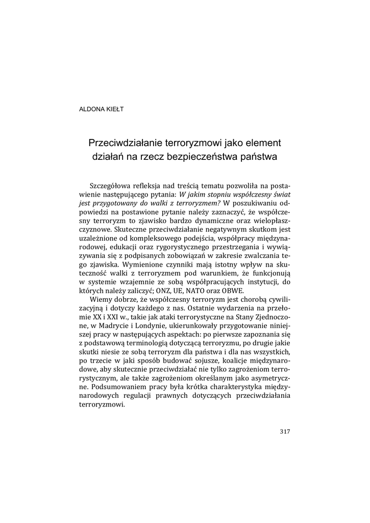 ALDONA KIEŁT Przeciwdziałanie terroryzmowi jako element działań na rzecz bezpieczeństwa państwa Szczegółowa refleksja nad treścią tematu pozwoliła na postawienie następującego pytania: W jakim stopniu współczesny świat jest przygotowany do walki z terroryzmem? W poszukiwaniu odpowiedzi na postawione pytanie należy zaznaczyć, że współczesny terroryzm to zjawisko bardzo dynamiczne oraz wielopłaszczyznowe. Skuteczne przeciwdziałanie negatywnym skutkom jest uzależnione od kompleksowego podejścia, współpracy międzynarodowej, edukacji oraz rygorystycznego przestrzegania i wywiązywania się z podpisanych zobowiązań w zakresie zwalczania tego zjawiska. Wymienione czynniki mają istotny wpływ na skuteczność walki z terroryzmem pod warunkiem, że funkcjonują w systemie wzajemnie ze sobą współpracujących instytucji, do których należy zaliczyć; ONZ, UE, NATO oraz OBWE. Wiemy dobrze, że współczesny terroryzm jest chorobą cywilizacyjną i dotyczy każdego z nas. Ostatnie wydarzenia na przełomie XX i XXI w., takie jak ataki terrorystyczne na Stany Zjednoczone, w Madrycie i Londynie, ukierunkowały przygotowanie niniejszej pracy w następujących aspektach: po pierwsze zapoznania się z podstawową terminologią dotyczącą terroryzmu, po drugie jakie skutki niesie ze sobą terroryzm dla państwa i dla nas wszystkich, po trzecie w jaki sposób budować sojusze, koalicje międzynarodowe, aby skutecznie przeciwdziałać nie tylko zagrożeniom terrorystycznym, ale także zagrożeniom określanym jako asymetryczne. Podsumowaniem pracy była krótka charakterystyka międzynarodowych regulacji prawnych dotyczących przeciwdziałania terroryzmowi. 317 Aldona Kiełt Podstawowe zagadnienia dotyczące terroryzmu Terroryzm jest jednym z największych problemów współczesnego świata. Aby skutecznie zwalczać to zjawisko, niezbędna jest ocena historyczna rozwoju tego wyzwania, poznanie celów działalności terrorystycznej oraz metod i środków do ich osiągnięcia. Działania terrorystyczne są obecne w historii ludzkości od starożytności, jednak dopiero na przełomie XX i XXI wieku stały się kwestią globalnie istotną i wymagającą podjęcia radykalnych działań w skali międzynarodowej. Konieczne stało się wypracowanie skutecznej strategii zapobiegania zwalczania terroryzmu. Według specjalistów w tej dziedzinie ponad połowa państw na świecie doświadczyła go w mniejszym bądź większym stopniu. Świadczą o tym chociażby nieustanne próby stworzenia jednolitej definicji na gruncie prawa międzynarodowego. Określenie „terroryzm” wywodzi się od łacińskiego słowa „terror”, co oznacza „strach, straszną rzecz, wieść”, a etymologicznie pochodzi od czasownika „terrere” – przerażać. Do języków nowożytnych słowo „terror” weszło za pośrednictwem francuskiego rzeczownika „terreur”. W języku polskim określenie „terror” posiada dwa znaczenia: terror jako stosowanie przemocy, gwałtu, okrucieństwa w celu zastraszenia, zniszczenia przeciwnika, a także sam skutek takich zachowań w postaci strachu, grozy, trwogi lub zastraszenia1. Obecnie w literaturze funkcjonuje bardzo wiele definicji dotyczących zjawiska terroryzmu i w zależności od zainteresowań, naukowcy starają się ukierunkowywać je na własny użytek. Mimo tak dużego zainteresowania tą problematyką nie ustalono jednomyślnej, ani powszechnie obowiązującej definicji. Wieloznaczność tych pojęć w sposób zrozumiały nie pozwala na właściwą ich interpretację. Największą liczbę definicji terroryzmu opisują przedstawiciele nauki na podstawie wyników prowadzonych prac badawczych. W grupie tej wyróżnić można zarówno bardzo obszerne sformułowania, które tworzą rozbudowane opisy zjawiska, jak K. Wiak, Prawnokarne środki przeciwdziałania terroryzmowi, Lublin 2009, s. 17. 1 318 Przeciwdziałanie terroryzmowi jako element działań na rzecz bezpieczeństwa… i krótkie, często w zwięzłym jednym zdaniu, wskazujące na najważniejsze jego cechy. W sposób zwięzły terroryzm definiowany jest jako „celowe użycie lub groźba użycia przemocy dla wywołania strachu i uległego zachowania u ofiary lub u publiczności” lub jako „zamierzone wytworzenie wielkiego strachu przez ludzi w celu osiągnięcia lub utrzymania kontroli nad innymi ludźmi”. Terroryzm, wykorzystując najnowocześniejsze osiągnięcia techniczne, wpływa zarówno na poziom bezpieczeństwa lokalnego jak i globalnego. Taka forma przemocy wprowadza do stosunków międzynarodowych nowe zjawiska zagrożeń określane, jako asymetryczne. Zagrożenia asymetryczne są kreowane w większości przez podmioty inne niż państwa i dysponujące znacznie mniejszym niż państwa potencjałami. Polegają one na precyzyjnym zaplanowaniu i zorganizowanym działaniu grup, organizacji mających na celu wymuszenie od władz państwowych lub społeczeństw ustępstw lub zaniechania określonego działania, najczęściej ze szkodą dla innych. Ataki terrorystyczne na Stany Zjednoczone, zamachy w Madrycie i Londynie doprowadziły do zmiany podejścia do sprawy terroryzmu międzynarodowego. Ataki i zamachy terrorystyczne uświadomiły, że słowo terroryzm nabrało nowego znaczenia zwłaszcza w wydaniu fundamentalistów islamskich, którzy są szkoleni i przygotowywani do wykonania każdego zadania2. Akt terrorystyczny dla większości kojarzy się z użyciem przemocy, która jest od dawnych czasów zasadniczym elementem ludzkiego działania. Współczesne czasy są również naznaczone tym zjawiskiem, lecz za sprawą skali wykorzystywania nowych środków przemocy działania terrorystyczne wyróżniają się dużo większym zasięgiem. Skala i rozmiar tego zjawiska na początku XXI wieku stała się zagrożeniem o wymiarze globalnym i zyskała ponadnarodowy charakter. Współczesne organizacje terrorystyczne działają na wszystkich kontynentach i pozyskują zwolenników spośród