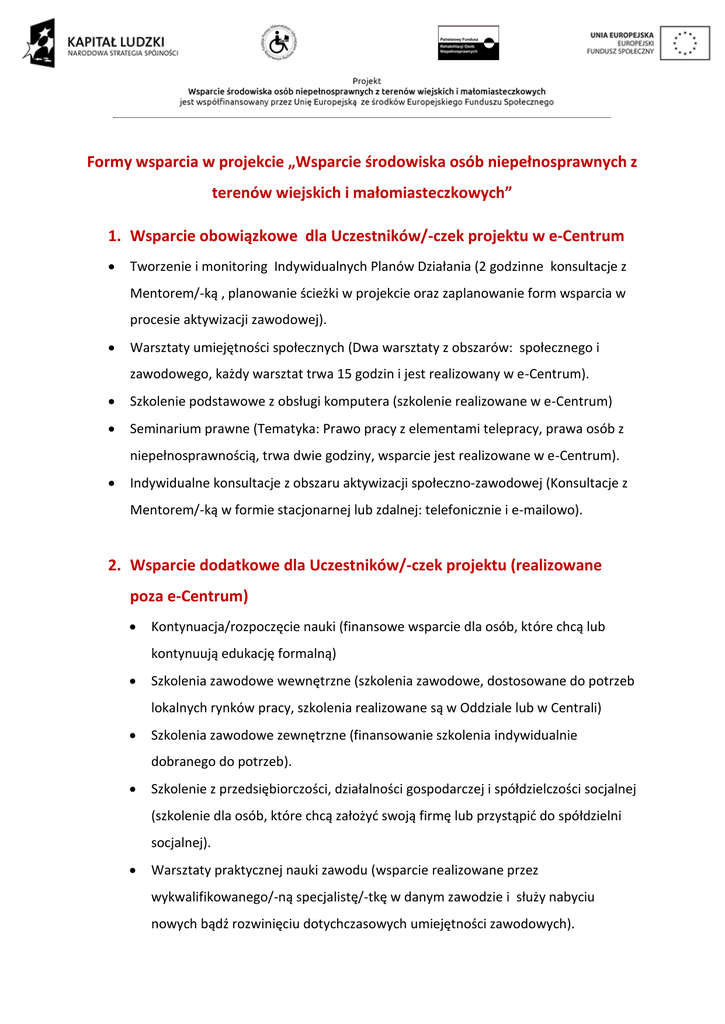Formy wsparcia w projekcie „Wsparcie środowiska osób niepełnosprawnych z terenów wiejskich i małomiasteczkowych” 1. Wsparcie obowiązkowe dla Uczestników/-czek projektu w e-Centrum Tworzenie i monitoring Indywidualnych Planów Działania (2 godzinne konsultacje z Mentorem/-ką , planowanie ścieżki w projekcie oraz zaplanowanie form wsparcia w procesie aktywizacji zawodowej). Warsztaty umiejętności społecznych (Dwa warsztaty z obszarów: społecznego i zawodowego, każdy warsztat trwa 15 godzin i jest realizowany w e-Centrum). Szkolenie podstawowe z obsługi komputera (szkolenie realizowane w e-Centrum) Seminarium prawne (Tematyka: Prawo pracy z elementami telepracy, prawa osób z niepełnosprawnością, trwa dwie godziny, wsparcie jest realizowane w e-Centrum). Indywidualne konsultacje z obszaru aktywizacji społeczno-zawodowej (Konsultacje z Mentorem/-ką w formie stacjonarnej lub zdalnej: telefonicznie i e-mailowo). 2. Wsparcie dodatkowe dla Uczestników/-czek projektu (realizowane poza e-Centrum) Kontynuacja/rozpoczęcie nauki (finansowe wsparcie dla osób, które chcą lub kontynuują edukację formalną) Szkolenia zawodowe wewnętrzne (szkolenia zawodowe, dostosowane do potrzeb lokalnych rynków pracy, szkolenia realizowane są w Oddziale lub w Centrali) Szkolenia zawodowe zewnętrzne (finansowanie szkolenia indywidualnie dobranego do potrzeb). Szkolenie z przedsiębiorczości, działalności gospodarczej i spółdzielczości socjalnej (szkolenie dla osób, które chcą założyć swoją firmę lub przystąpić do spółdzielni socjalnej). Warsztaty praktycznej nauki zawodu (wsparcie realizowane przez wykwalifikowanego/-ną specjalistę/-tkę w danym zawodzie i służy nabyciu nowych bądź rozwinięciu dotychczasowych umiejętności zawodowych). Pośrednictwo pracy (wyszukanie ofert pracy, staży lub praktyki pod indywidualne potrzeby Uczestników/-czki Projektu). Praktyki zawodowe (praktyka w miejscu pracy, trwa 2 tygodnie). Staż rehabilitacyjny (zdobycie praktycznych umiejętności przez wykonywanie zadań w miejscu pracy, trwa średnio 3 miesiące – finansowanie stypendium stażowego dla Uczestników/-czek Projektu). Zatrudnienie wspomagane (wsparcie w poszukiwaniu pracy oraz we wdrożeniu na stanowisko realizowane przez Trenera/-kę Pracy). Dodatkową formą wsparcia dla e-Centrum są Integracyjne wyjazdowe warsztaty aktywizacji społeczno- zawodowej. Wyjazd jest przyznawany dla e-Centrum, w wyniku konkursu dla e-Centrów. 3. Wsparcie dla osób z otoczenia niepełnosprawnych uczestników/-czek projektu Warsztat psychologiczno-prawny dla rodzin i opiekunów. Jest obowiązkowa forma wsparcia, która jest realizowana w e-Centrum (śr. 5 godzin). Udział wybranych osób z otoczenia w Integracyjnych wyjazdowych warsztatach aktywizacji społeczno-zawodowej